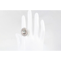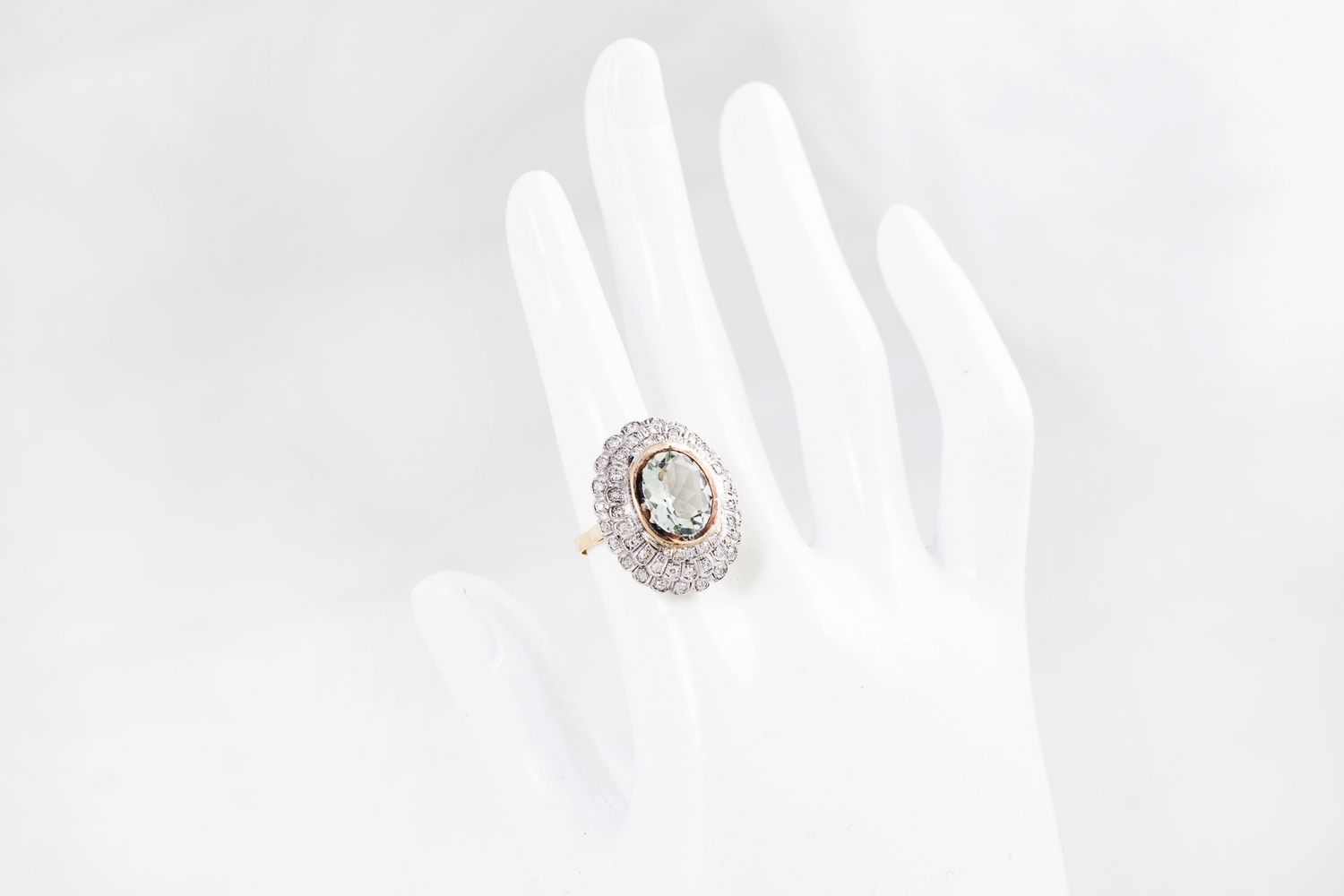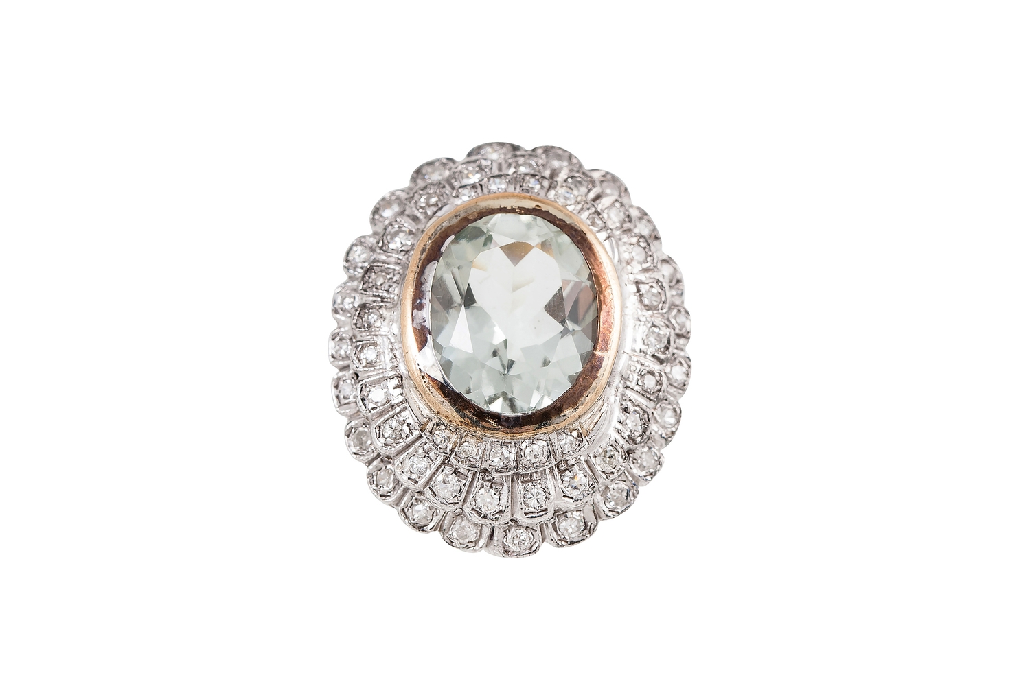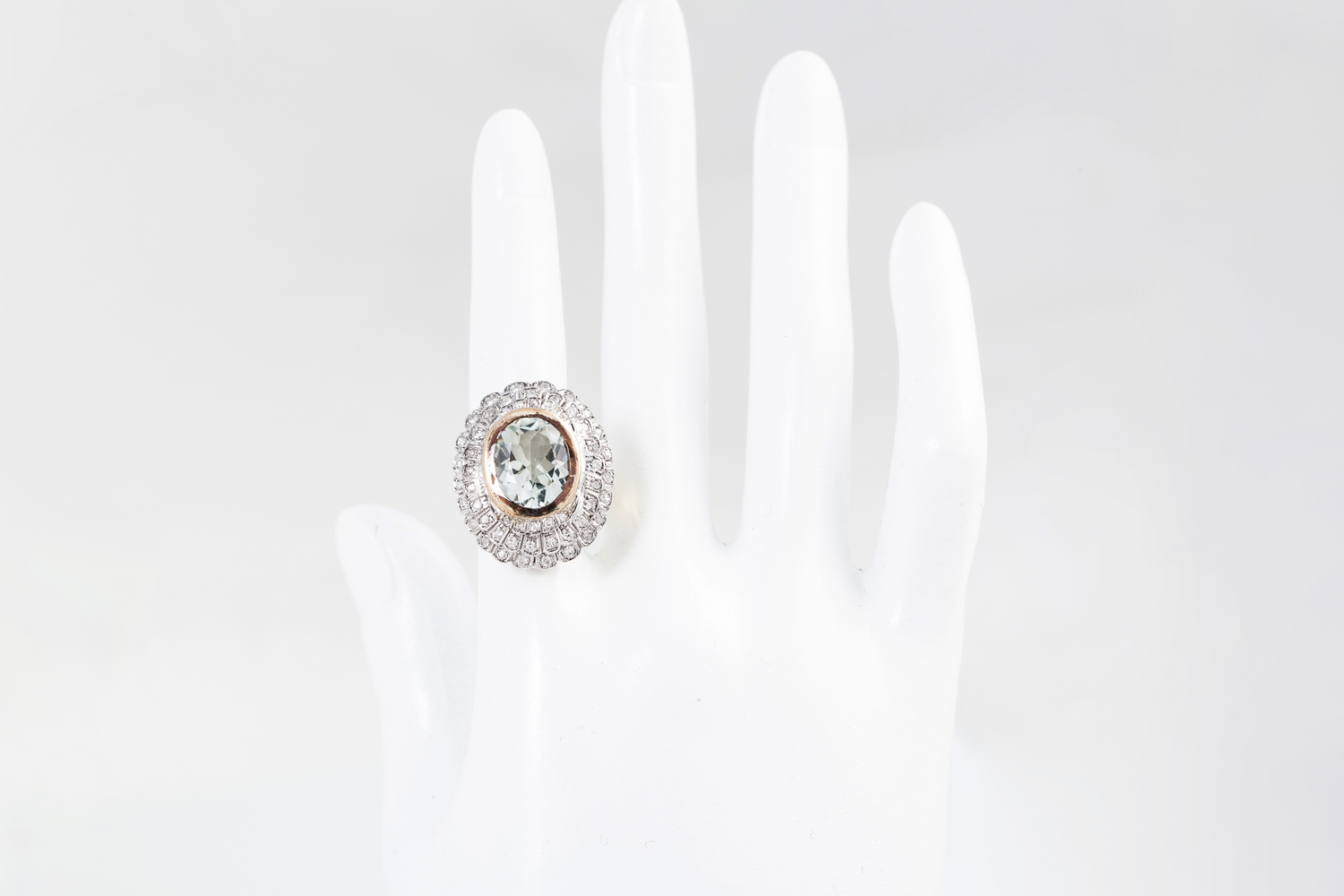 A DIAMOND AND AQUAMARINE CLUSTER RING, the oval aquamarine to a two rowed circular diamond surround. Estimated; weight of diamonds; 0.70 ct, size L - M