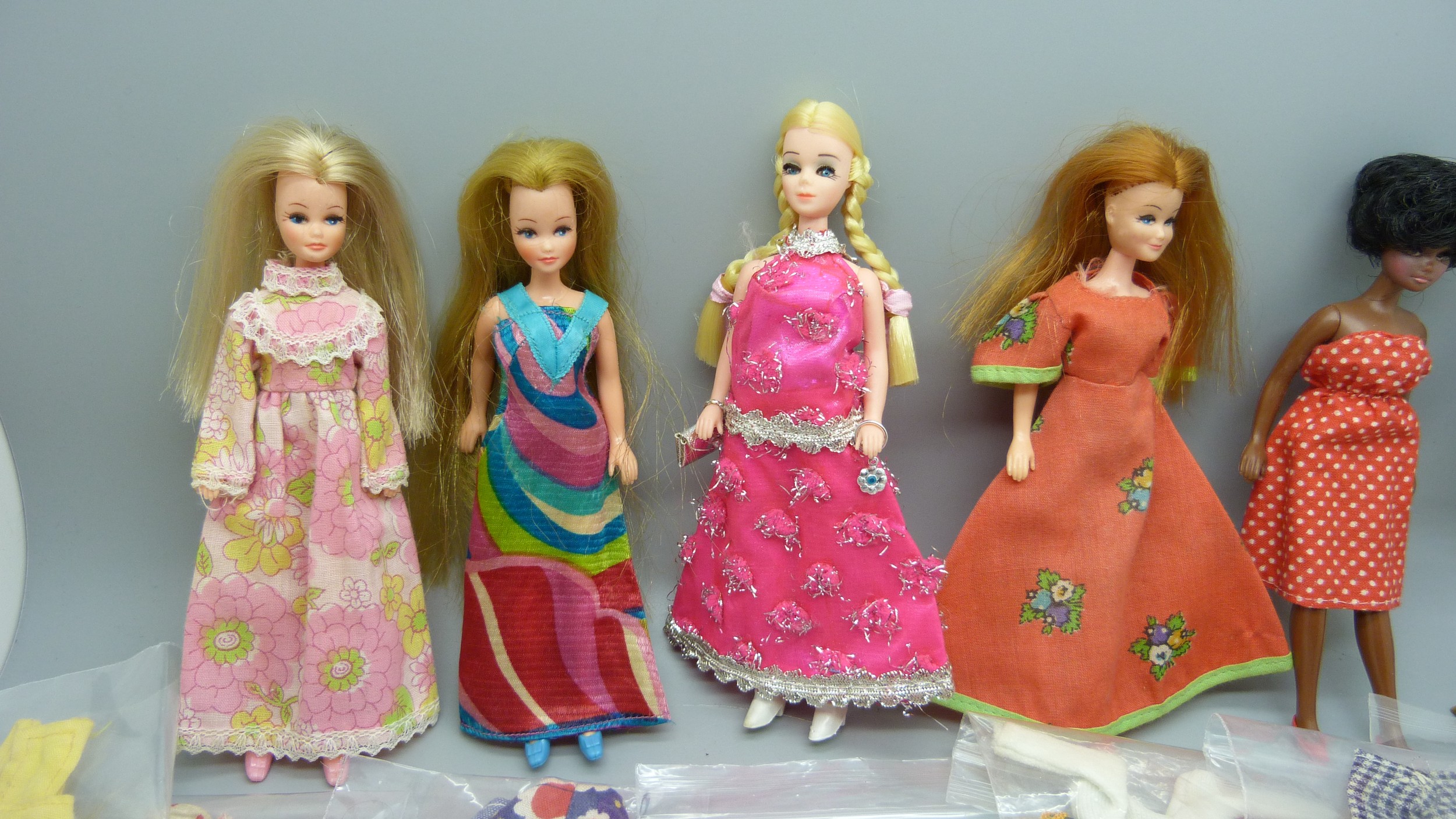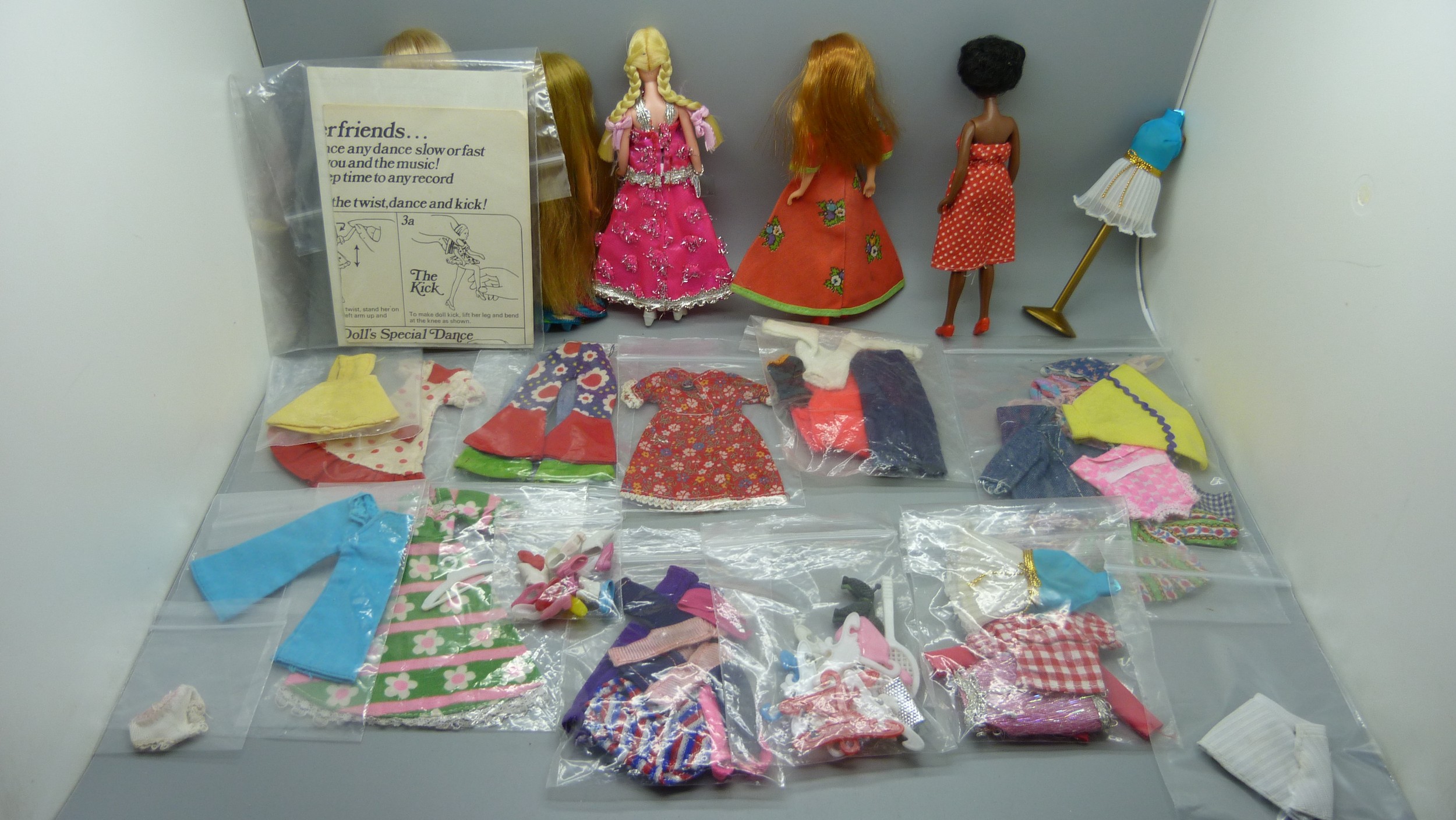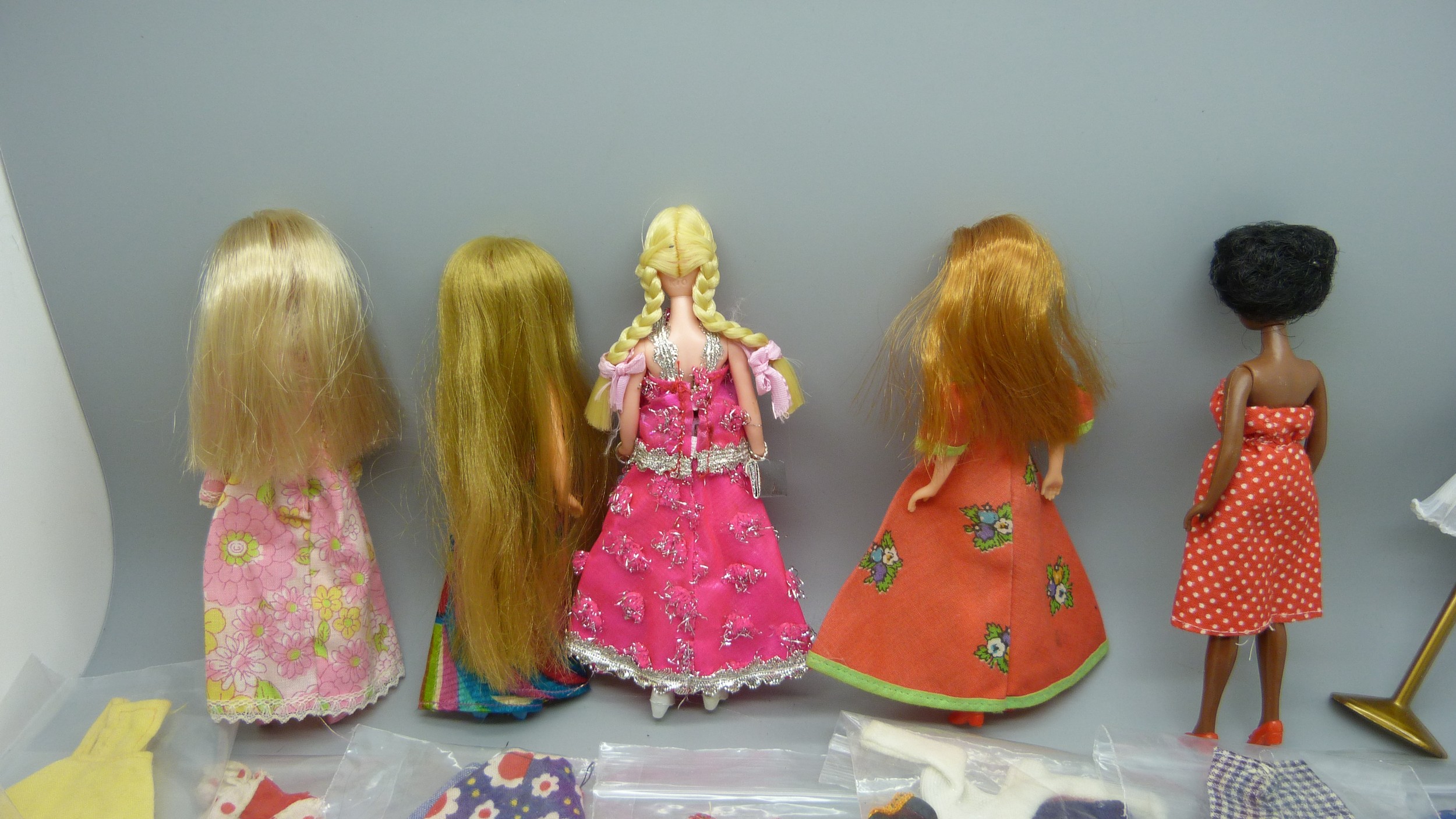 Pippa Dolls:- Princess Pippa with ankle length hair, Britt, Mandy, Tammie and Dinah (Dawn model) with selection of Pippa clothes, shoes and accessories