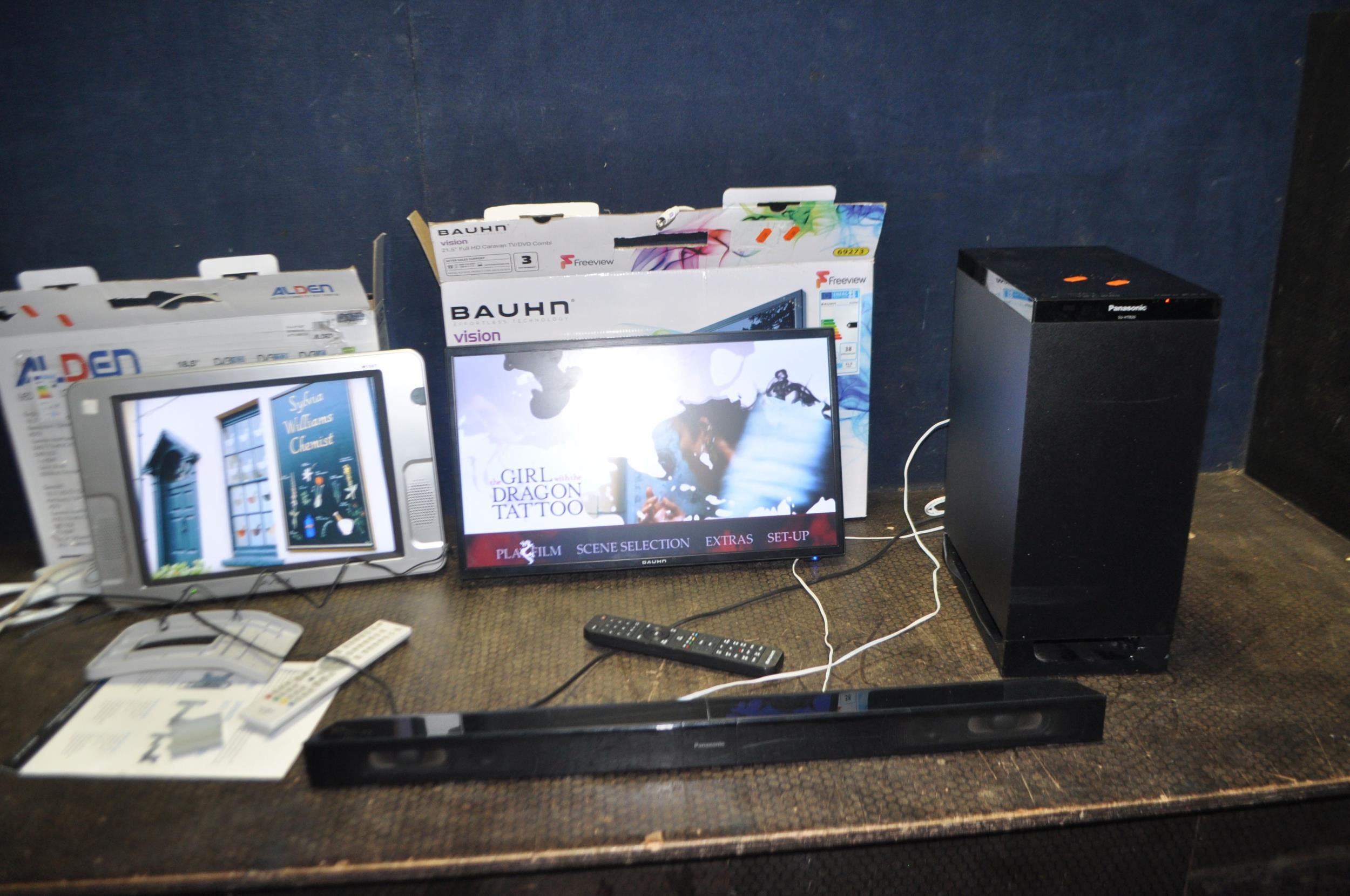 AN AVTEX 15in CARAVAN TV WITH POWER SUPPLY AND REMOTE, a Bauhn TV/DVD combi with power supply and remote and a Panasonic home theatre system with remote (all PAT pass and working) (6)