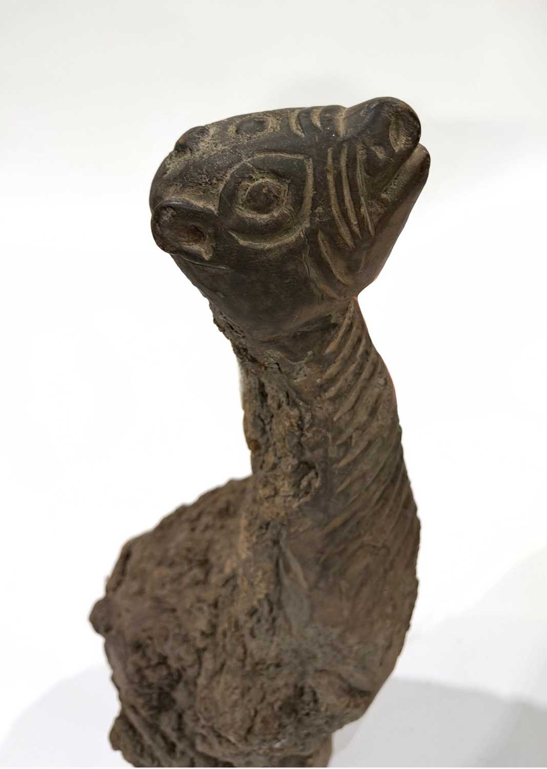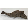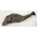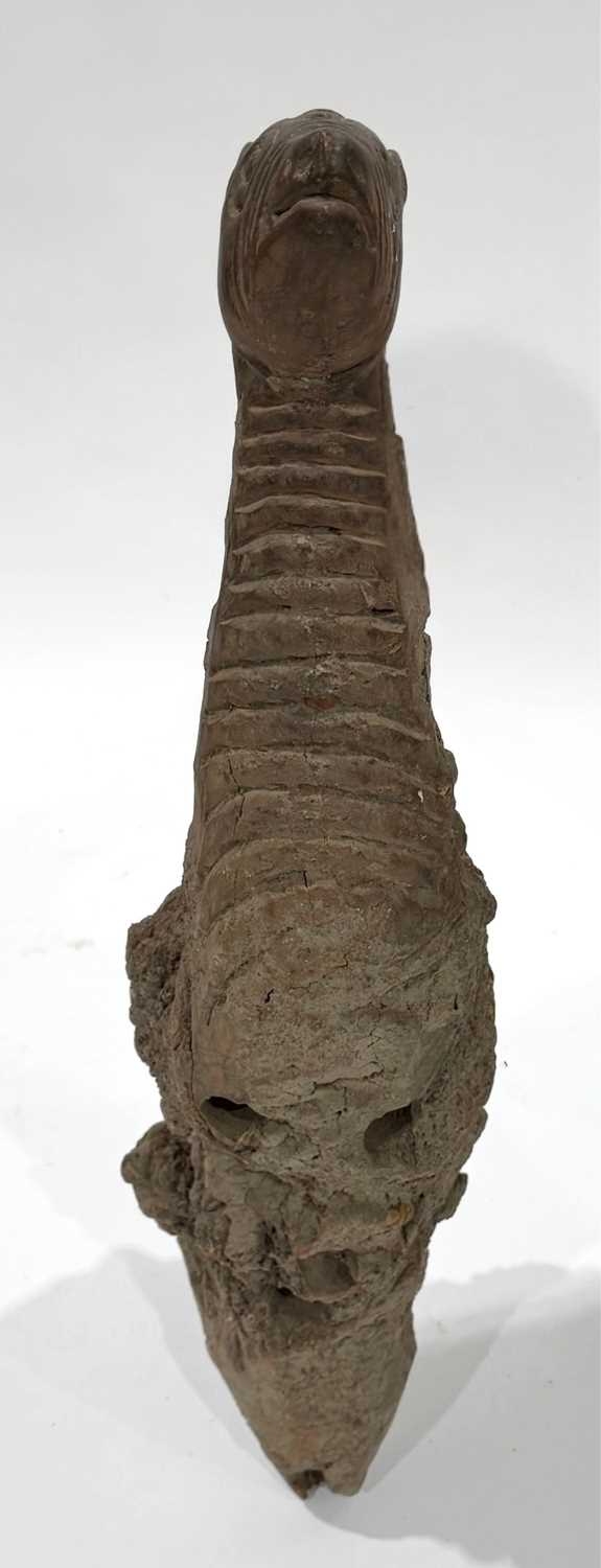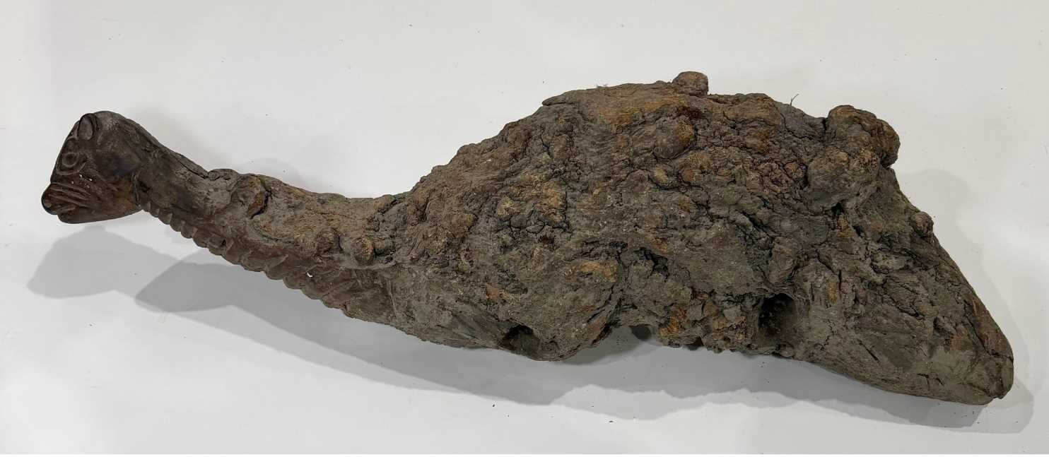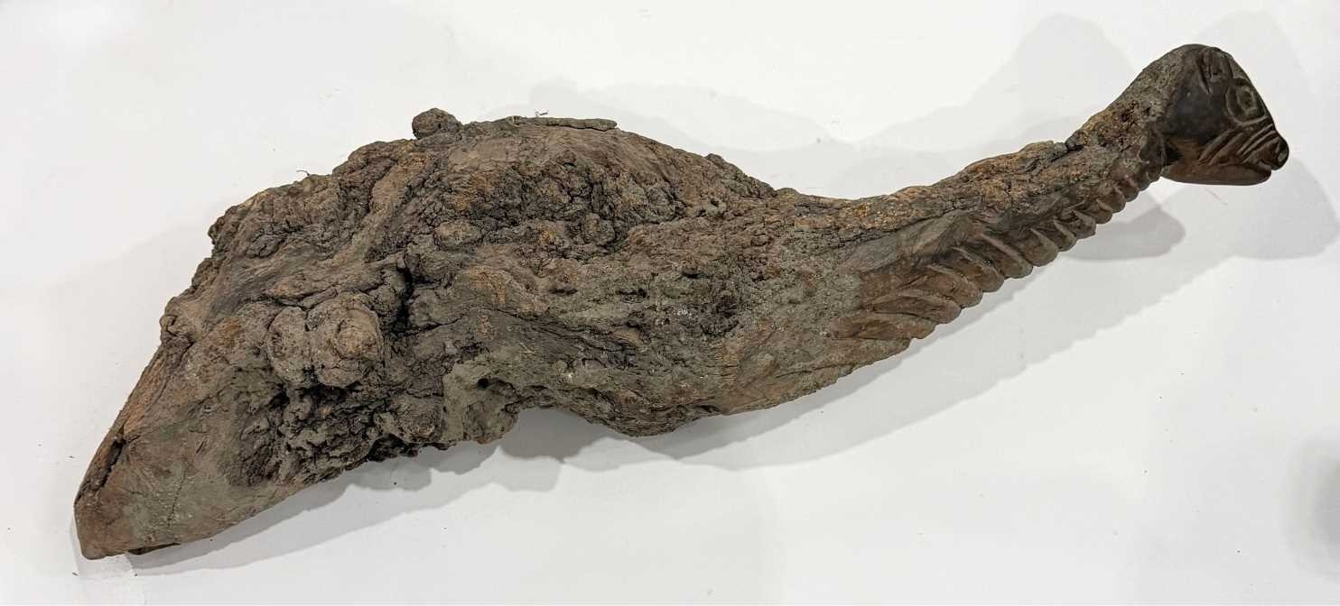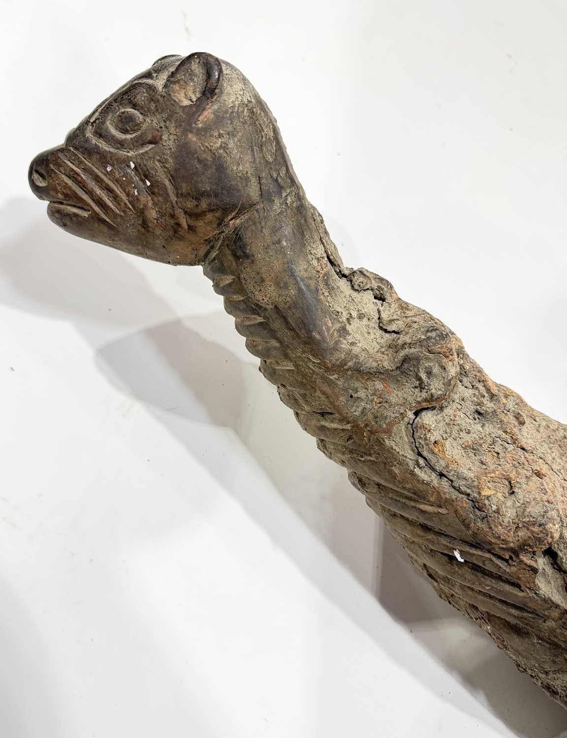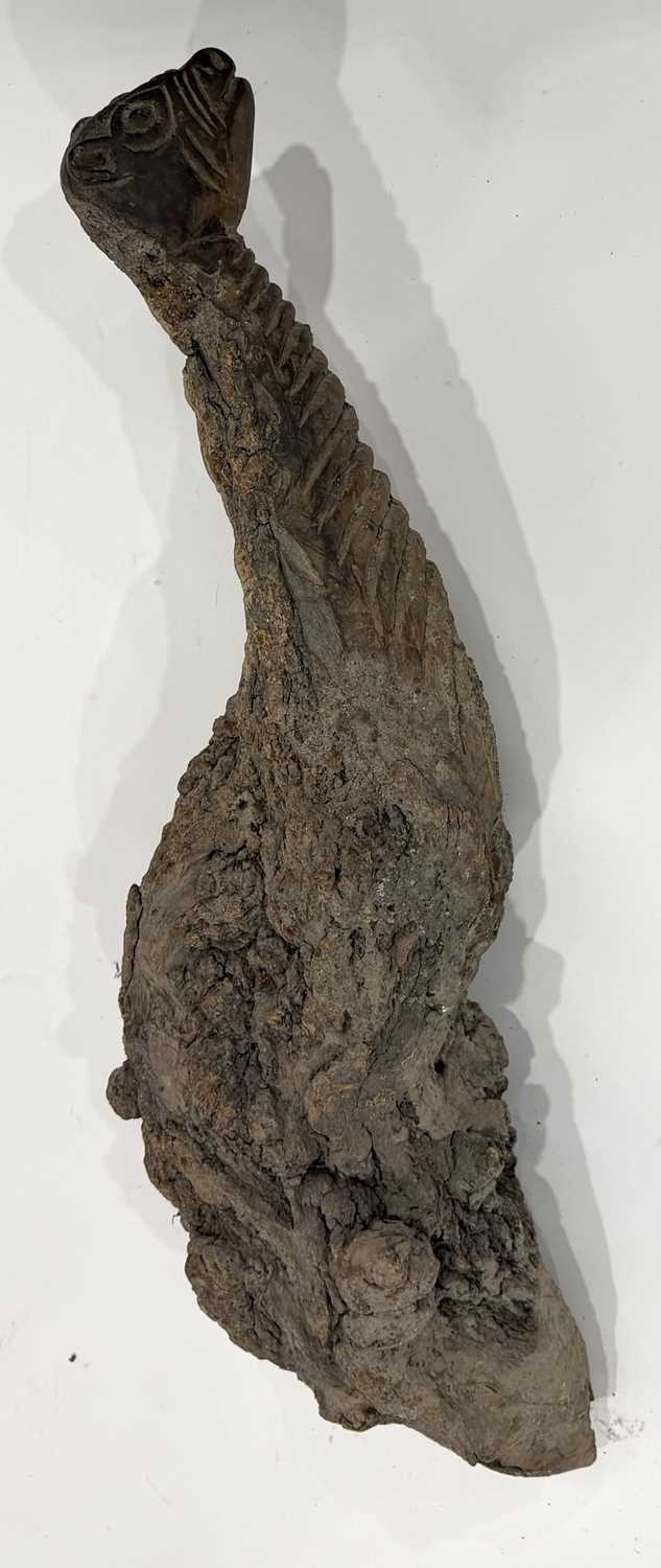 A West Nepalese animist guardian figure, Humla region, a tree root with a smoothly carved portion to represent an animal, possibly a deer or a bird over the gnarled root, naive, folk or 'primitive' in style, h:94cm Note: the guardian would have been installed outside, root end submerged into the earth or mounted as a protective 'touch stone' in high traffic areas such as crossroads, resulting in the polished appearance of the carved animal head Provenance: The Alain Rouveure Collection