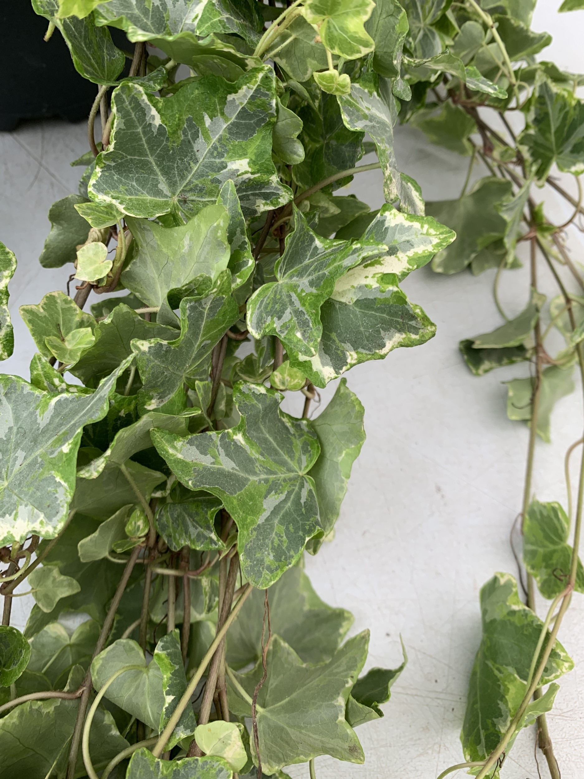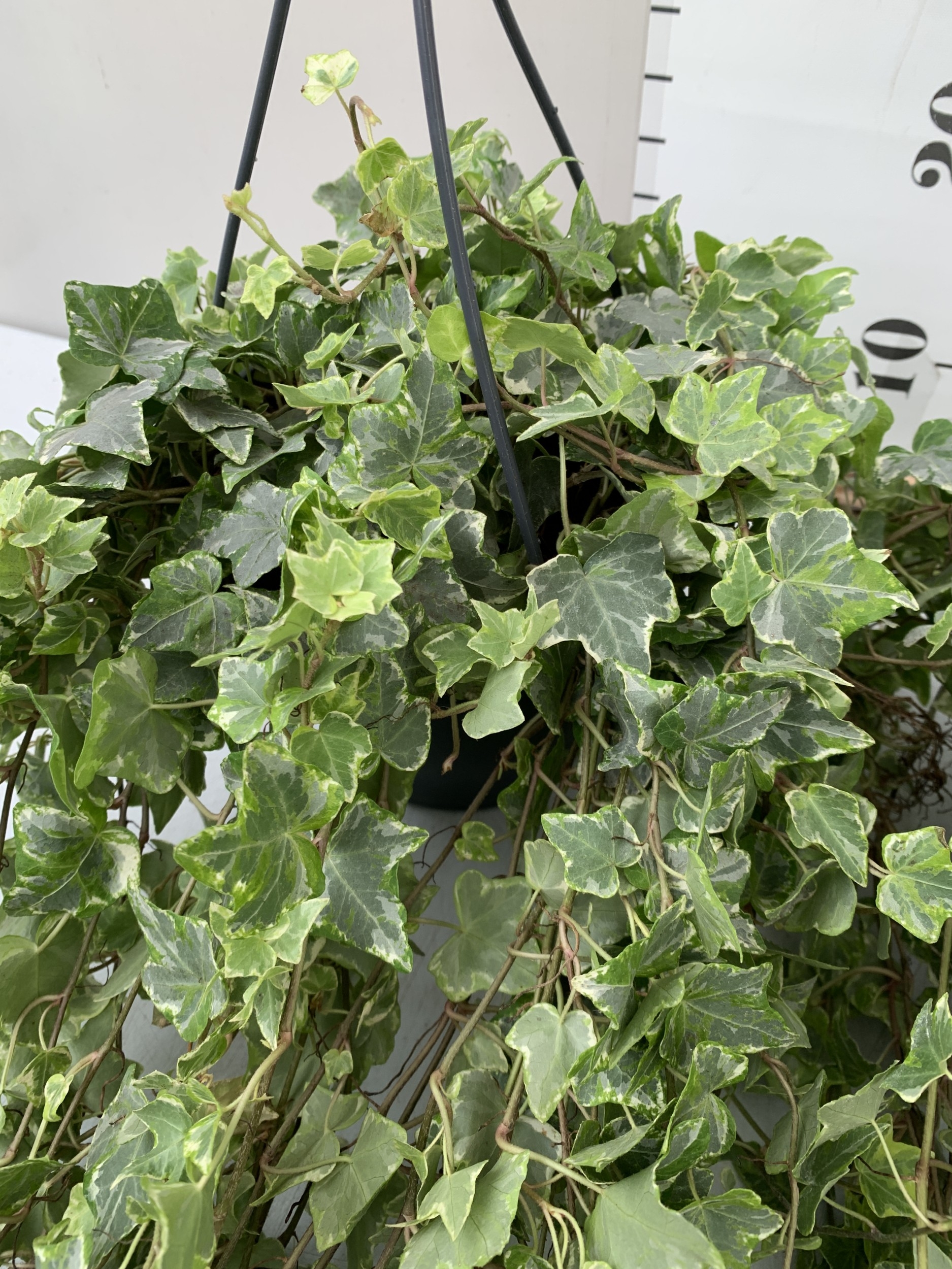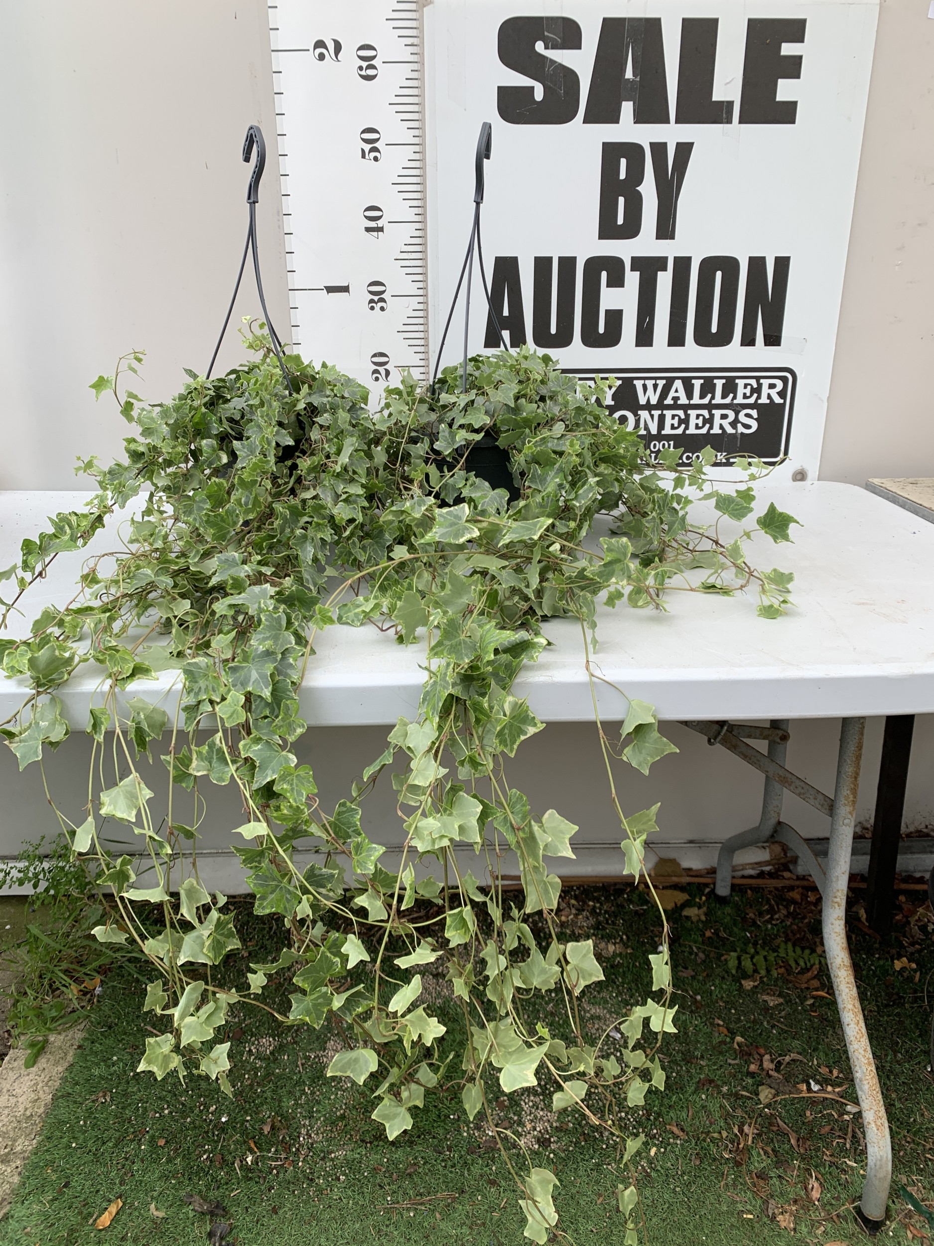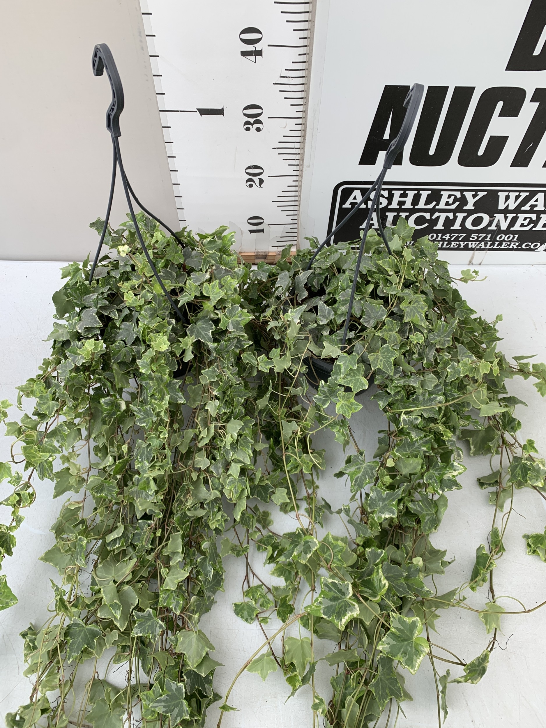 TWO IVY HANGING BASKETS - WITH LARGE WHITE HEDERA HELIX. BASKETS ARE APPROX 50CM TALL. BOTH IVY TRAIL FOR OVER A METRE. TO BE SOLD FOR THE PAIR