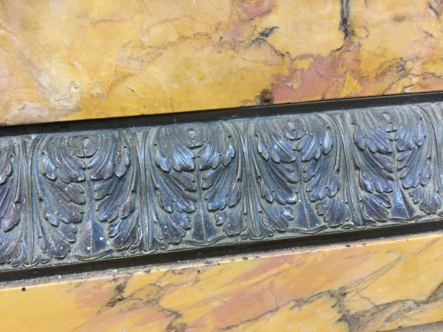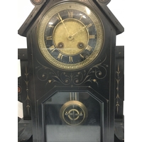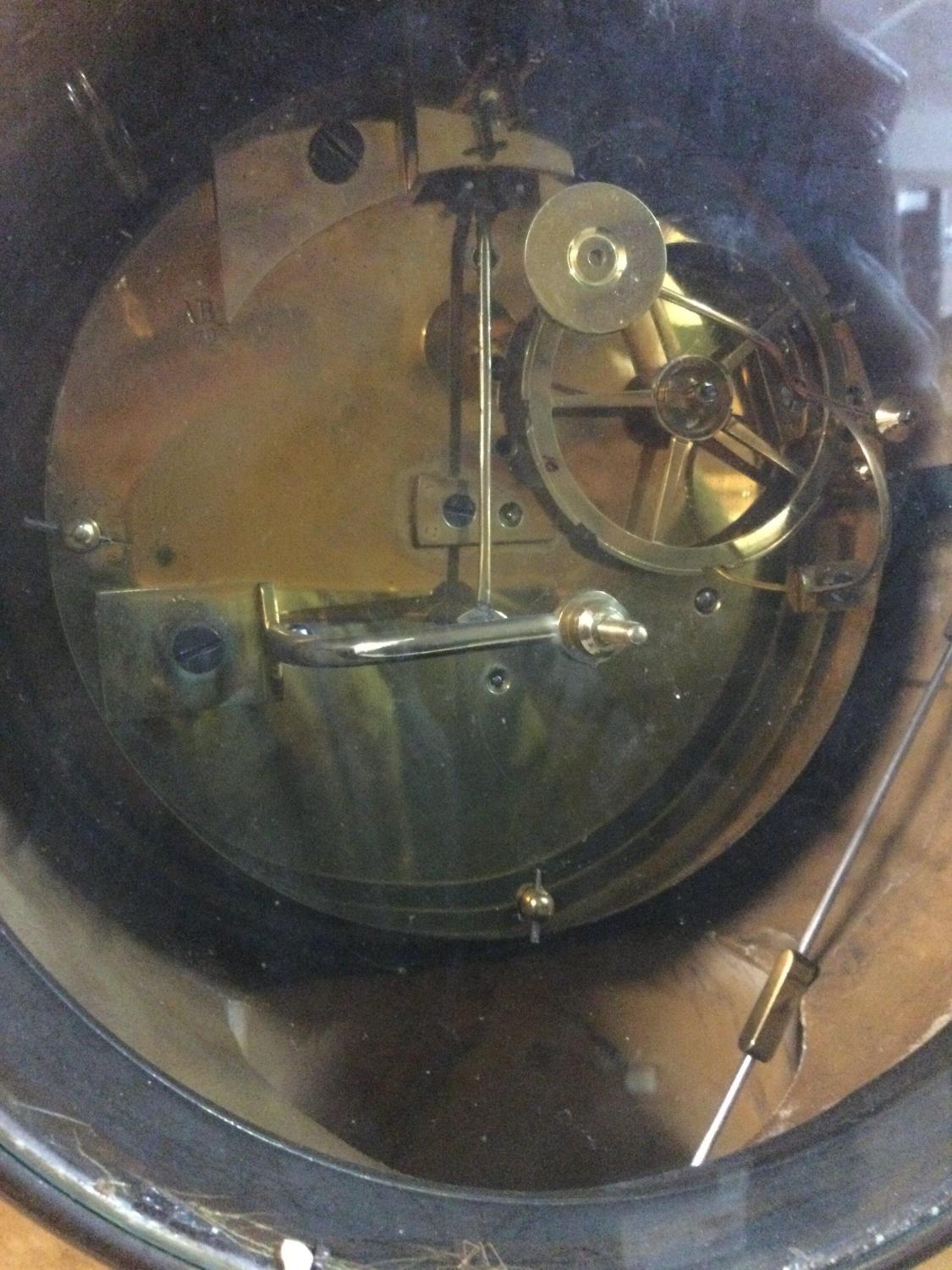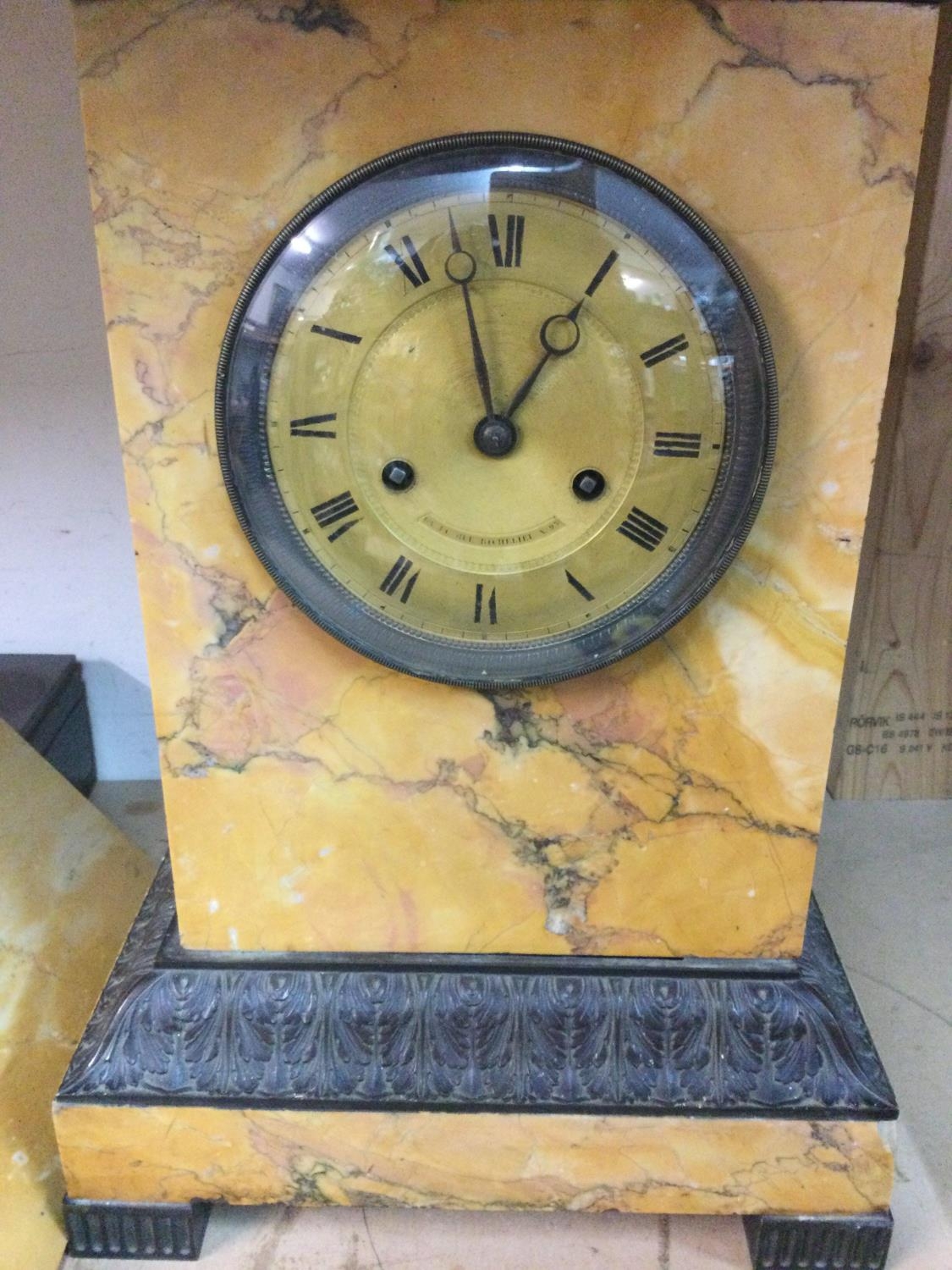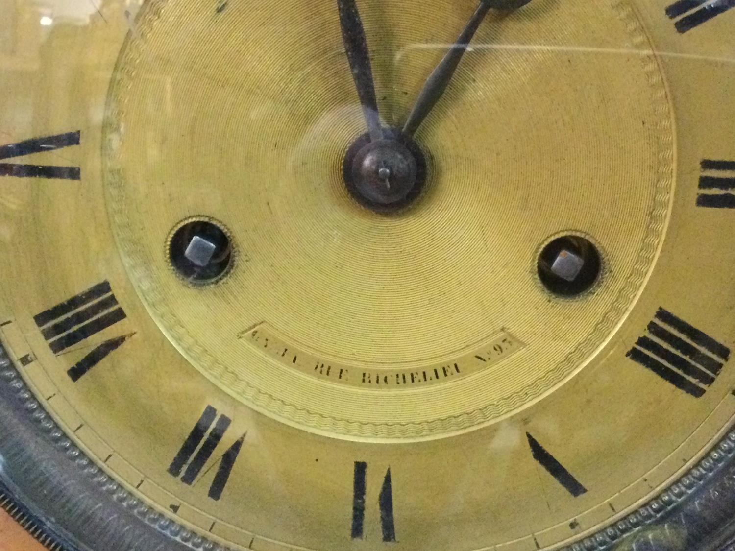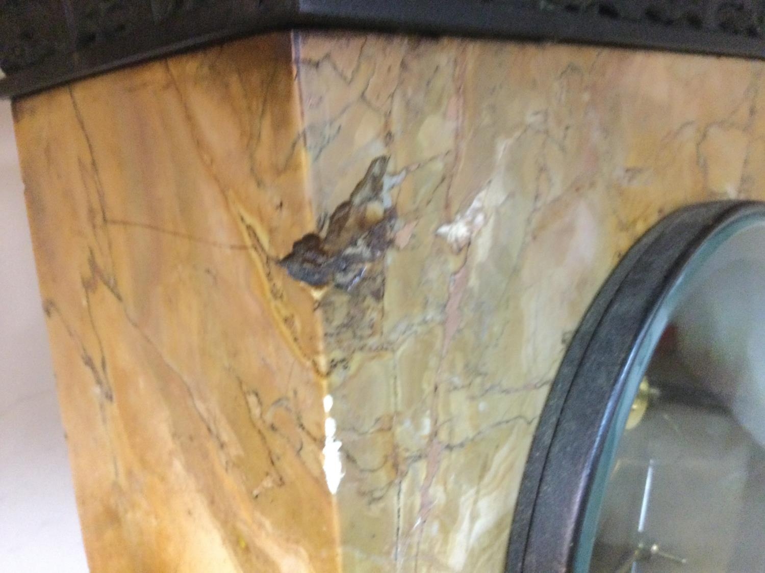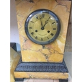 A Recency marble mantle clock with bronze mounts the circular dial with Roman numerals pendulum no bell . 26cm x 55 cm