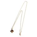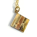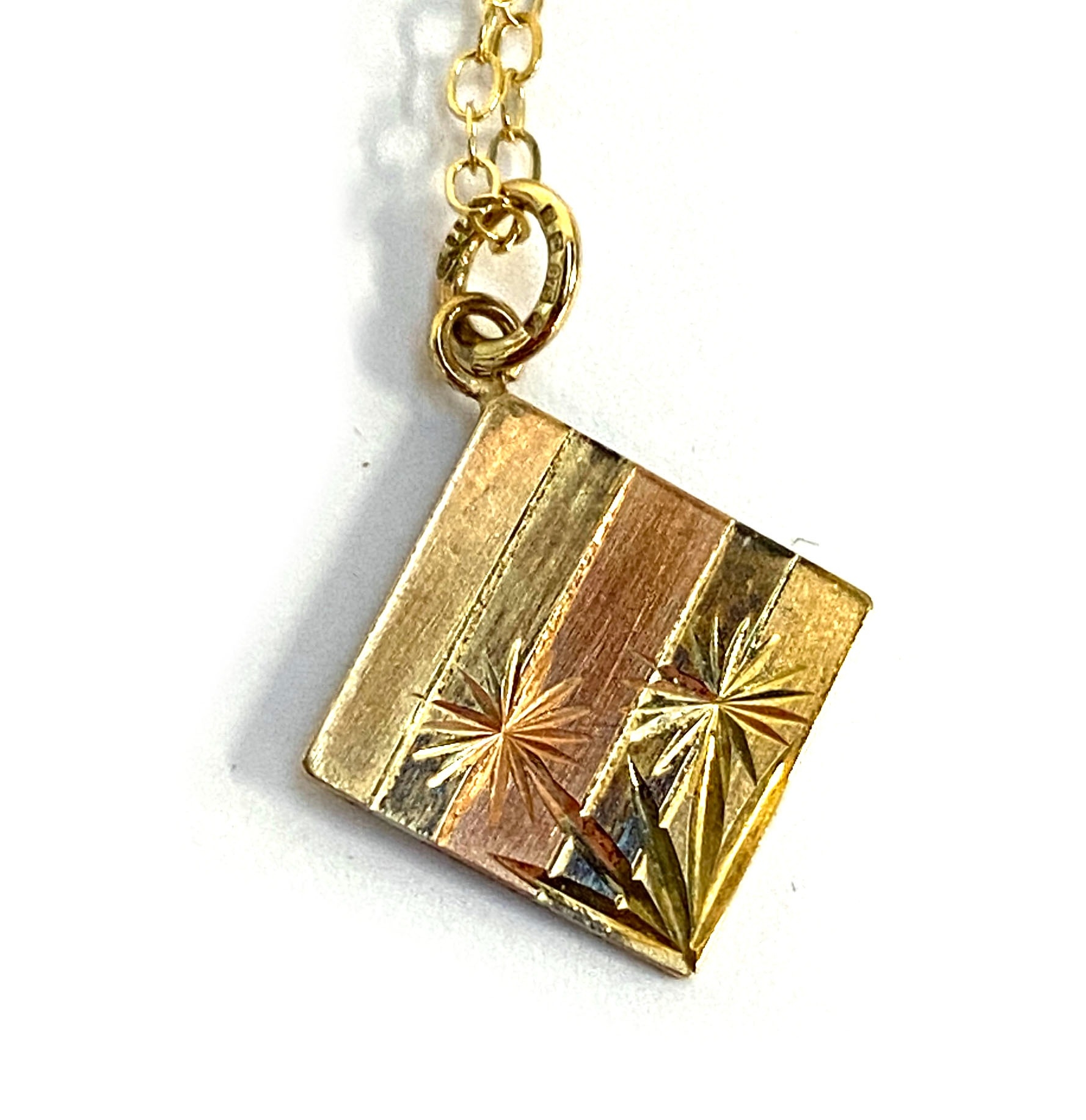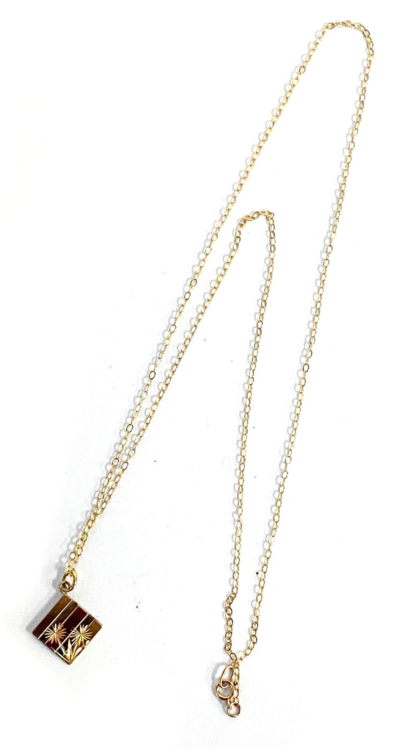 A 9ct three coloured gold square pendant with flower engraving, on a 9ct trace chain, the chain 45cmL unclasped, gross weight 1g