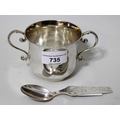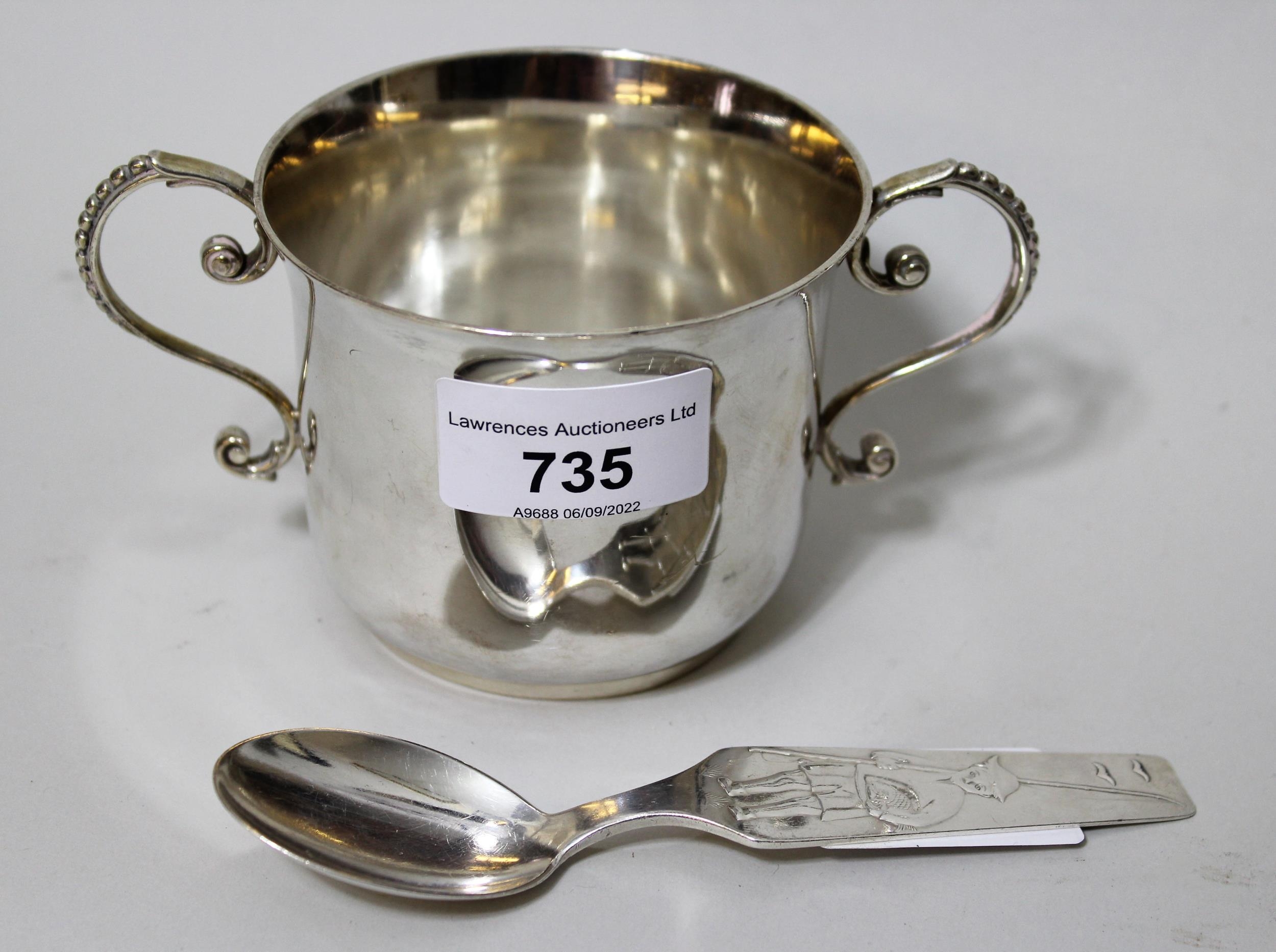 Victorian silver two handled porringer, London, 1887, 5 troy oz. together with a Scandinavian (813 mark) caddy spoon