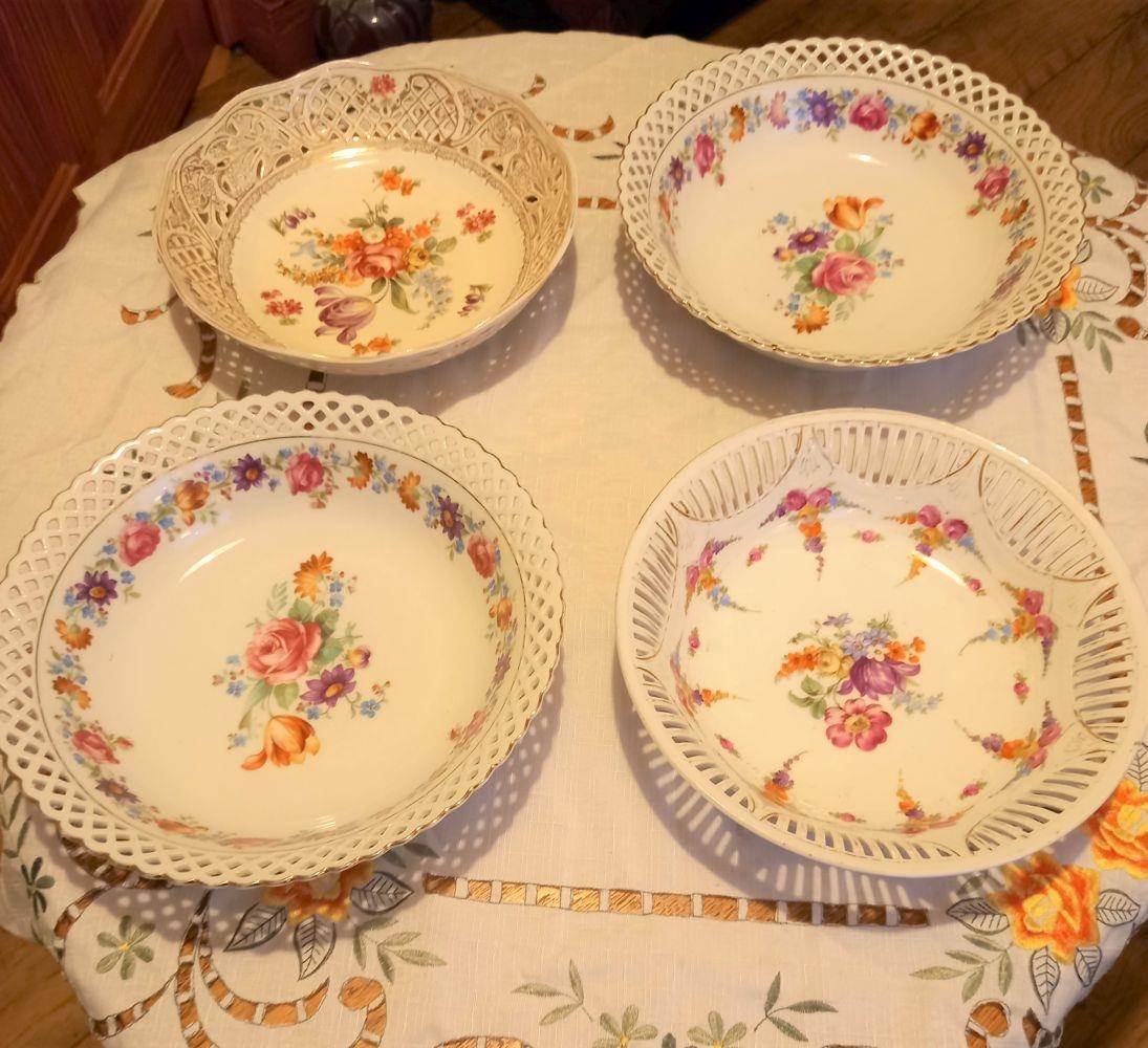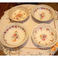A SET OF FOUR DRESDEN CHINA BOWLS, finely decorated with painted floral design to centre, surrounded by pierced decoration, marked Schuman to base. In excellent condition with no chips or cracks. Dimensions: larger two 10"× 10"; smaller two 9"× 9" approx