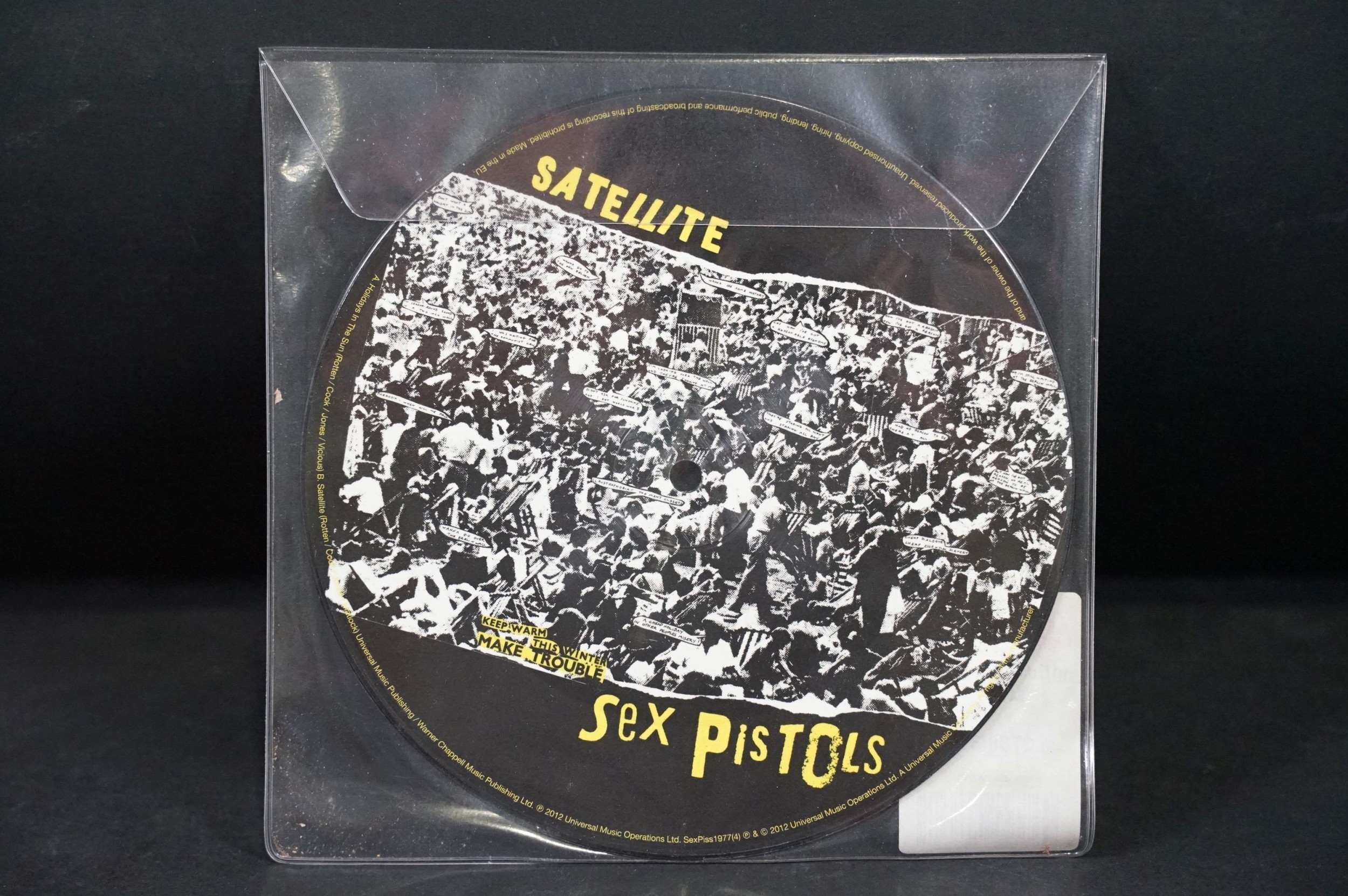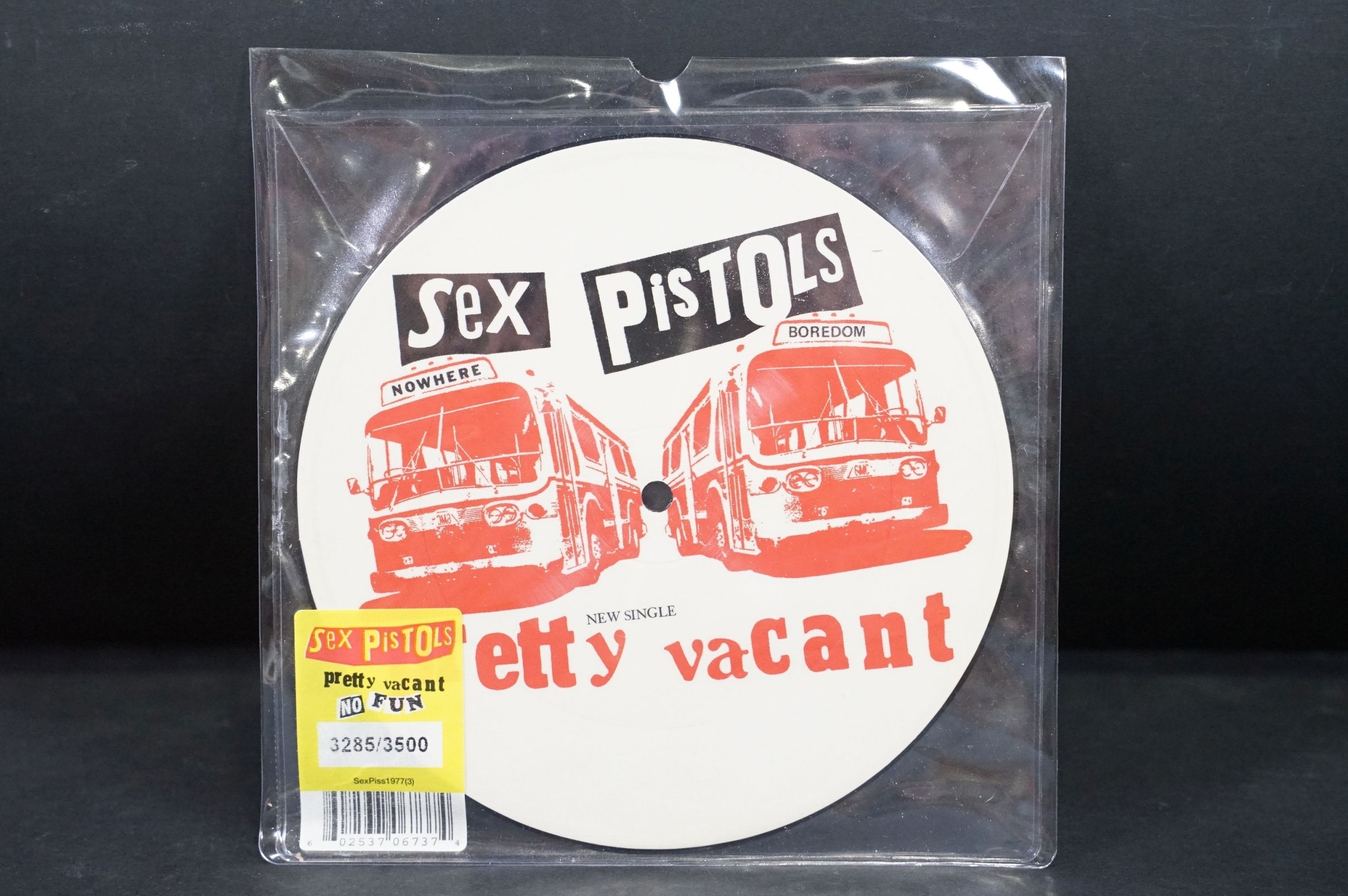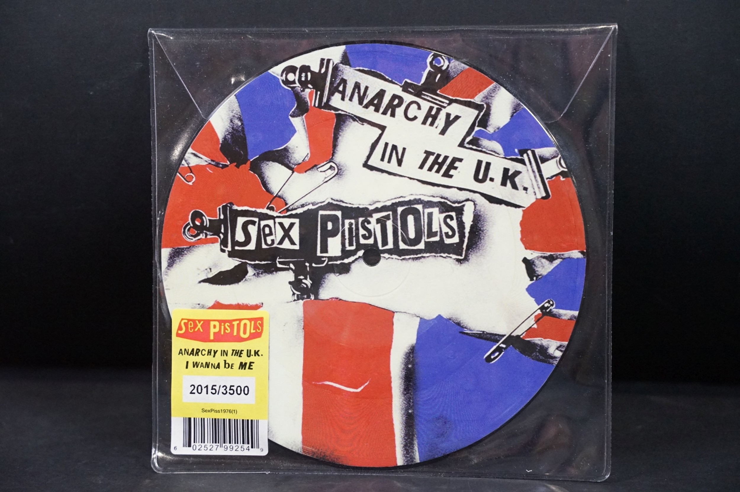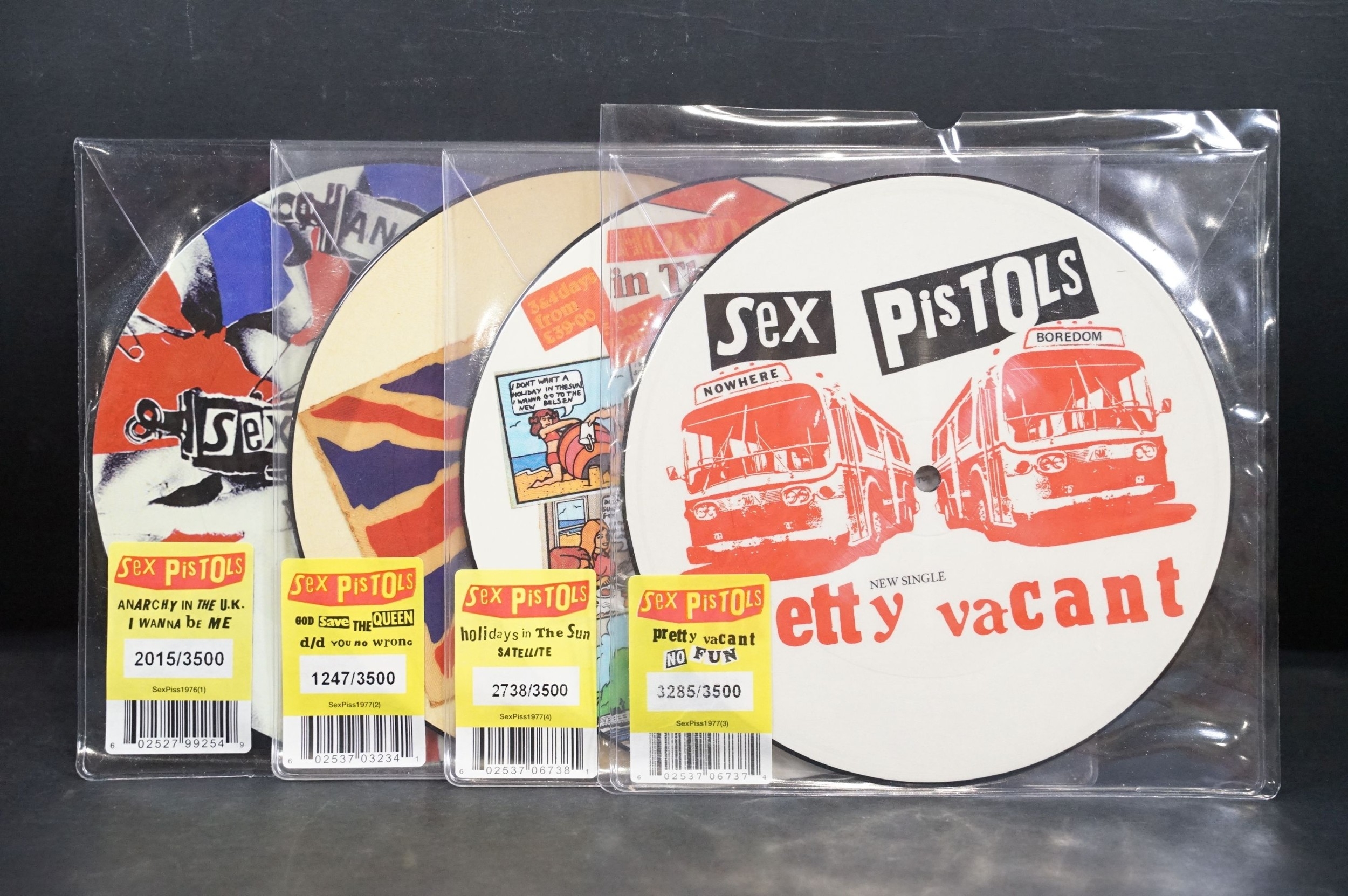 Vinyl - Punk - Sex Pistols, 4 official UK 2012 limited edition numbered re-issue picture disc 7” singles to include: Pretty Vacant (3285/3500), Holidays In The Sun (2738/3500), God Save `The Queen (1247/3500), Anarchy In The U.K. (2015/3500), all in original stickered plastic sleeves. EX+