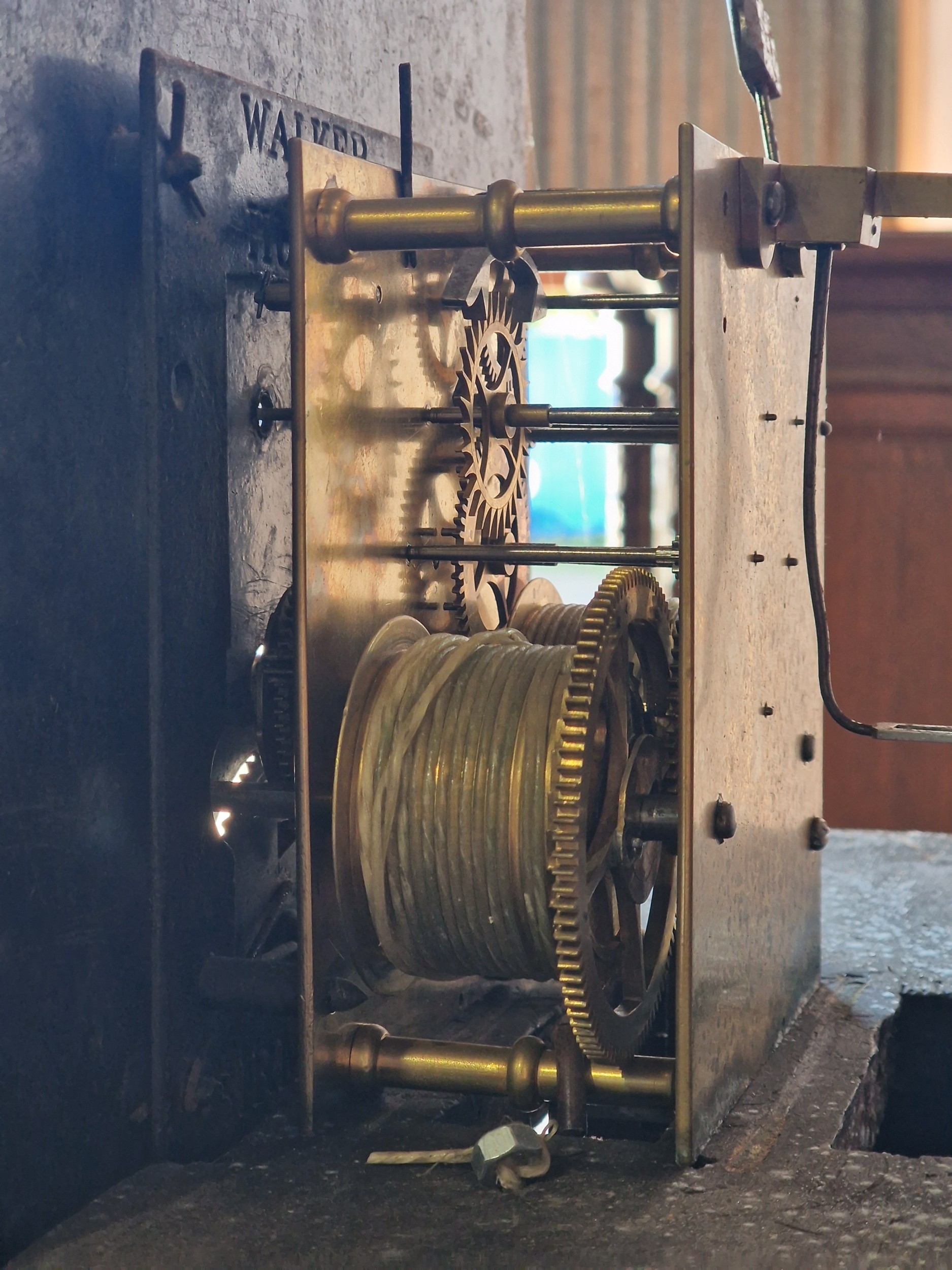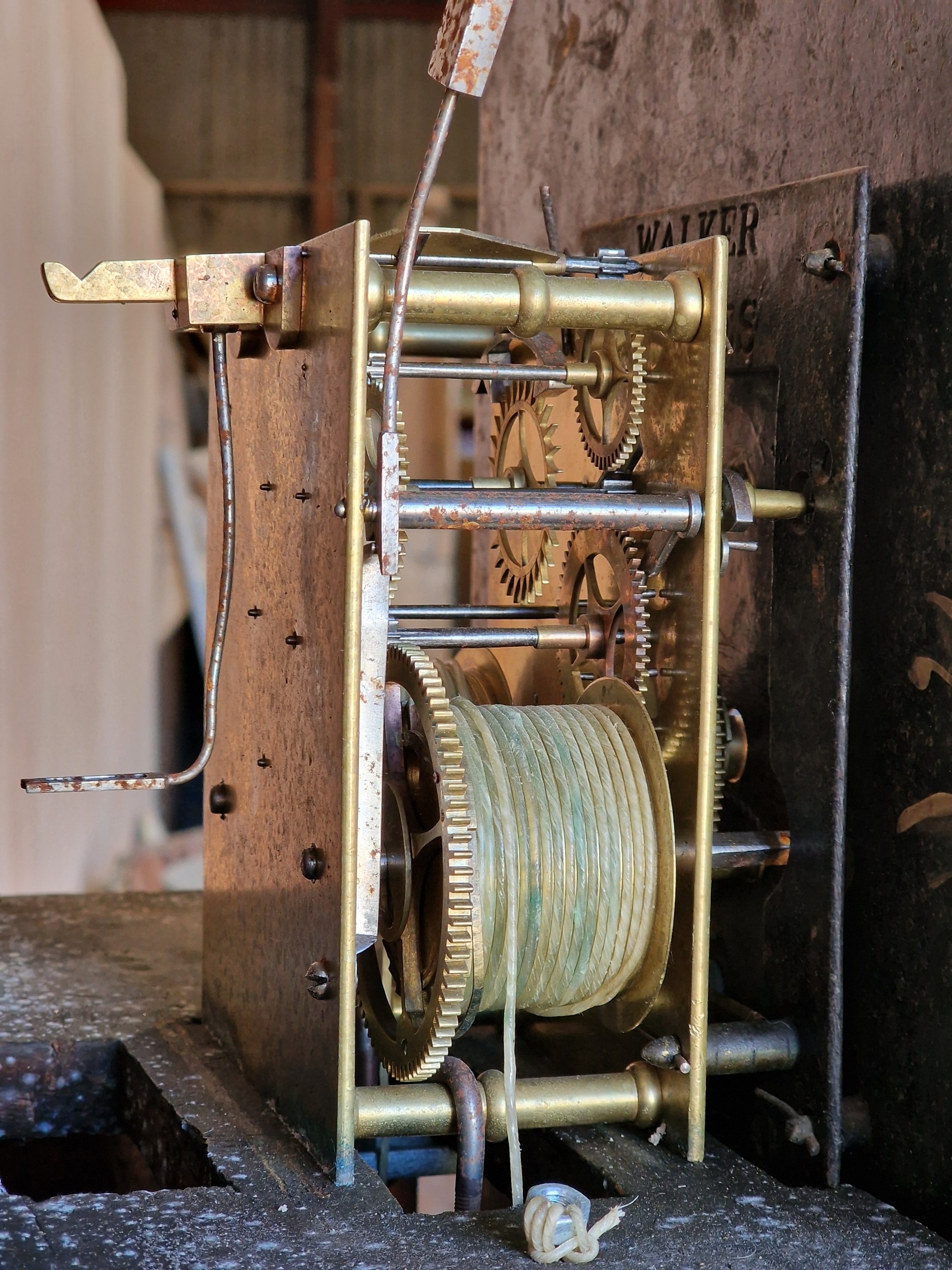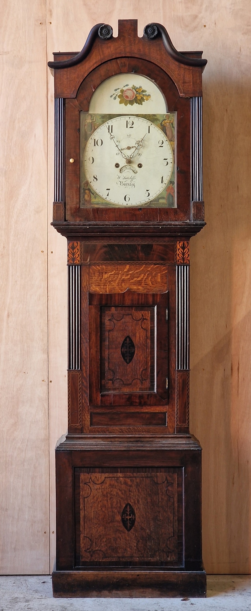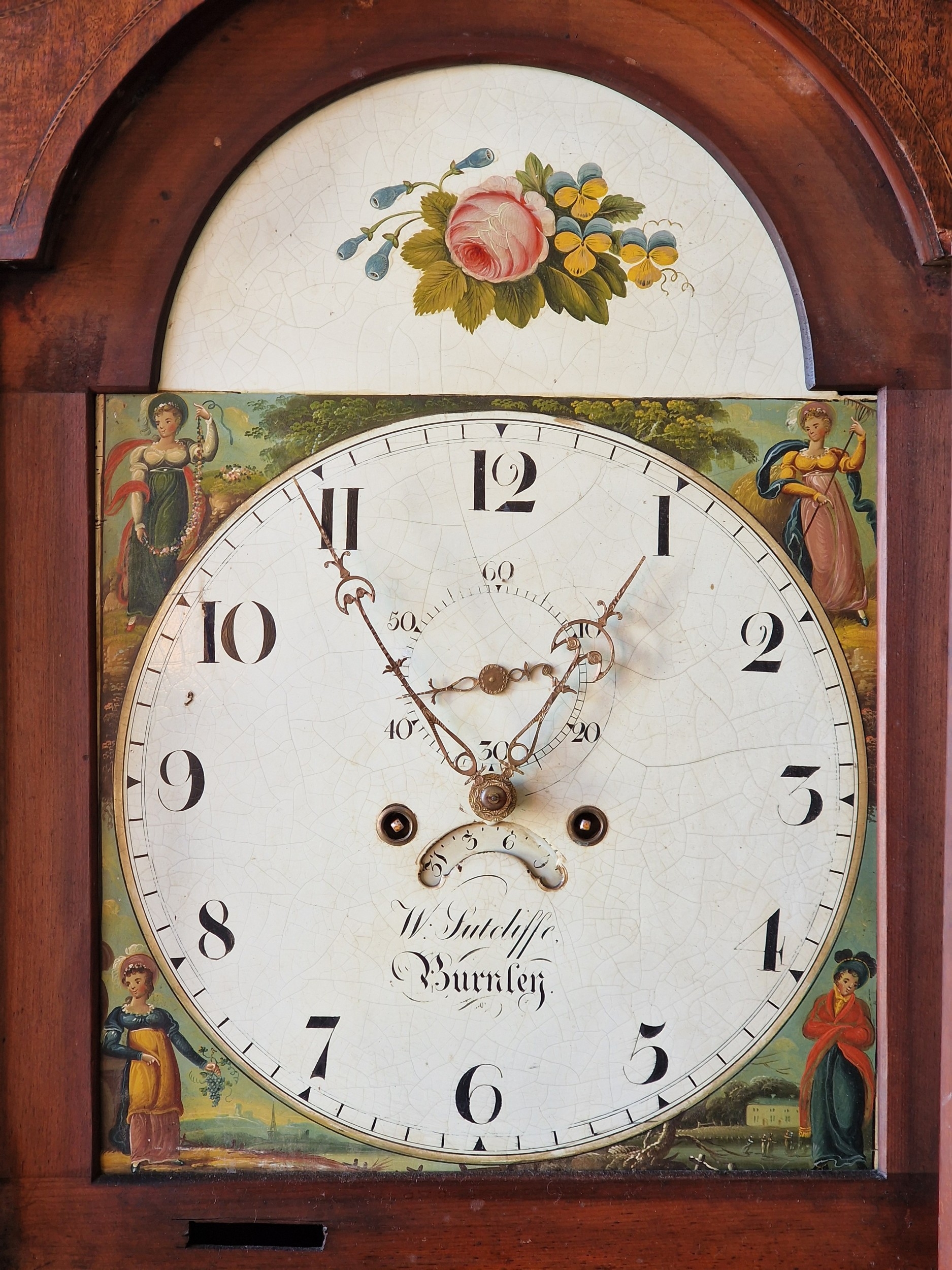 W Sutcliffe of Burnley twin train 8 day longcase clock, the hand painted dial with date aperture and subsidiary second dial, 214cm high