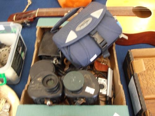 BOX OF CAMERA PARTS AND BINOCULARS