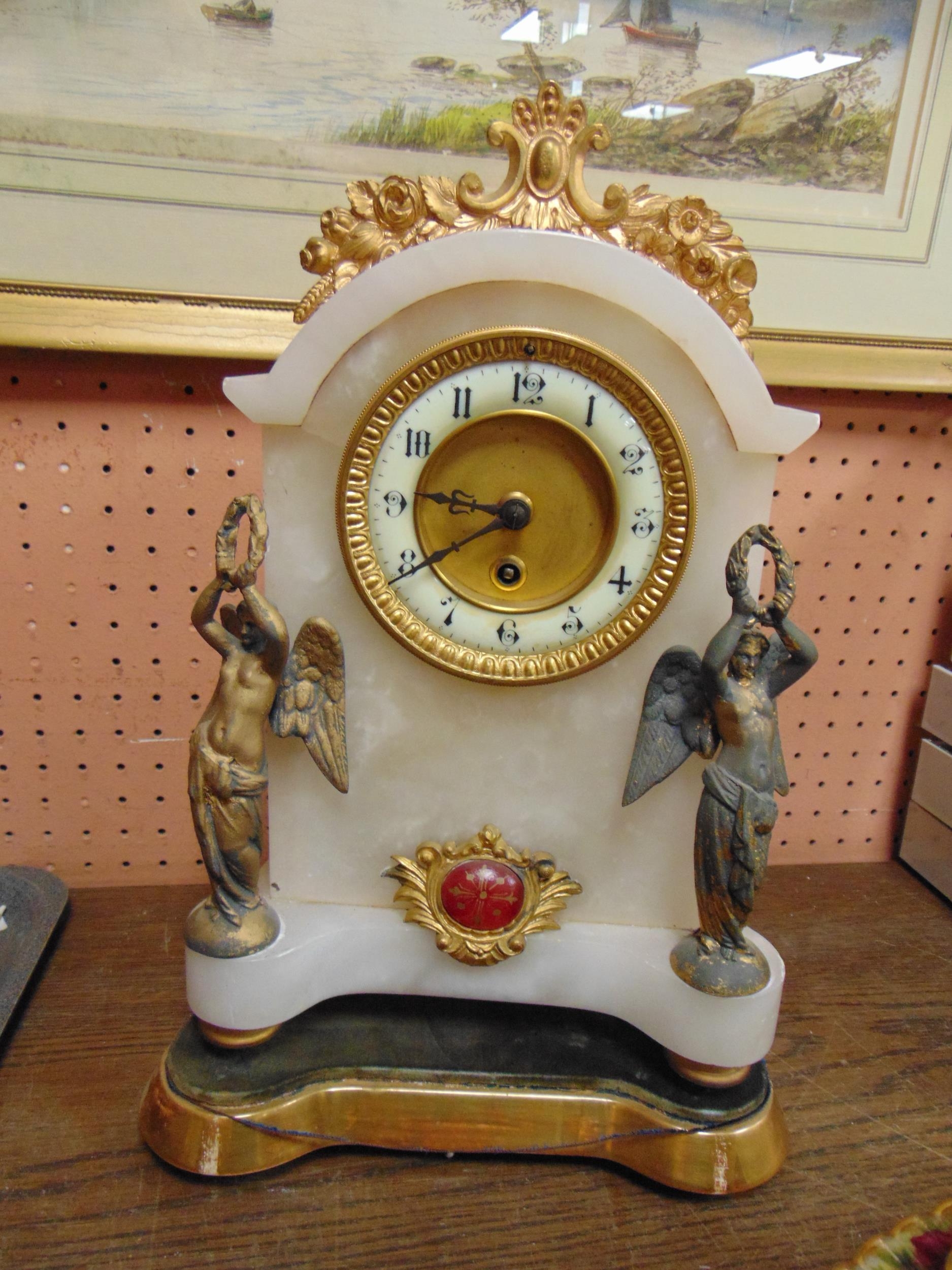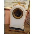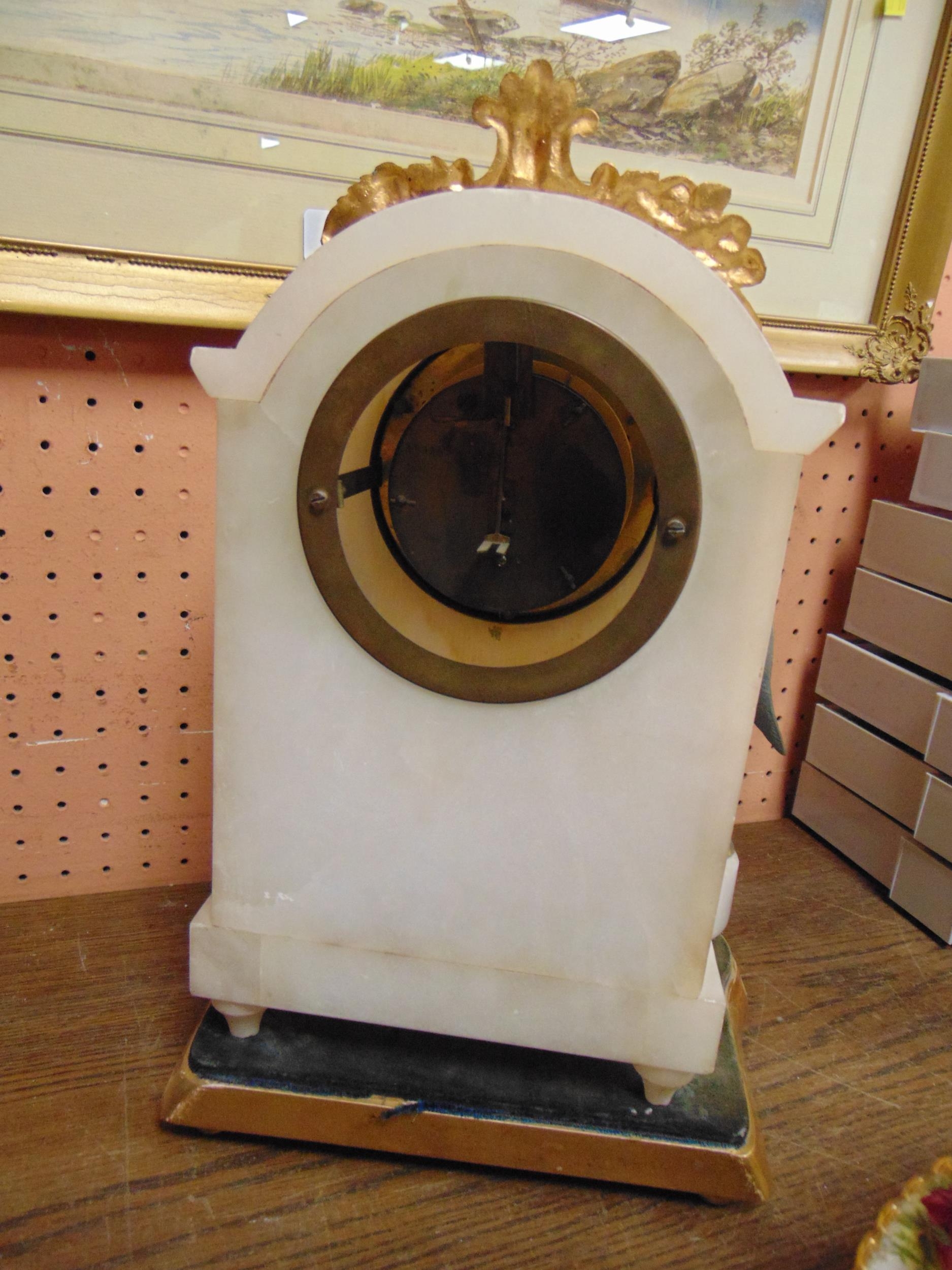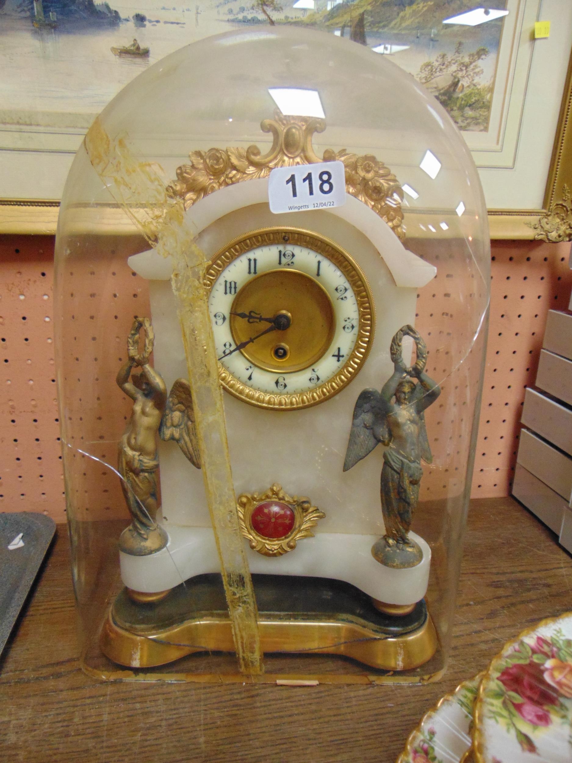 19th century alabaster mantle clock with gilt metal mounts, under glass dome, 15.5" tall.