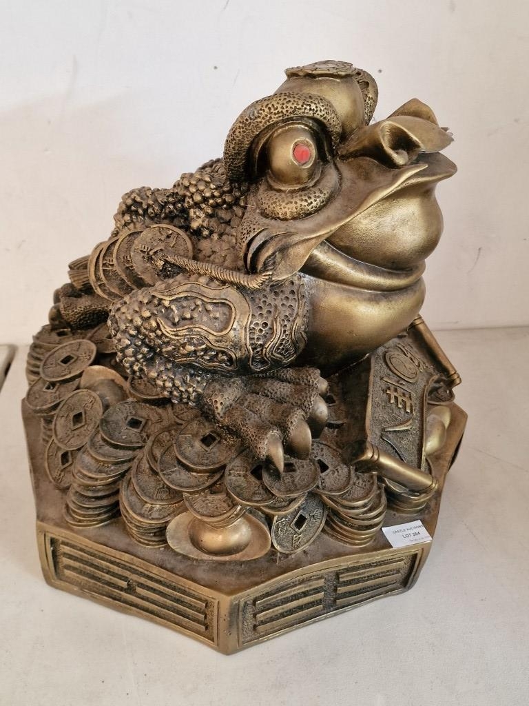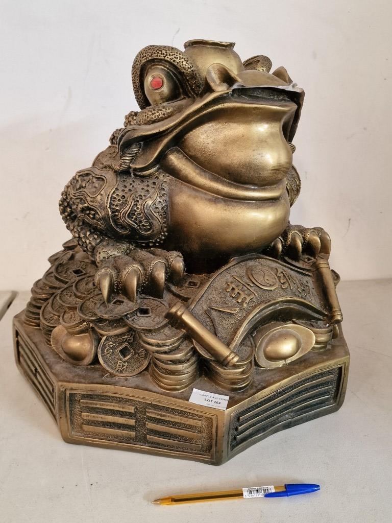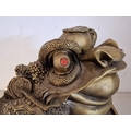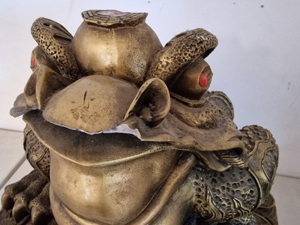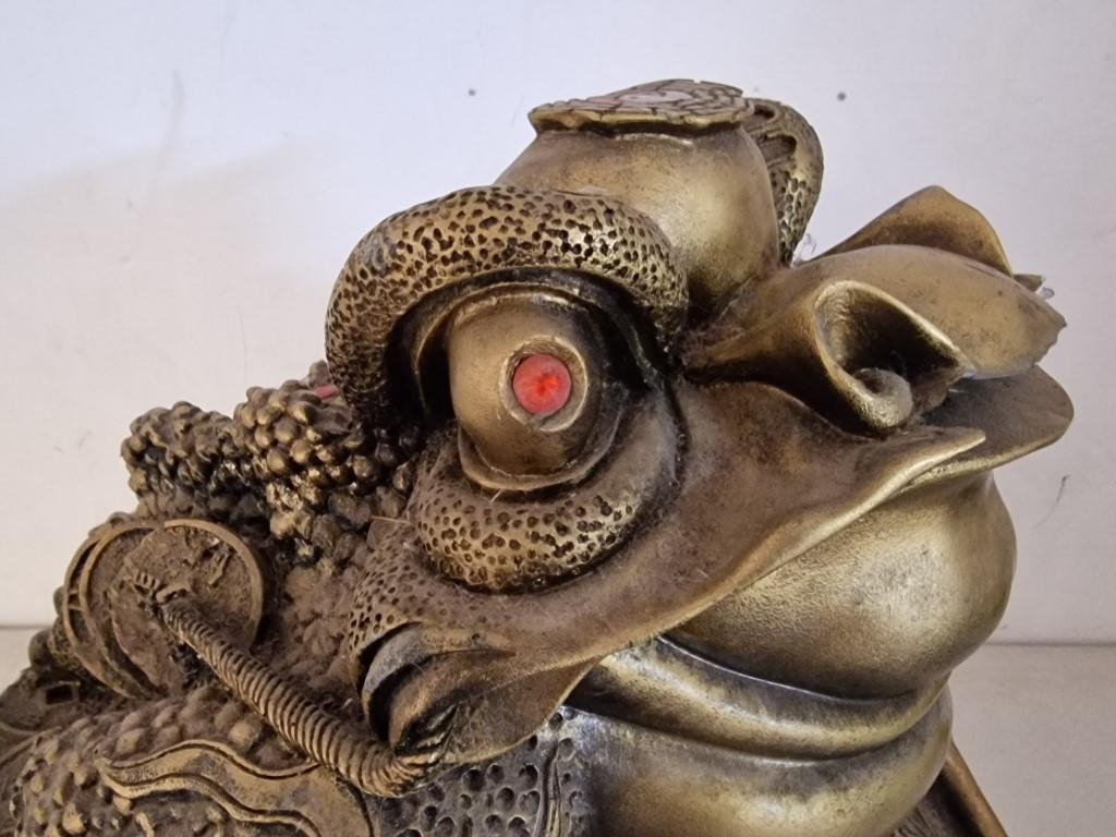 Large Chinese Feng Shui Lucky Money Frog Statue, 'For Good Luck & Riches'! Gold Colour Resin Ornament with Red Colour Eyes and Back Decoration, (Approx. H: 43cm, Base Ø: 47cm)