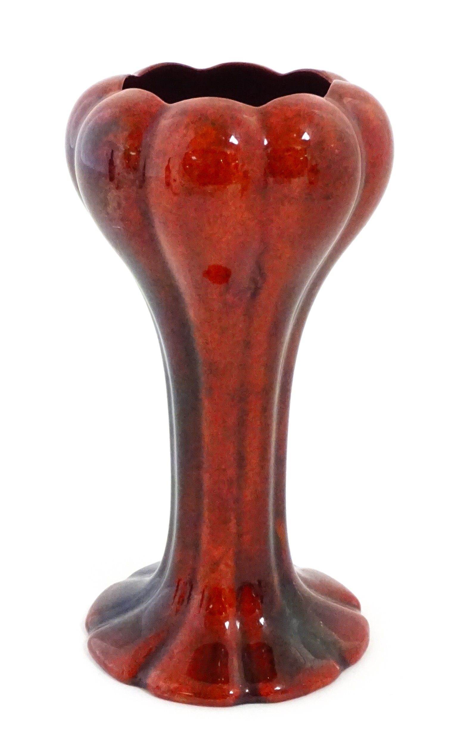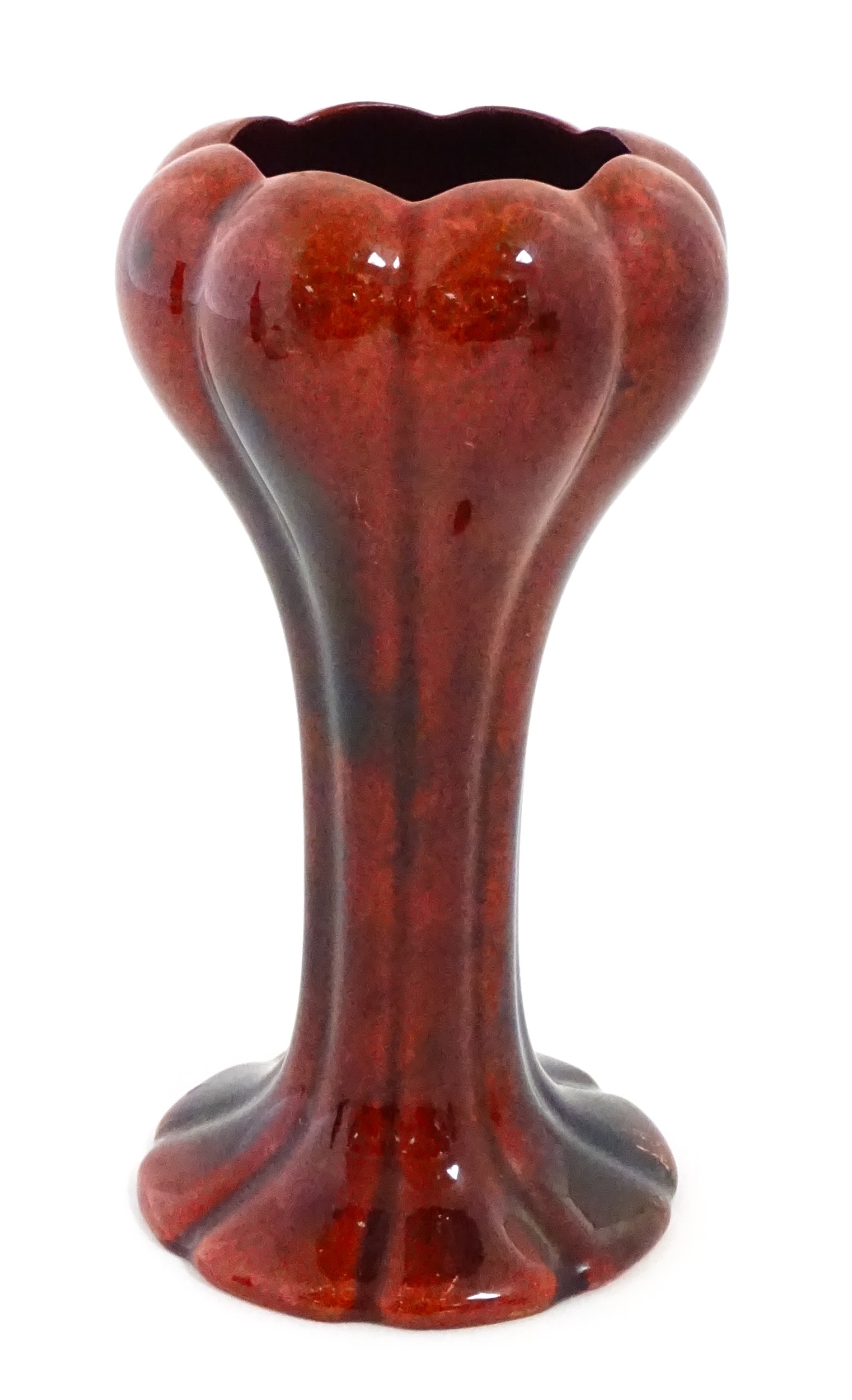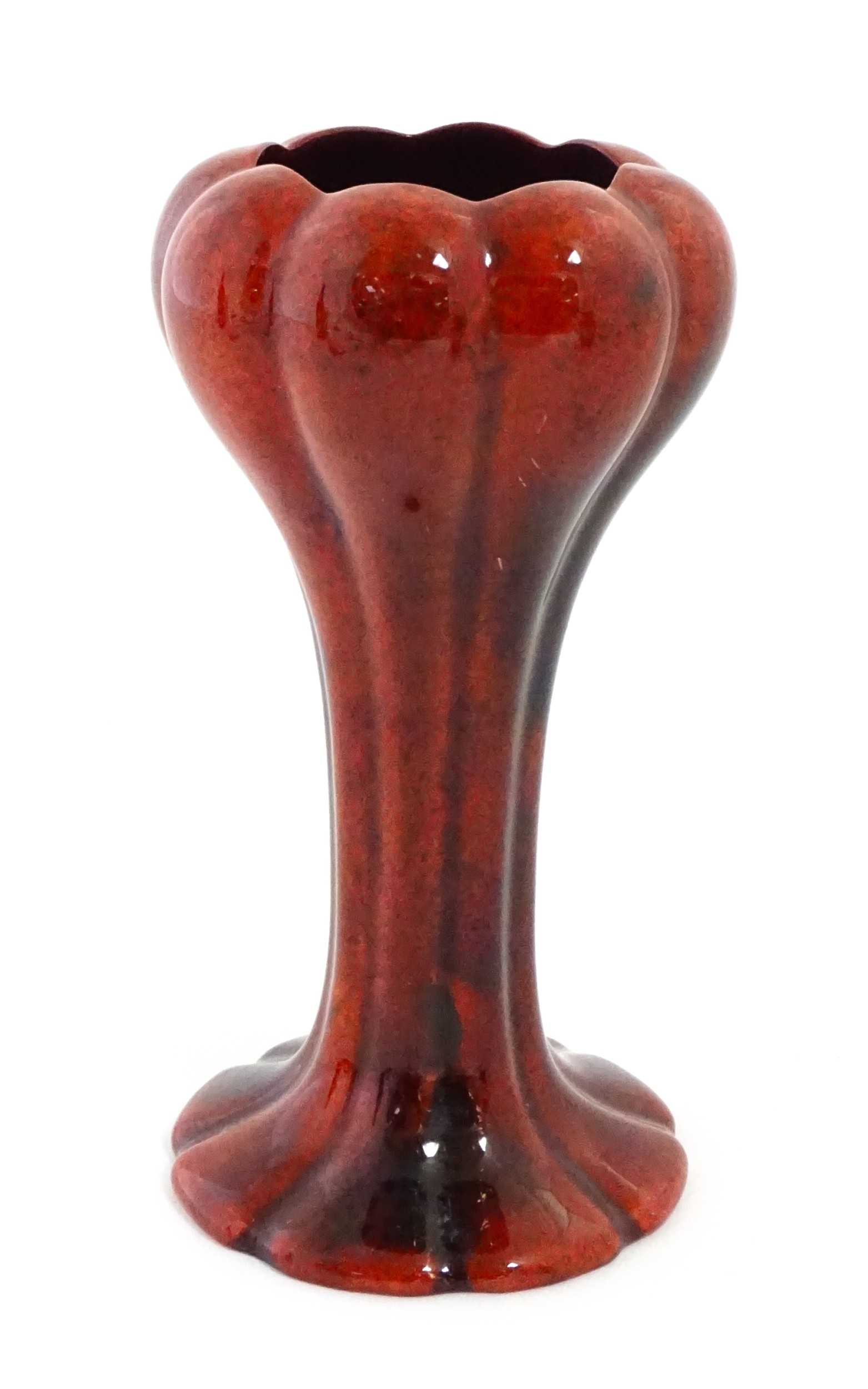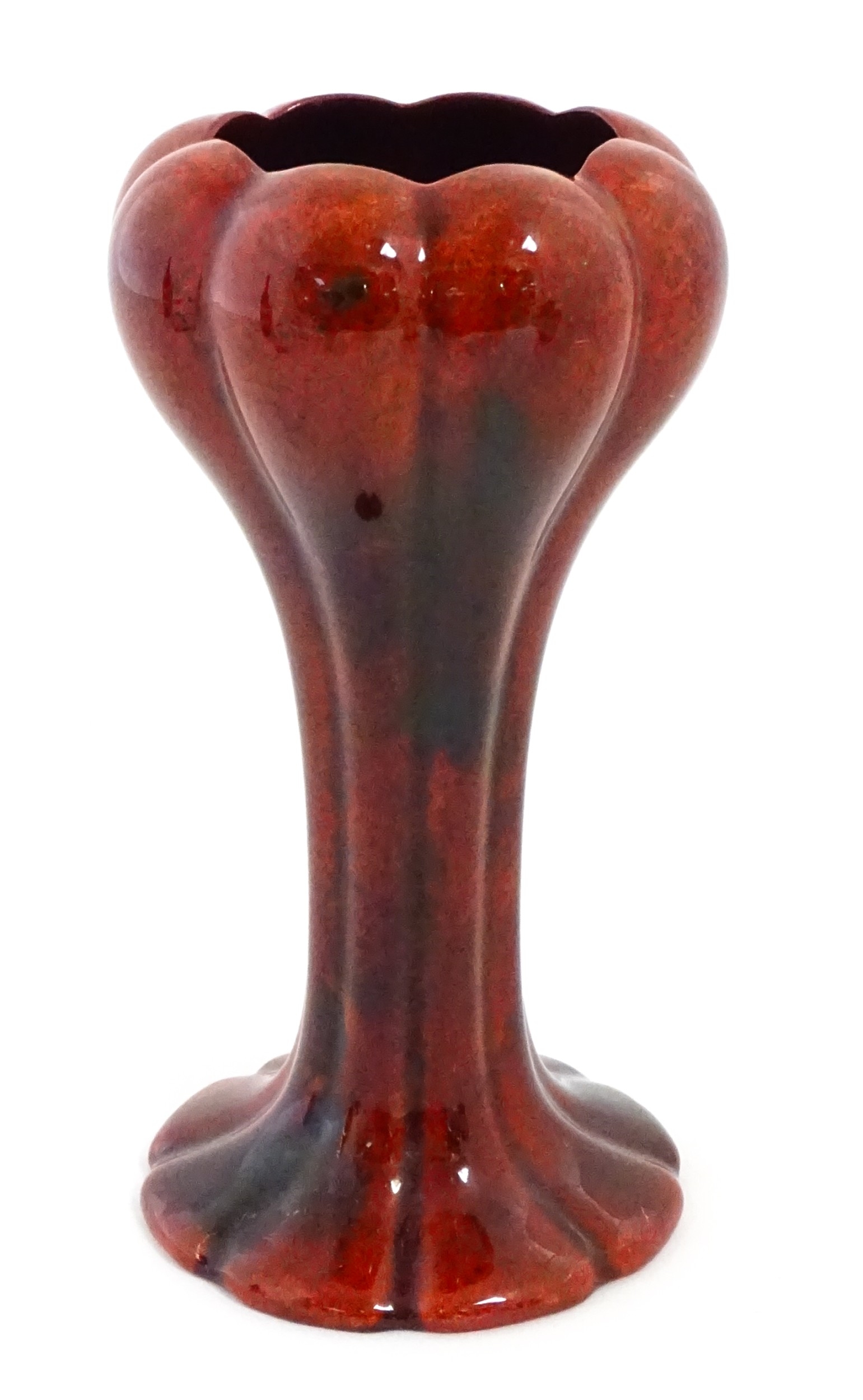 A Royal Doulton flambe tulip vase of lobed form with a splayed foot, designed by Fred Moore. Marked under and signed with FM initials. Approx. 7 1/4" high