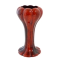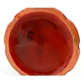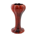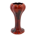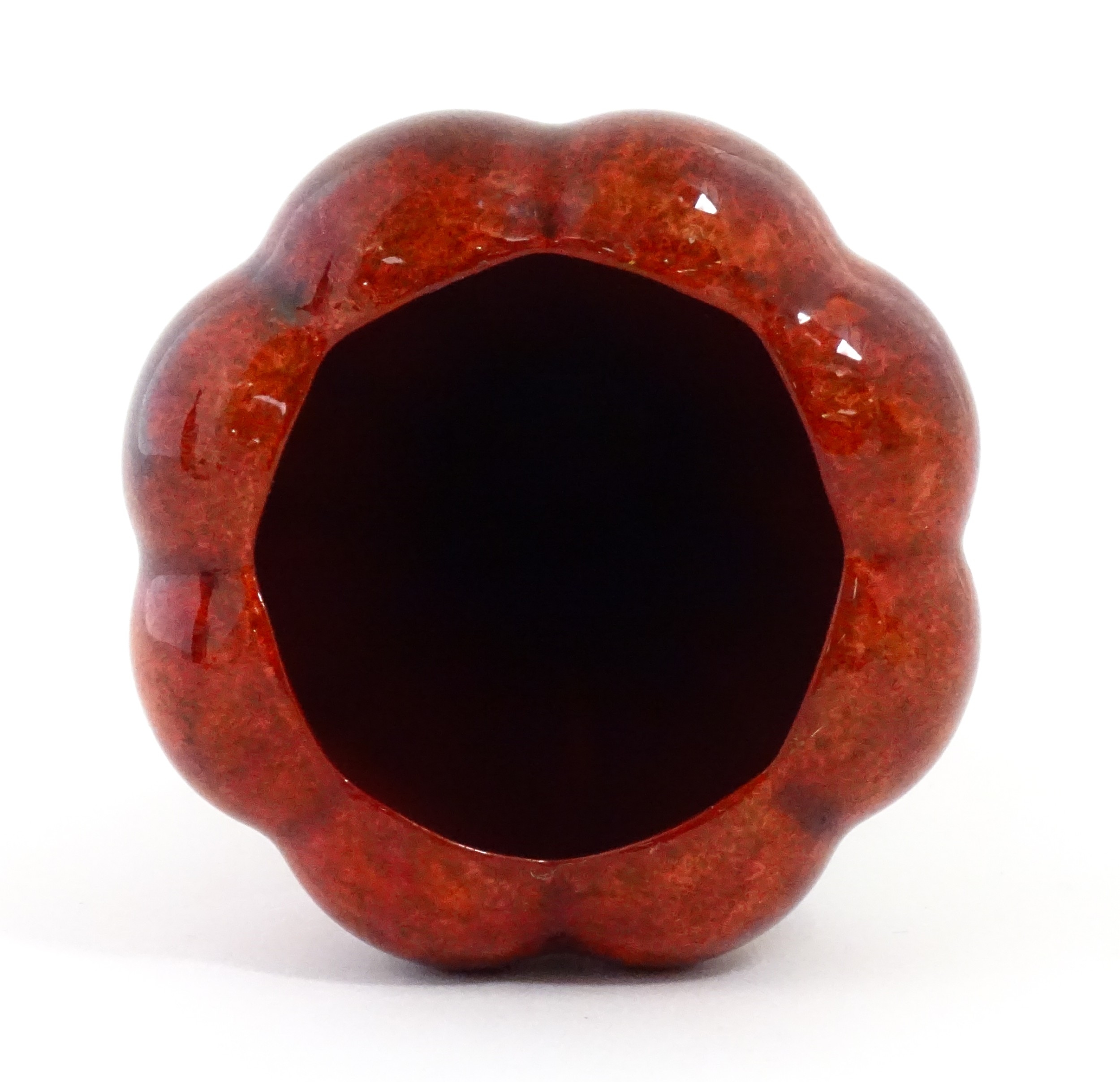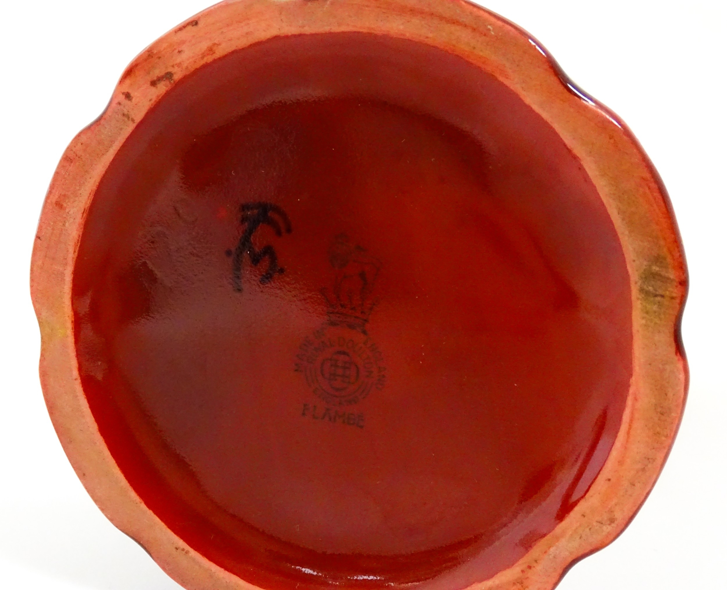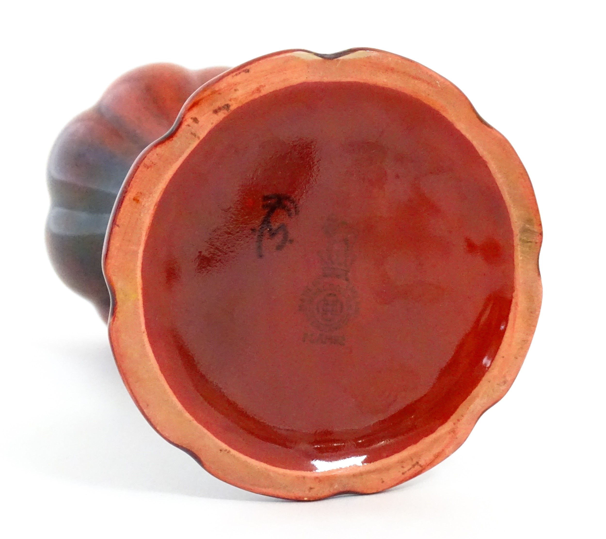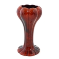 A Royal Doulton flambe tulip vase of lobed form with a splayed foot, designed by Fred Moore. Marked under and signed with FM initials. Approx. 7 1/4" high
