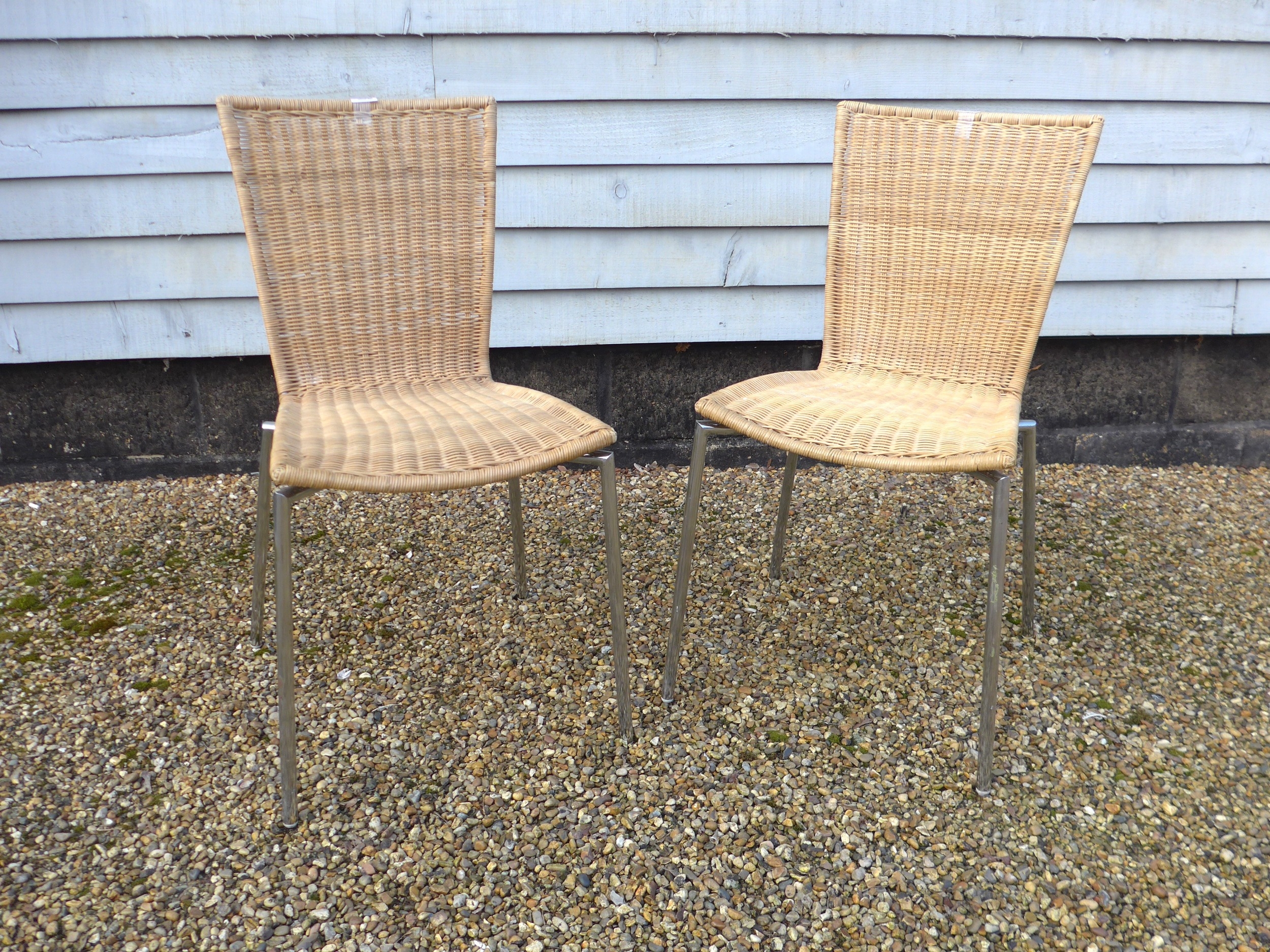 A pair of retro cane wicker chairs on chromed metal frames