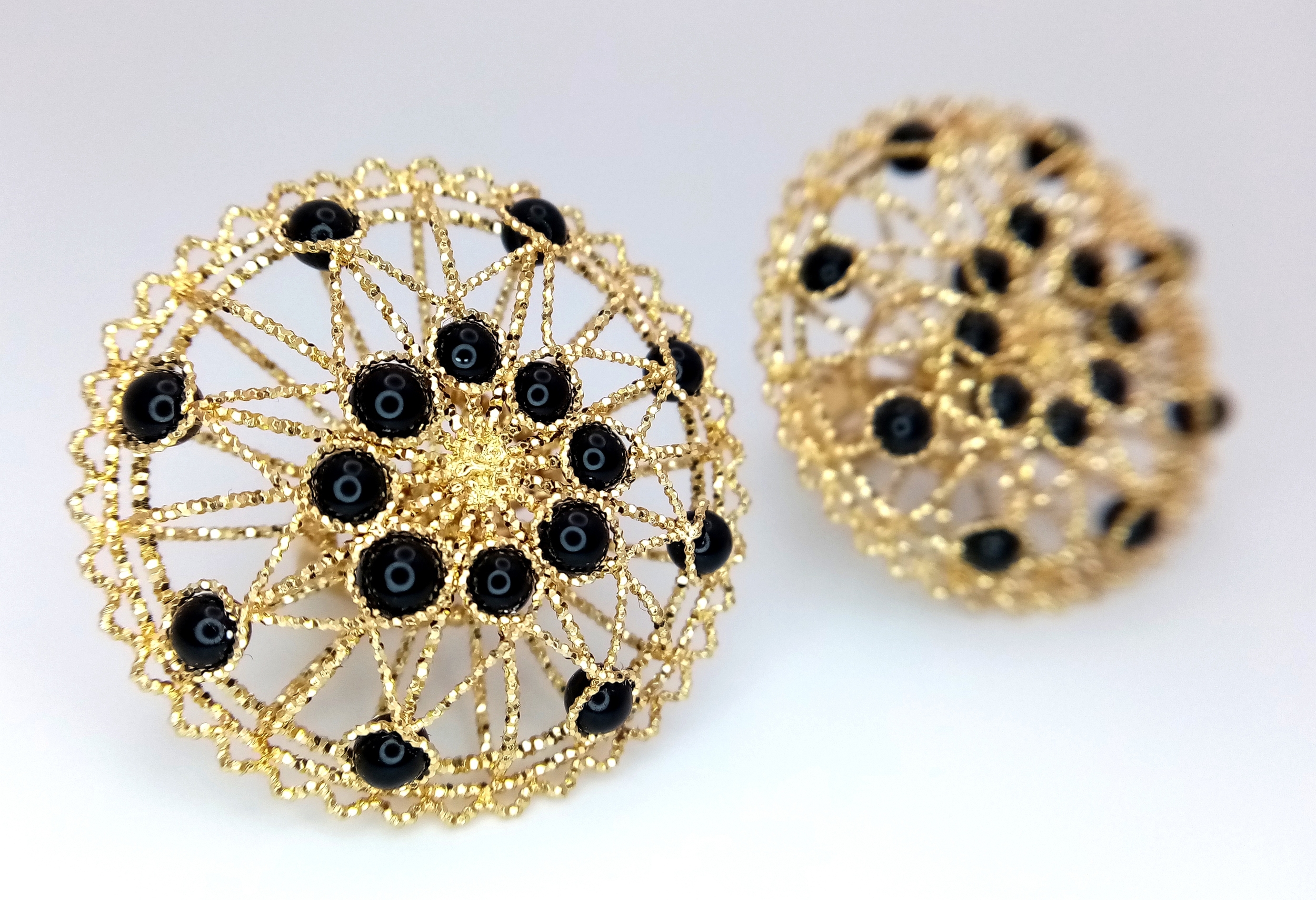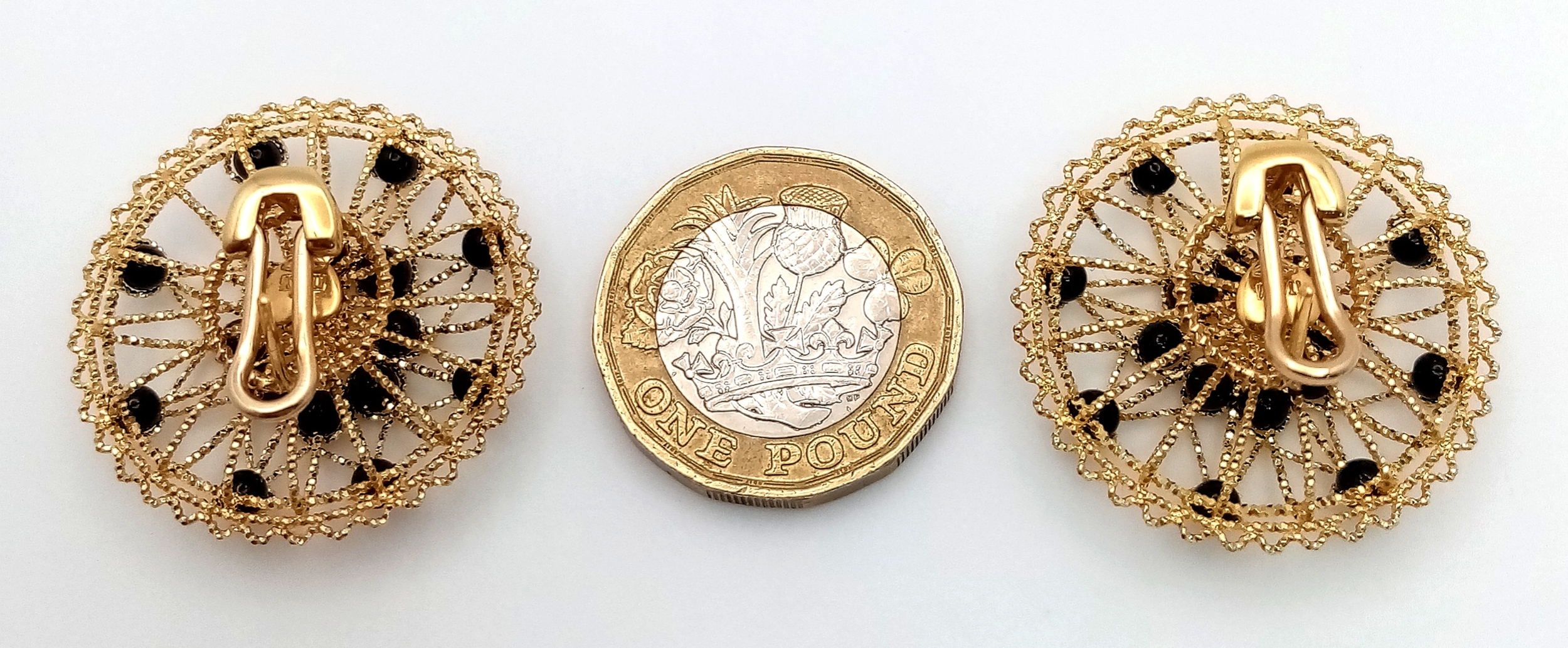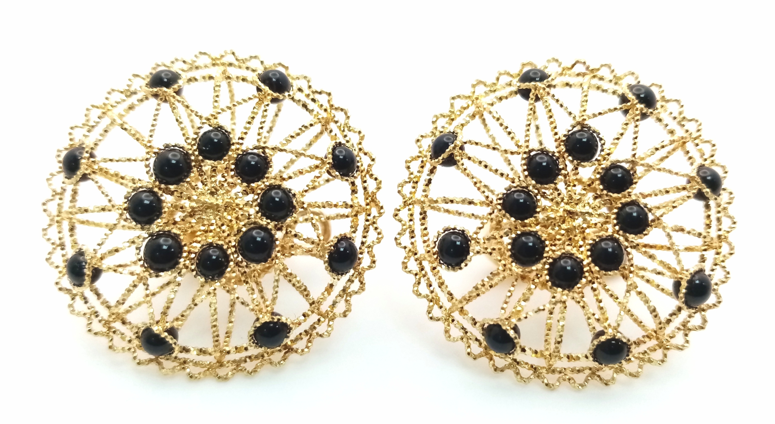 A Pair of Italian Fancy 18K Gold and Onyx Bead Earrings. Beautiful open-work in a circular form. 33mm diameter. 10.4g.