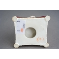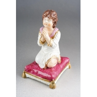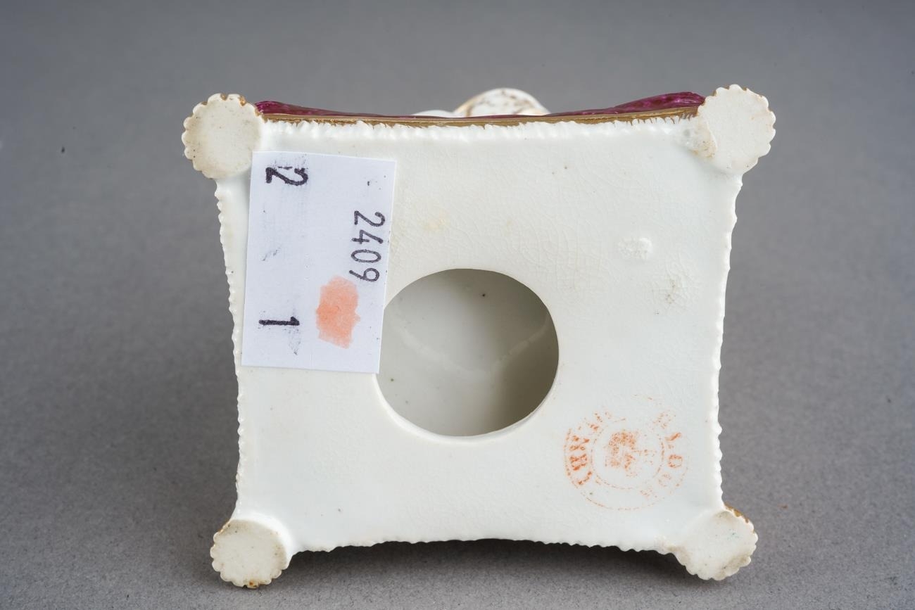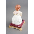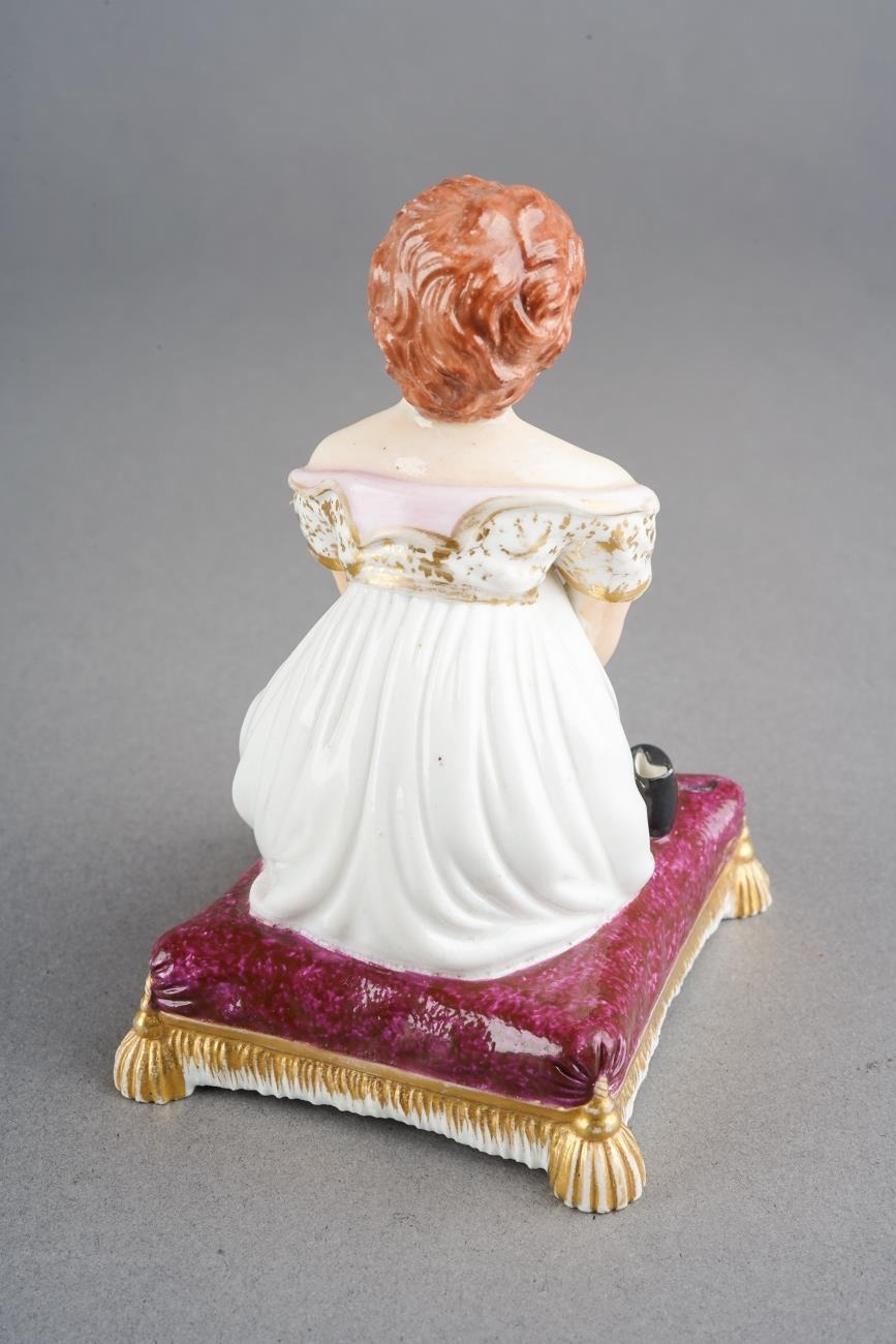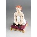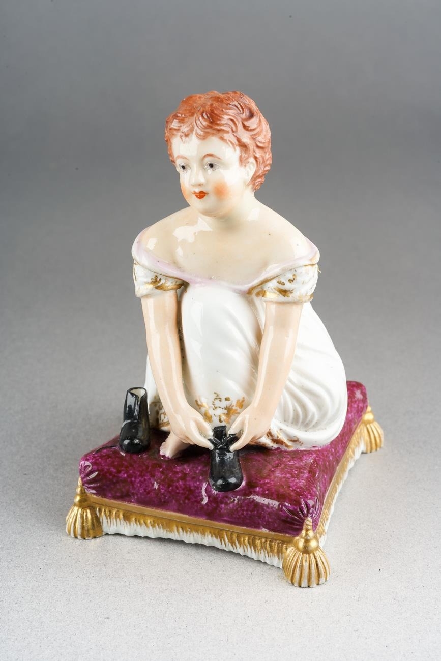 A Bloor Derby figure of a young girl, circa 1825, modelled kneeling to tie up her shoelaces, on a puce cushion with gilt tassels, red mark, approx 9.5cm high [1]