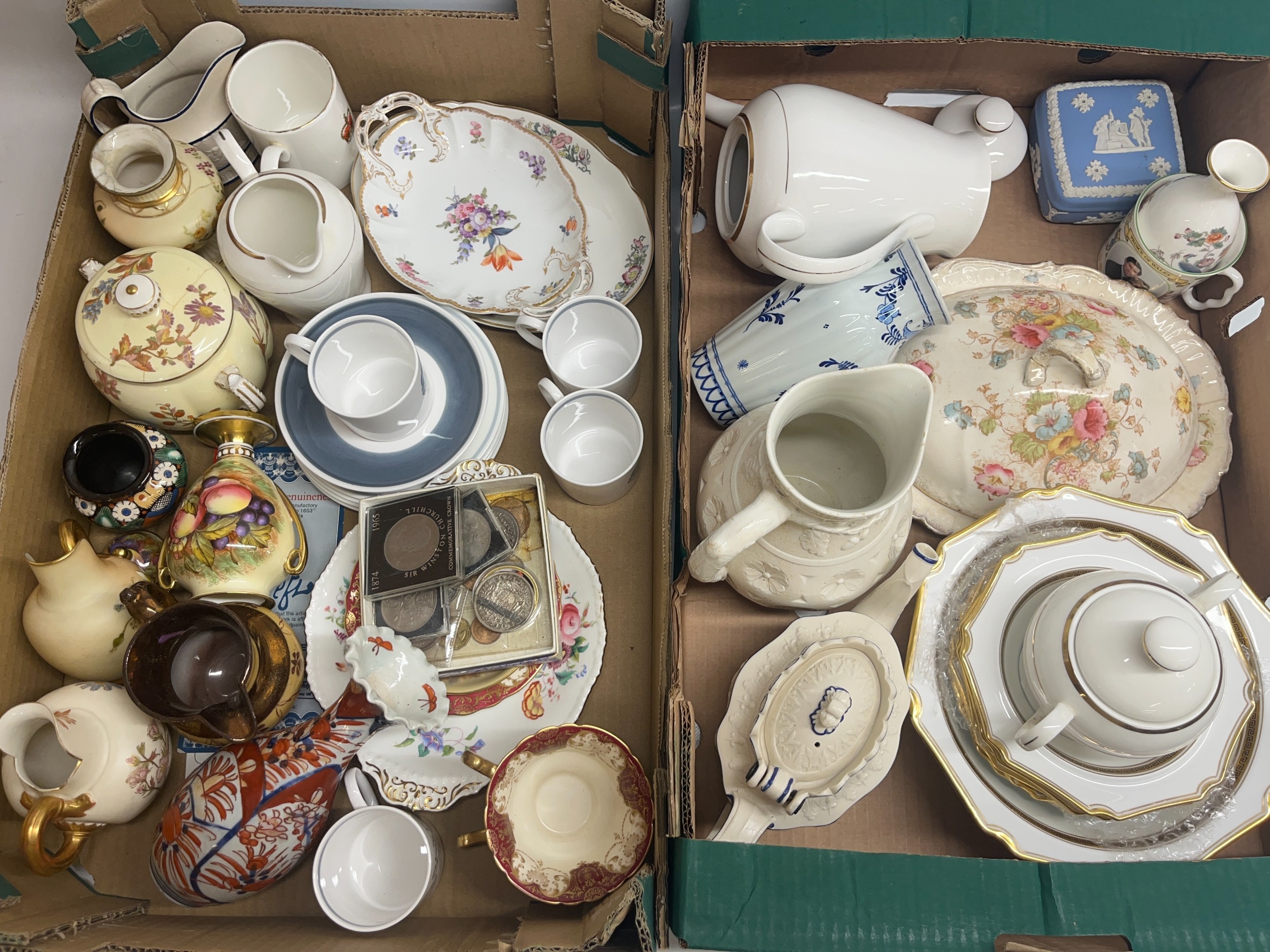 Collection of ceramics incl. Aynsley and Royal Worcester (A/F), and assorted GB coins to incl. a 1937 crown (2 boxes)