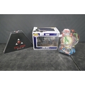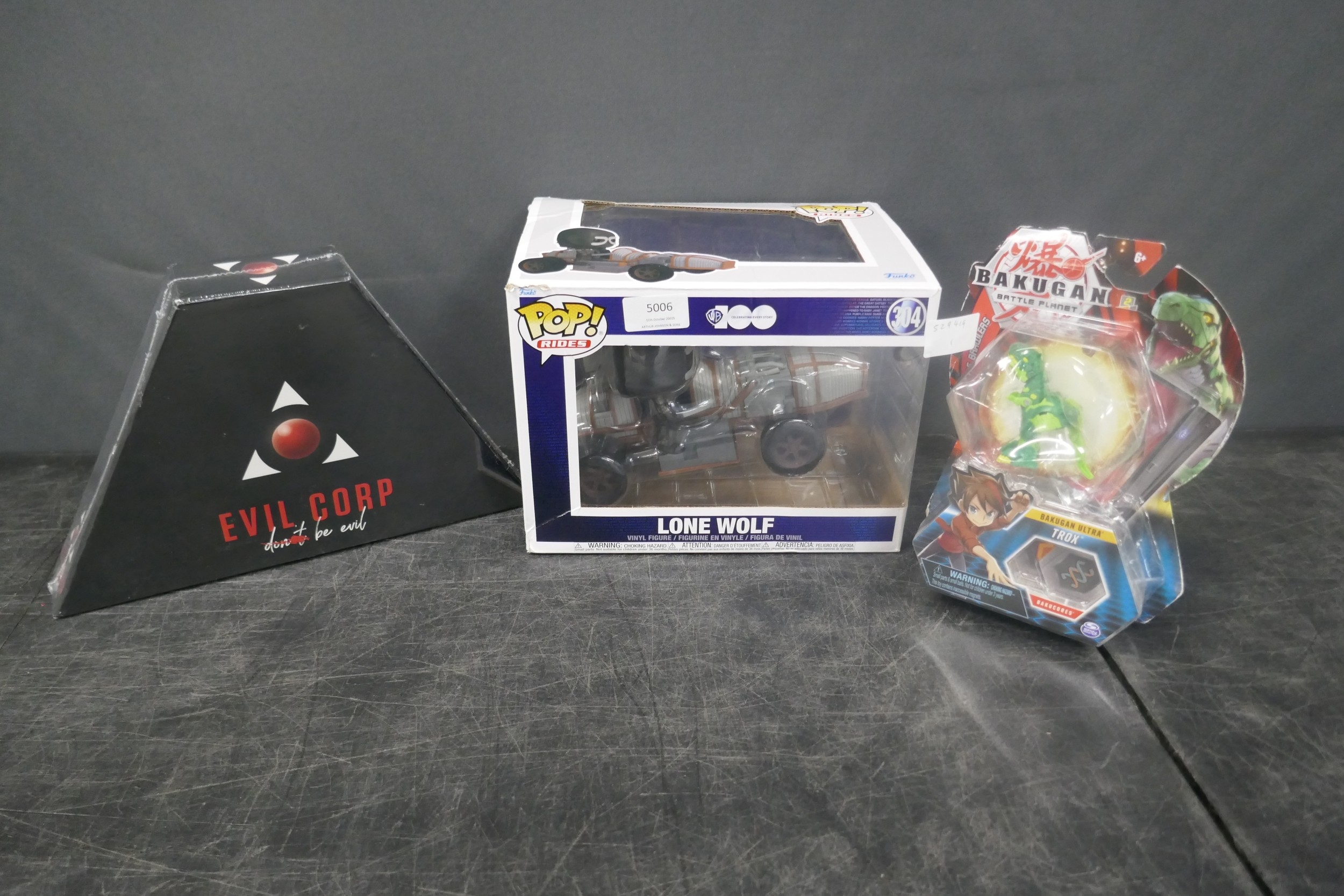 A Lone Wolf Pop! figure, a Bakugan Ultra Trox figure and an Evil Corp board game, all boxed and unused