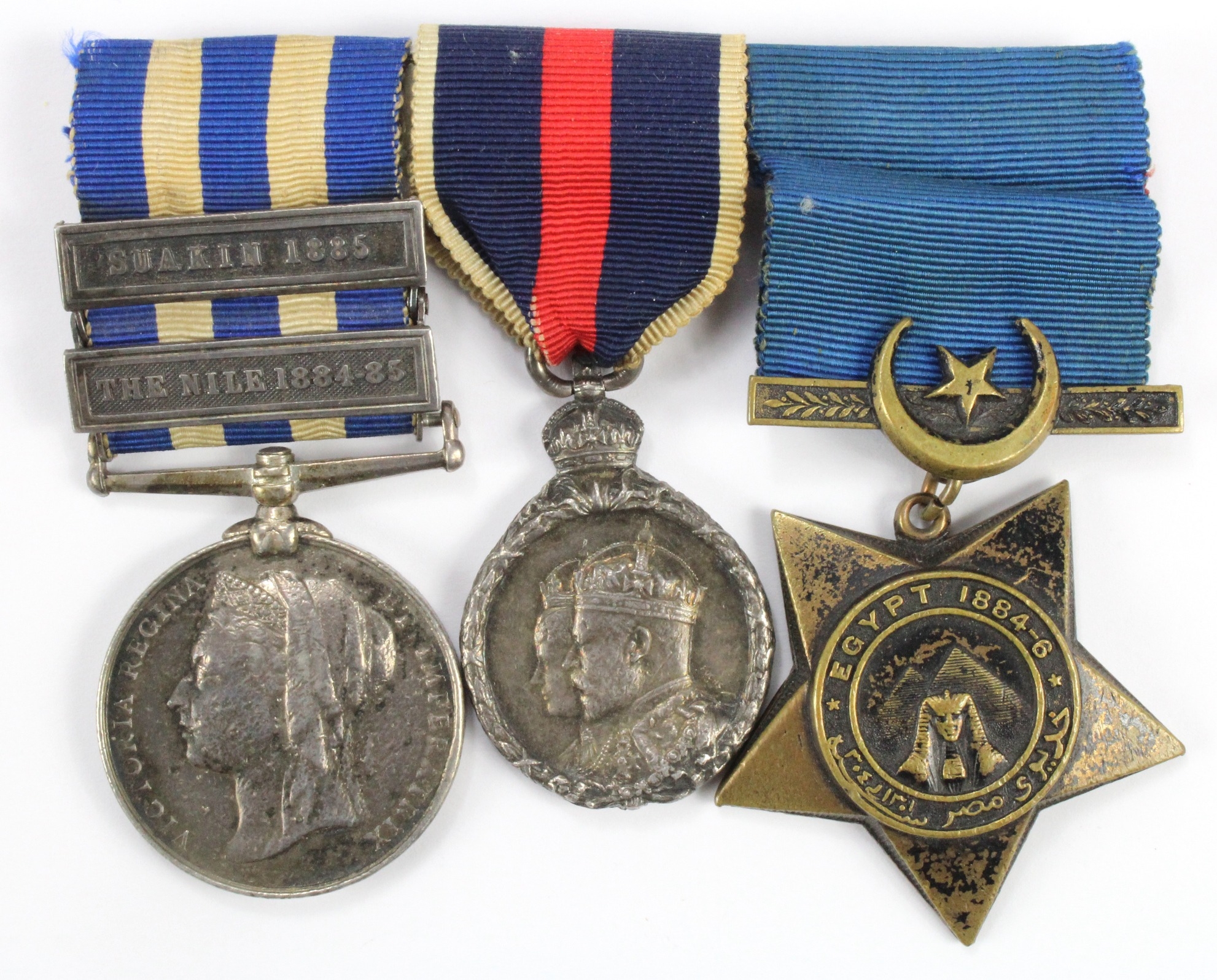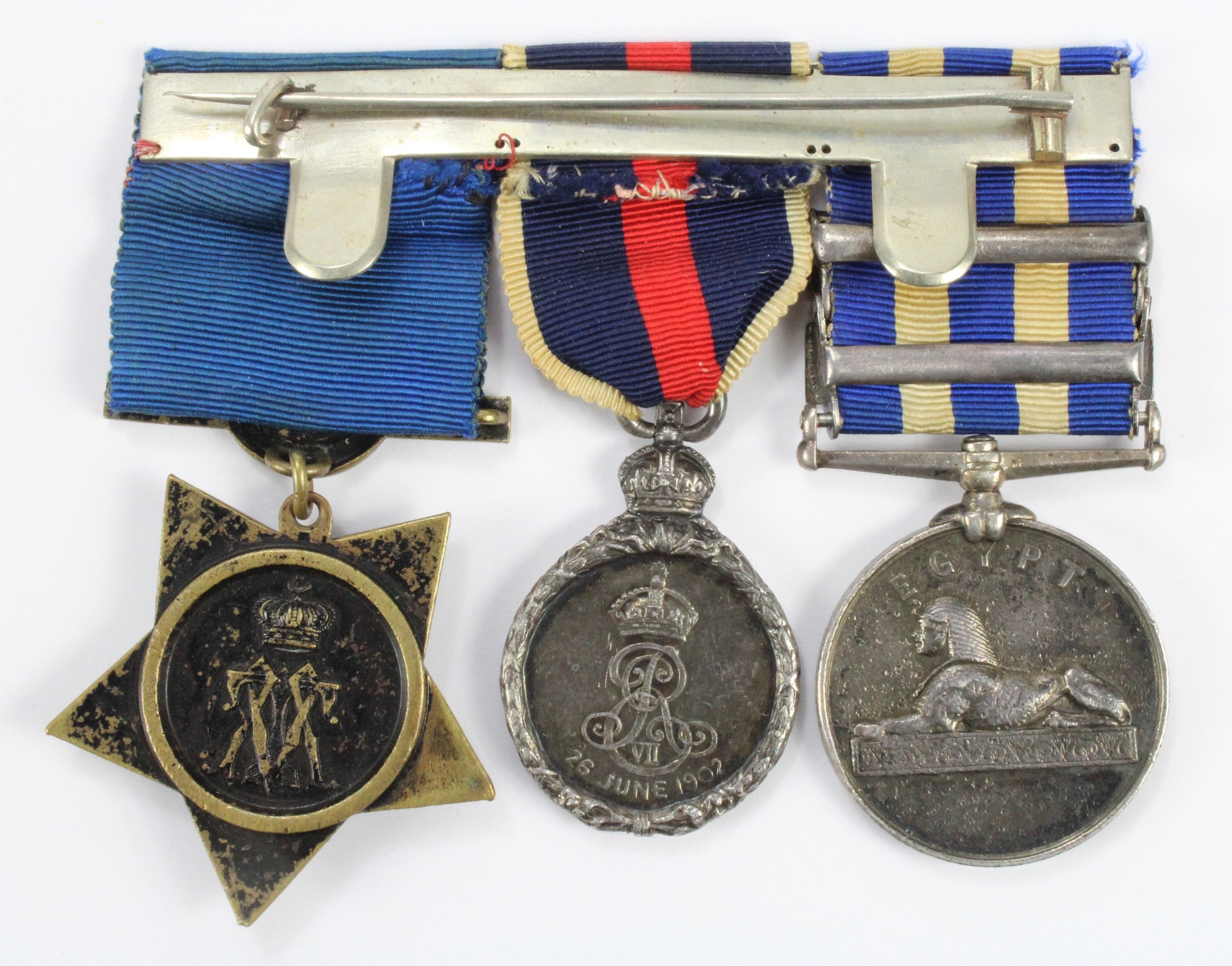 Egypt Medal 1882 (undated) with bars The Nile 1884-85 / Suakin 1885 (Lieut: A. Leetham, 20th Hussars), 1902 Coronation Medal in silver, Khedive's Star 1884-6. Later Lieut Col Sir A Leetham KCVO and CMG, Knight of Grace, Order of St John of Jerusalem. Society of Yorkshiremen in London, CEO of the United Service Institution for 24 Years, etc. Served West Norfolk Militia, 20th & 13th Hussars, Royal Monmouthshire. Private Secretary during the Boer War to Lord Raglan Under-Secretary for War, and during the European War he was a personal assistant at the War Office to Lord Kitchener. Suakin clasp confirmed to roll. KCVO L/G 3/6/1924. CMG L/G 3/6/1918. With research file (3)