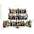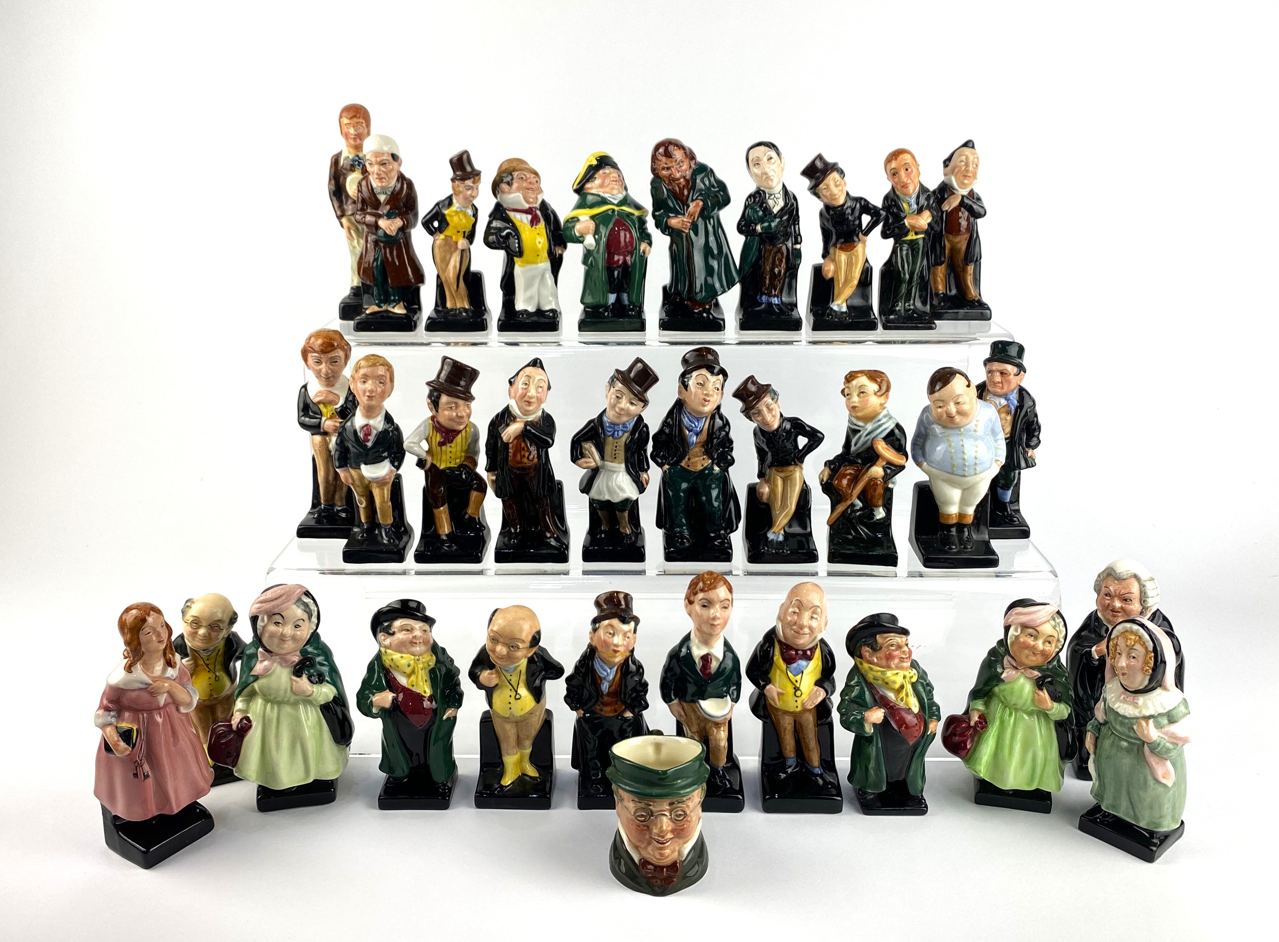 A collection of thirty-two Royal Doulton Dickens series figures, including; Jingle (x2), Dick Swiveller, David Copperfield (x2), Stiggins, Uriah Heep, Sam Weller, Tony Weller, Fat Boy, Bumble, Bill Sikes, Fagin, Artful Dodger (x2), Oliver Twist (x2), Tiny Tim, Scrooge, Micawber, Captain Cuttle, Trotty Veer, Pickwick (x2), Pecksniff (x2 - one A/F), Sairy Gamp, Little Nell, Mrs. Bardell, Buzfuz, together with a Mr. Pickwick miniature Royal Doulton character jug, the tallest height 13cm