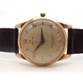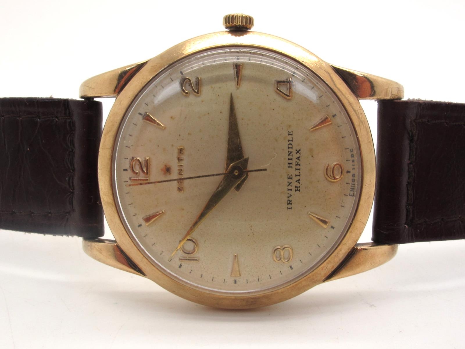 Zenith; A 9ct Gold Cased Vintage Gent's Wristwatch, the signed dial also marked "Irvine Hindle Halifax", with Arabic numerals and centre seconds, the movement stamped "Zenith 18 Jewels" and numbered "4720398"within plain case, London 1963, on a strap with 9ct gold buckle.