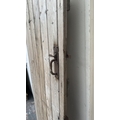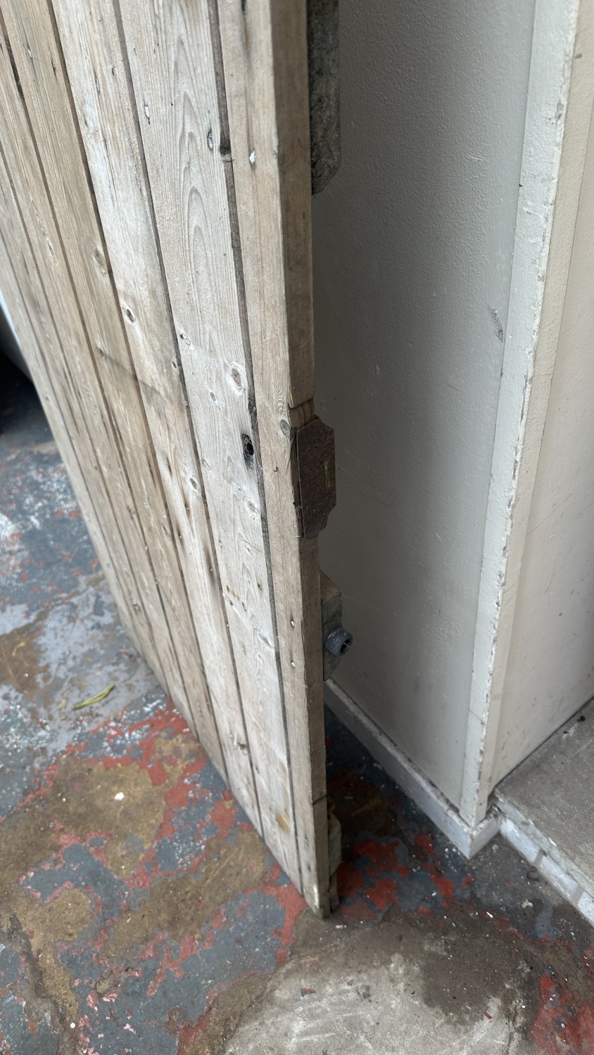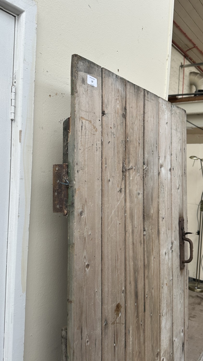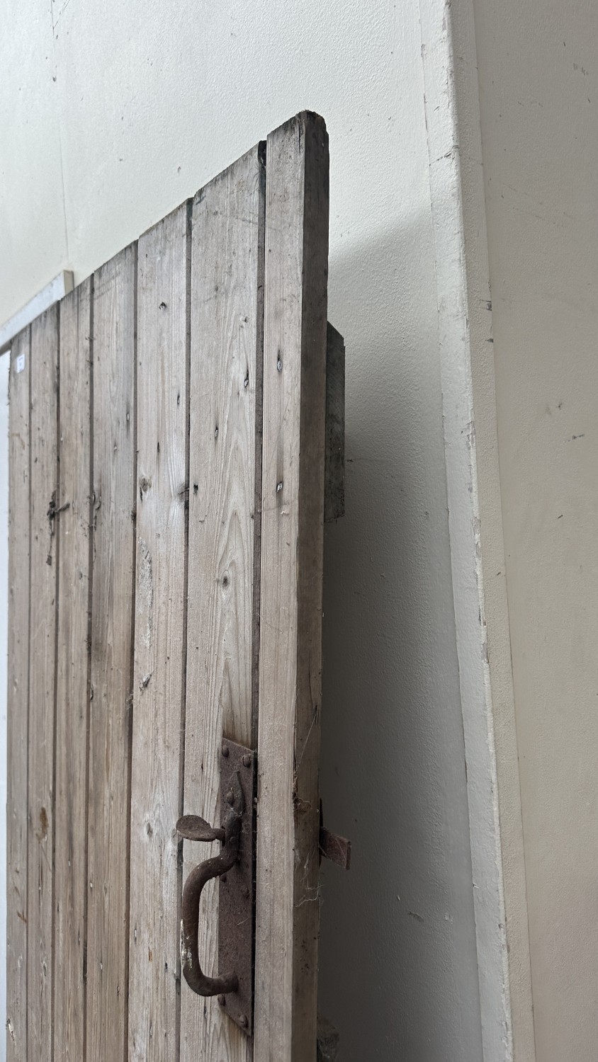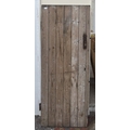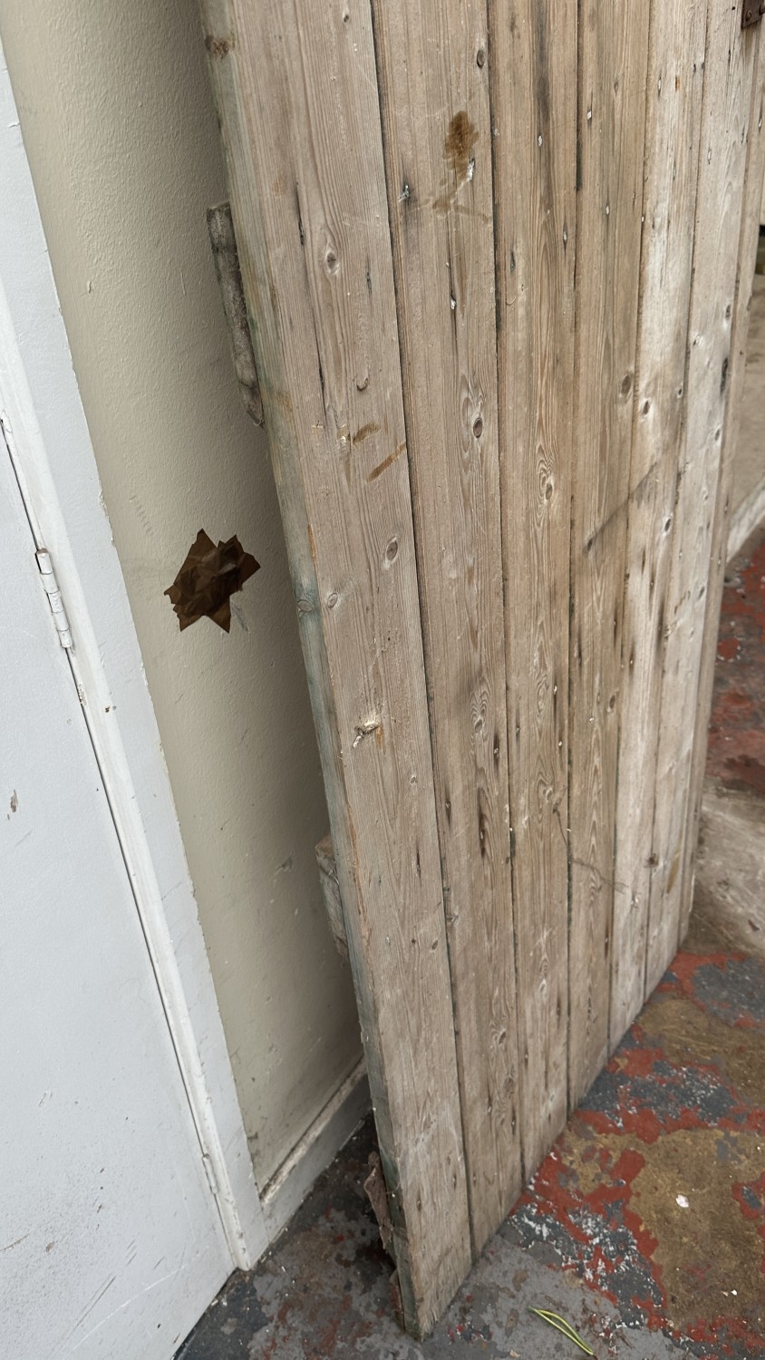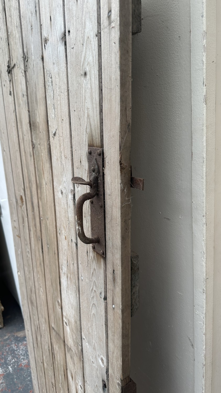 A vintage wooden exterior door with metal hinges and latch - approx. 192cm high x 74cm wide