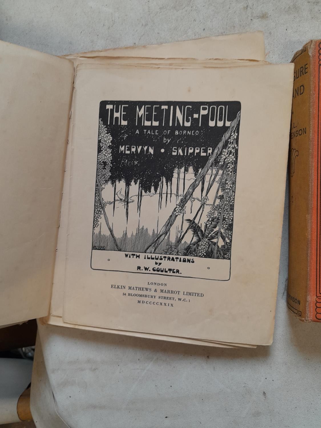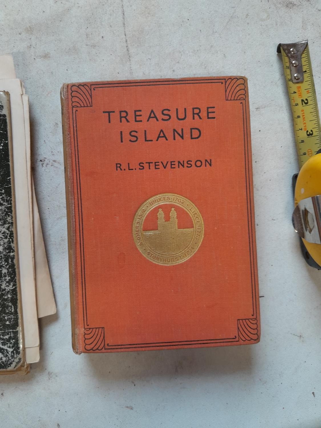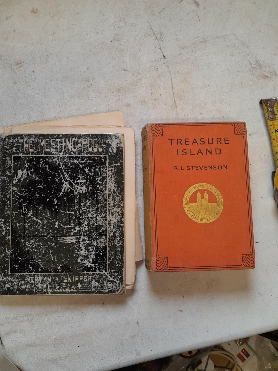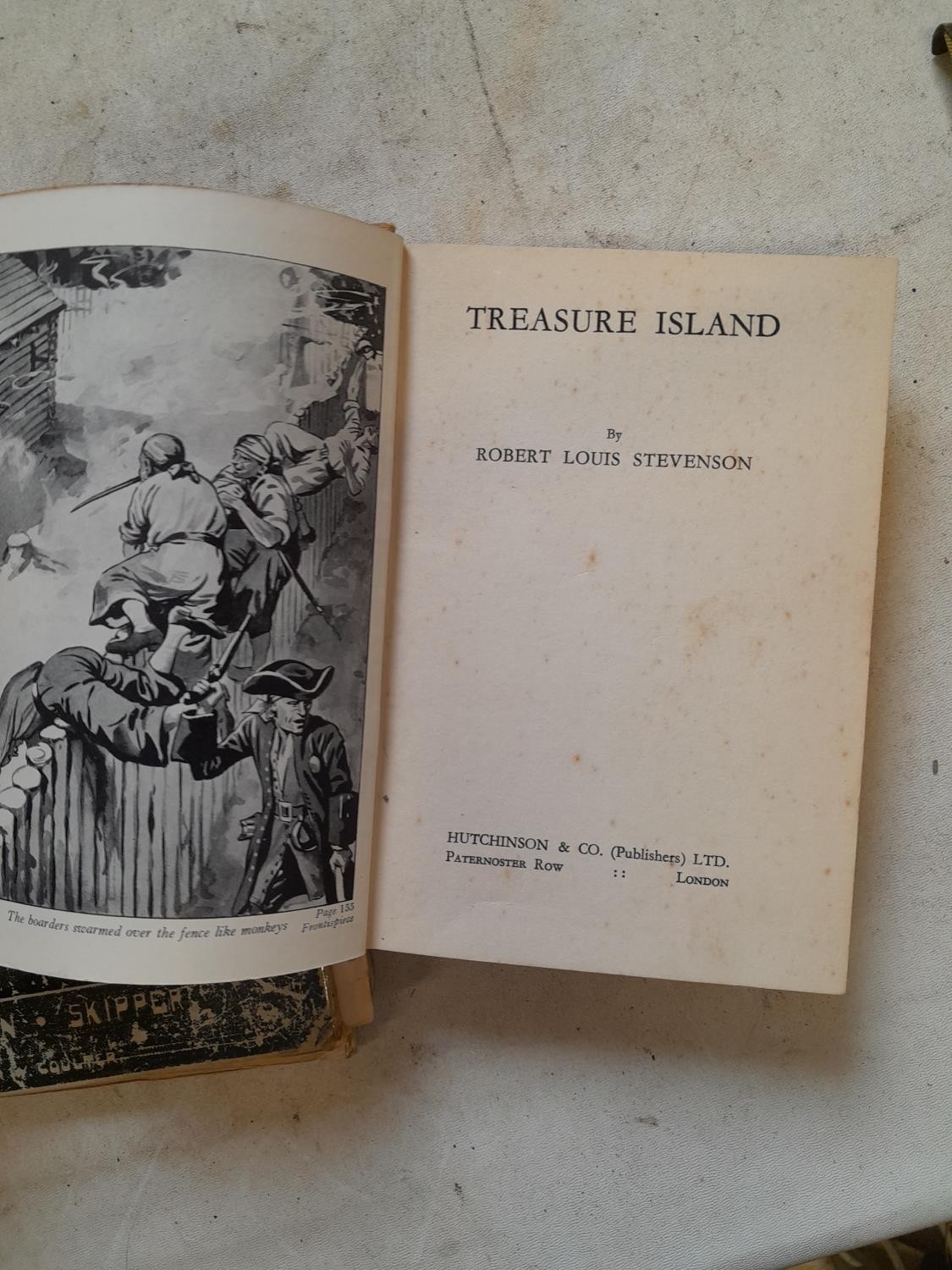 Two Volumes : The Missing Pool, poor condition, loose but decorative plates suitable for repurposing & Treasure Island Hutchinson & Co publisher early edition