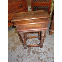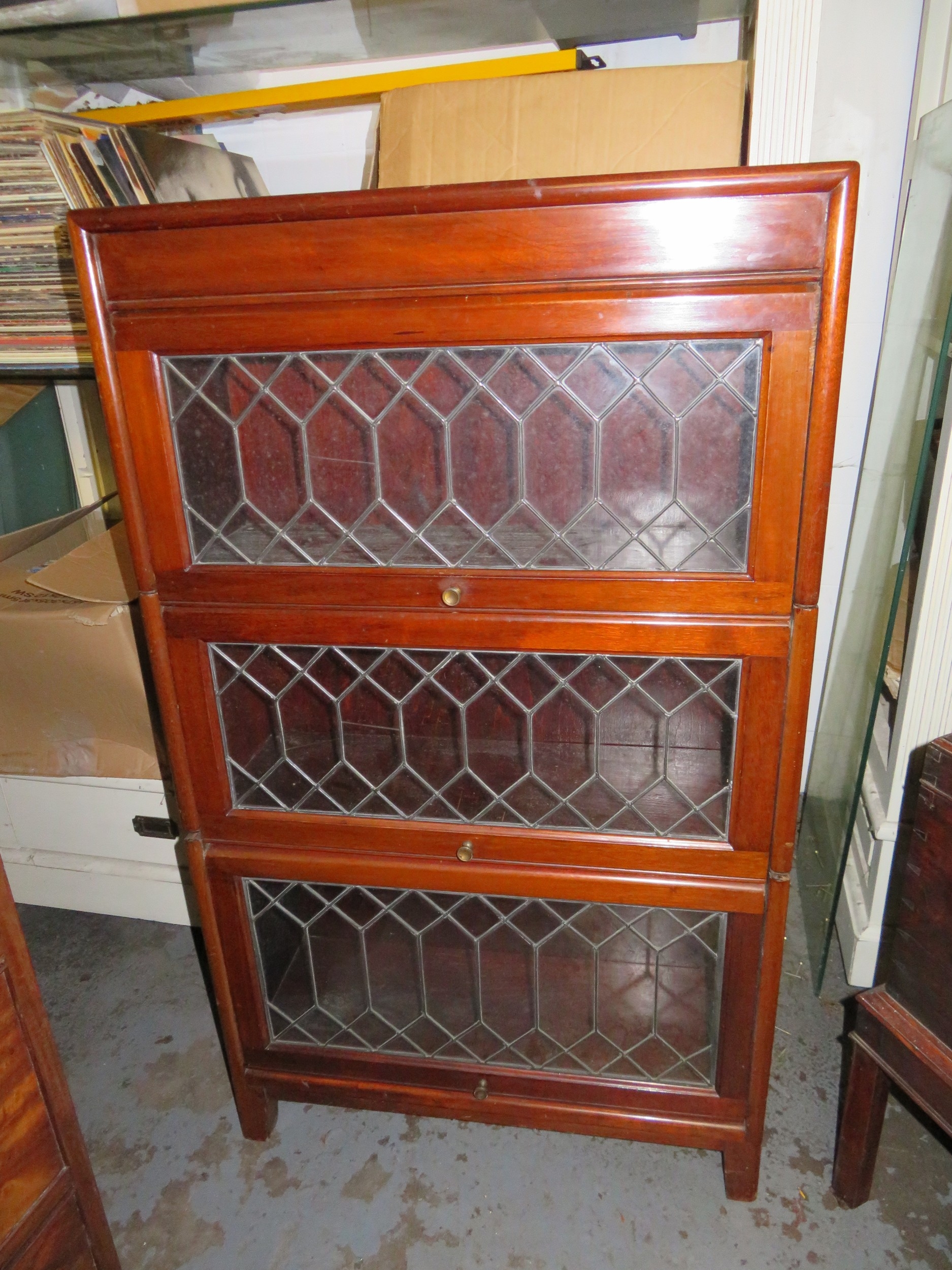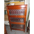Mahogany three section graduated bookcase with leaded light glass panels to front