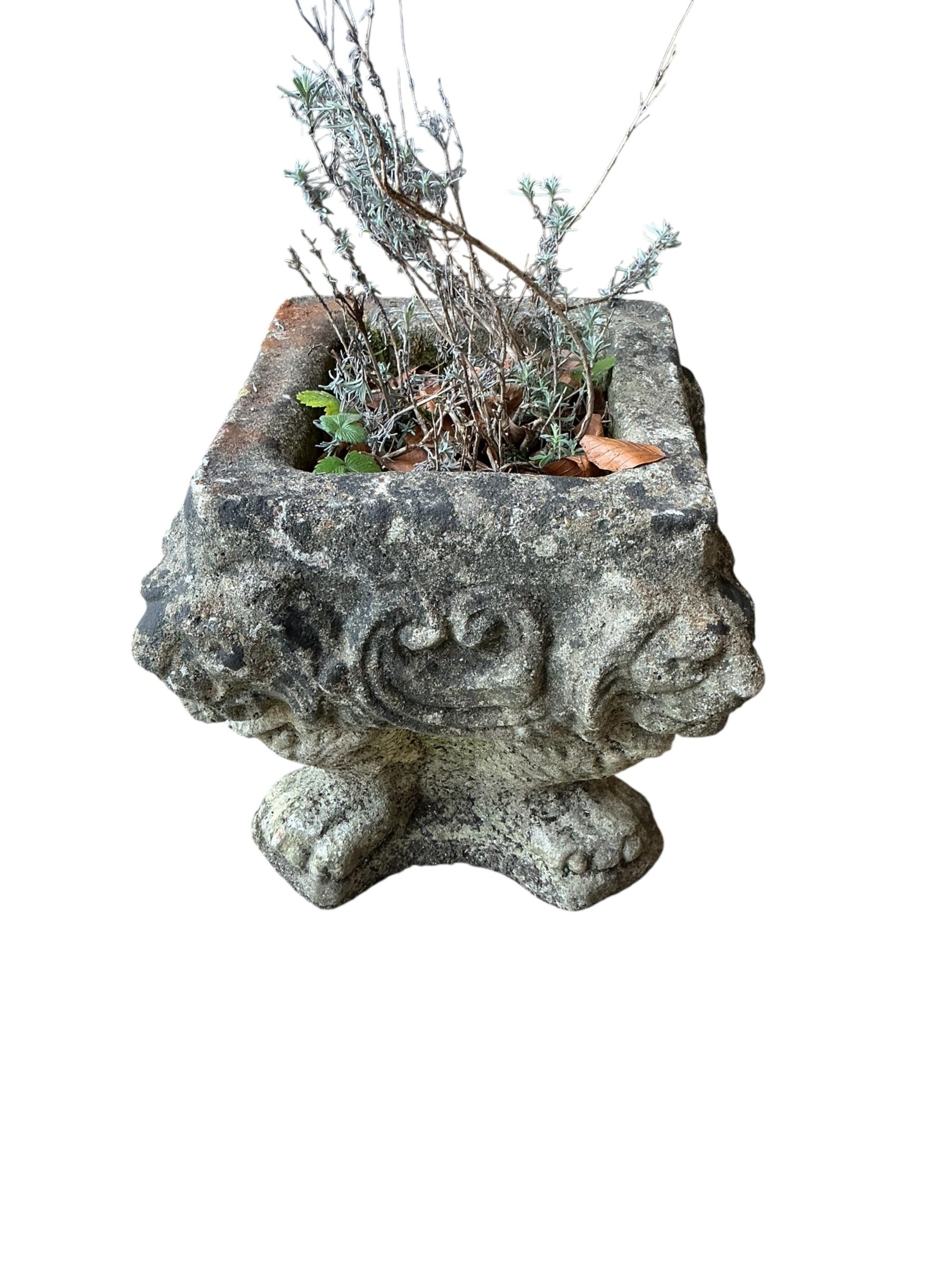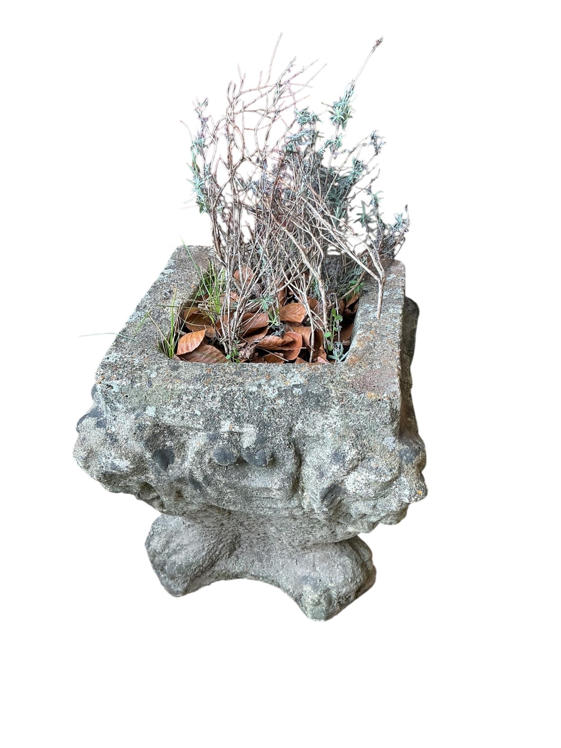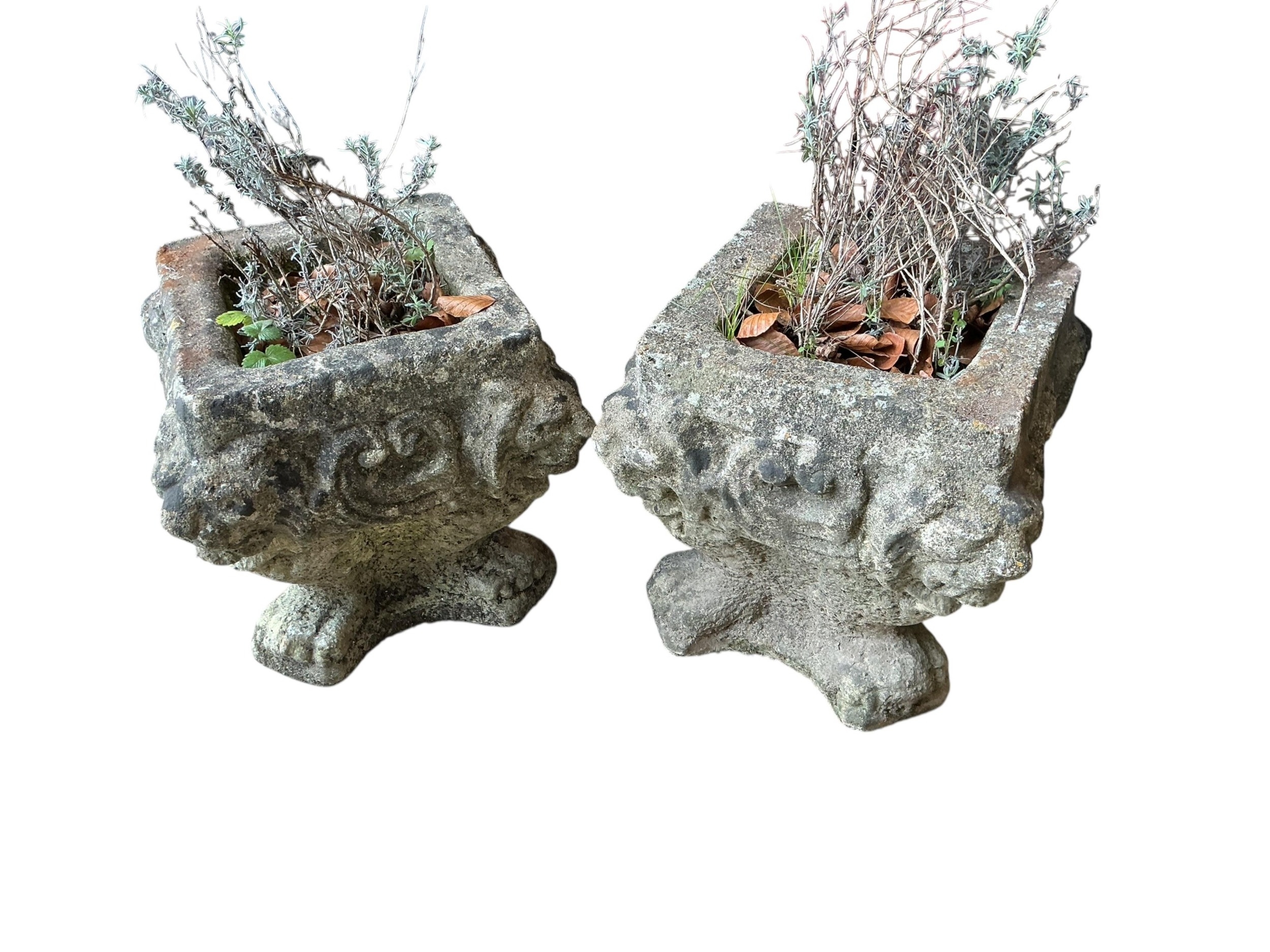 A pair of square reconstituted stone garden planters width 32cm, height 34cm.