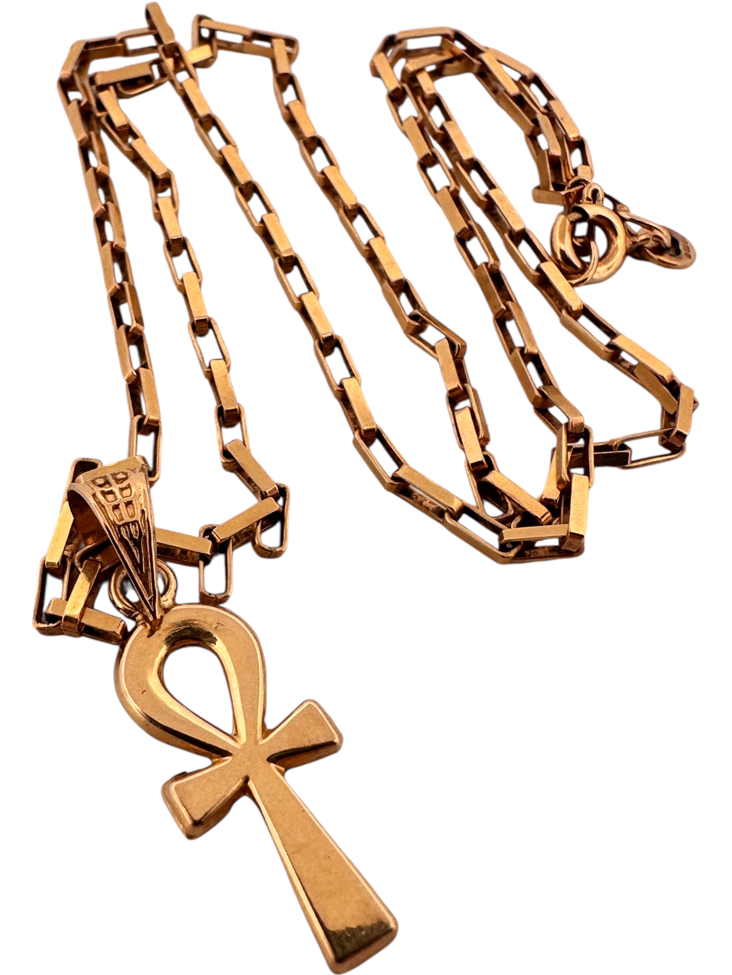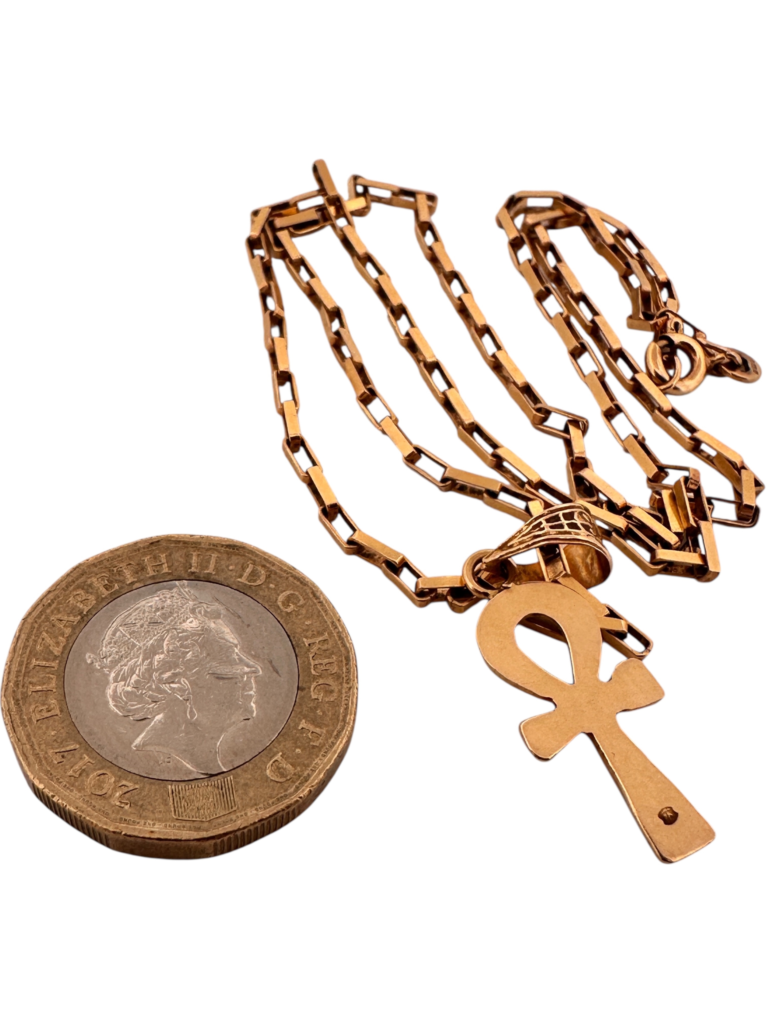 Nine Carat Gold Box Link 17" Chain 4.37g with Eighteen Carat Gold Egyptian Ankh Cross. 1.8g.