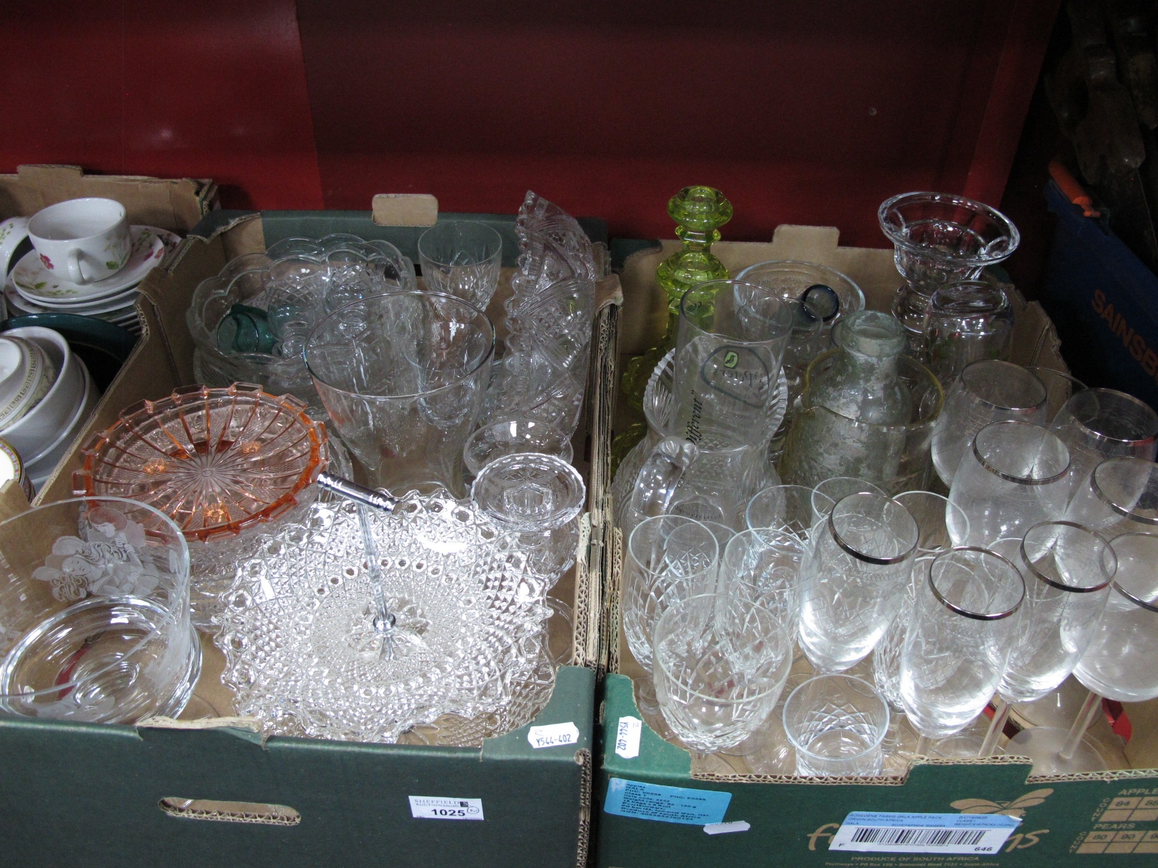 Glassware to include pair of vaseline cancelsticks, various bowls some cut glass, jugs, wine and champagne galssss. 2 Boxes.