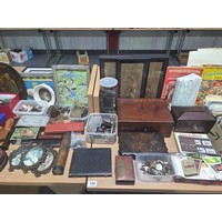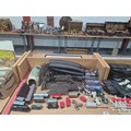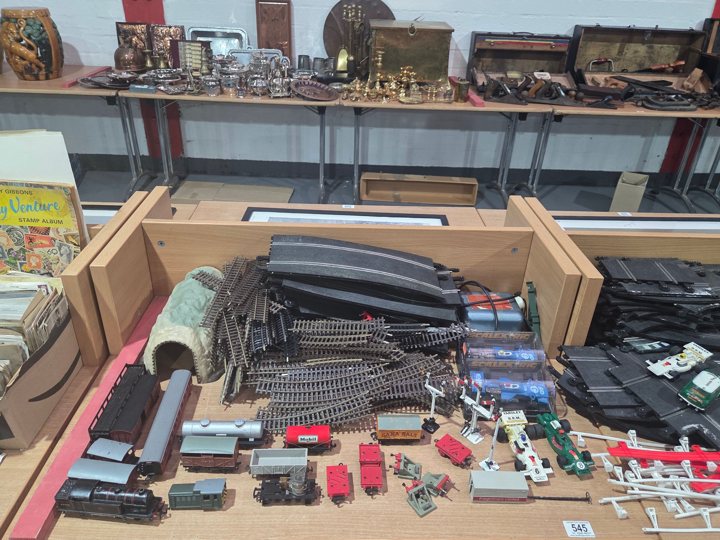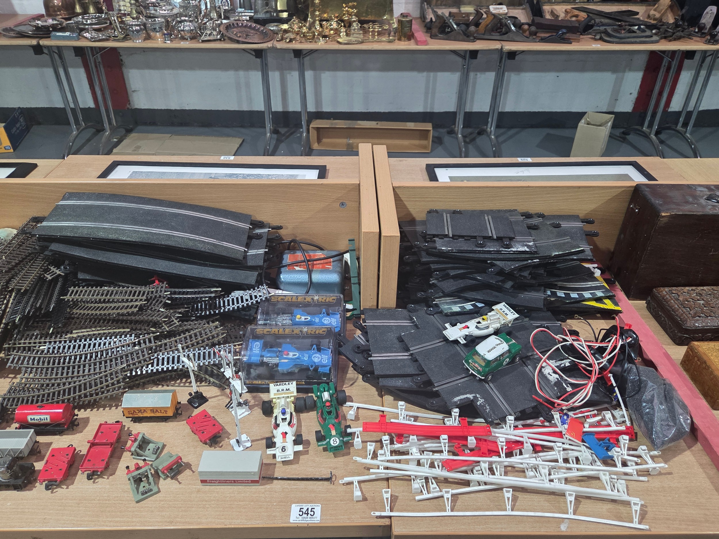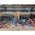 A Scalextric set together with model railway track, carriages, trains, etc