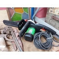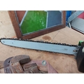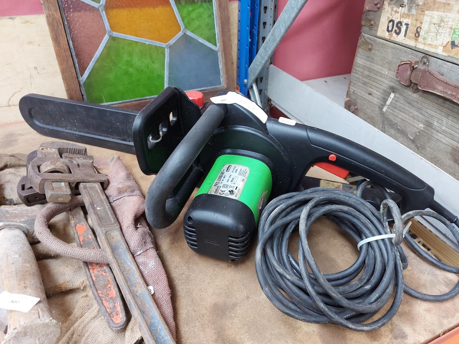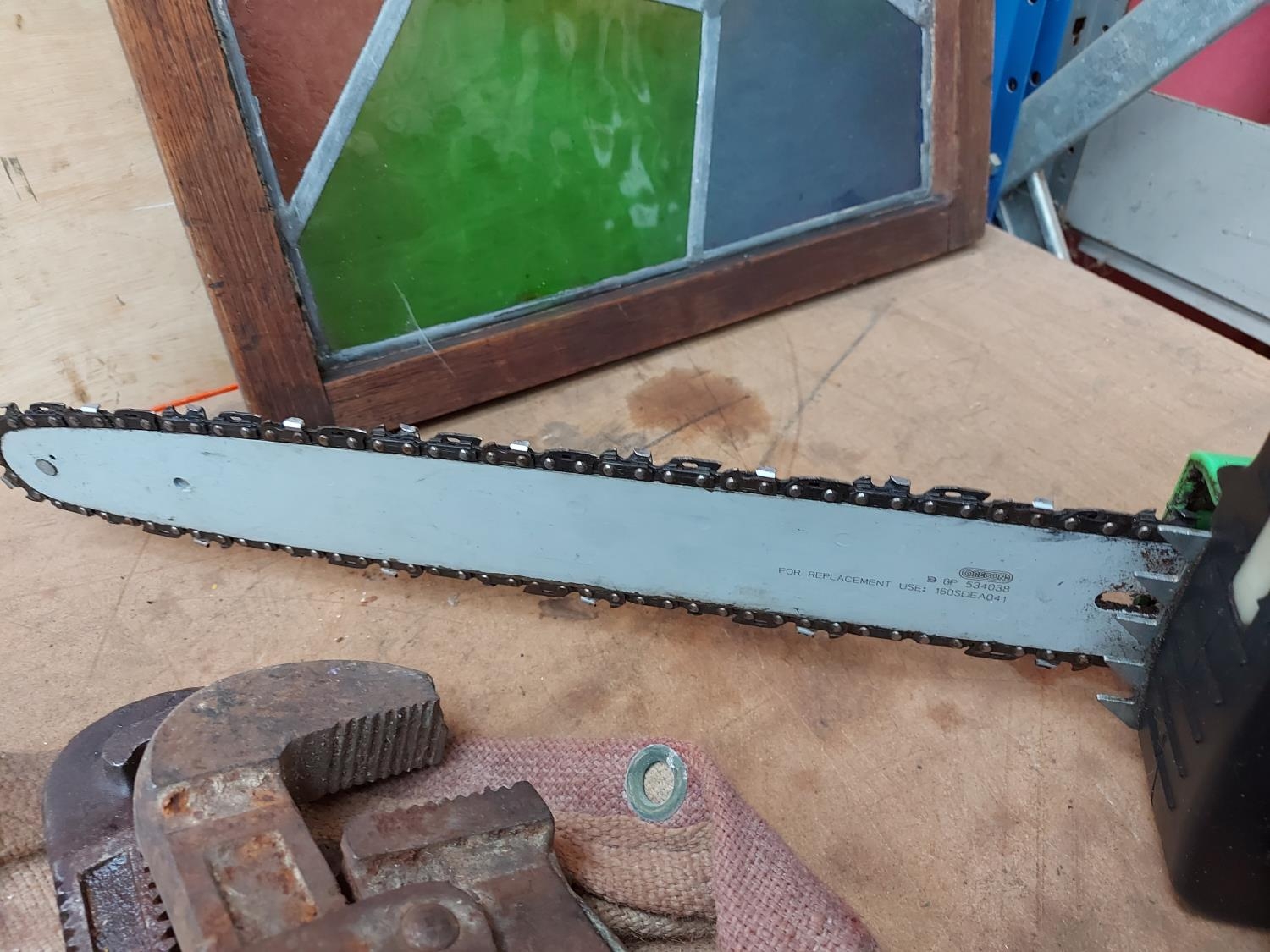 A black and green Florabest FKS 220009 electric chainsaw with 15" bar and a chrome mixer tap