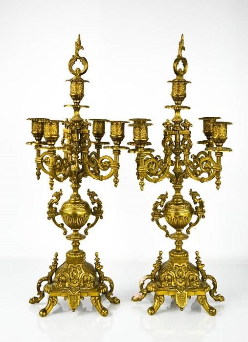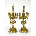 A pair of brass candleabra, with five candle sockets, raised on decoratively cast bases.