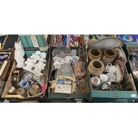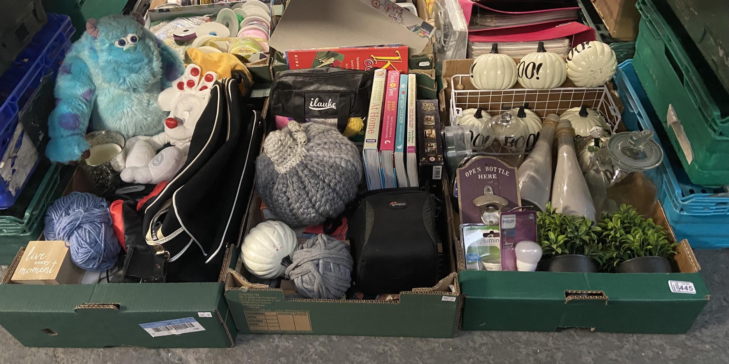 3 Boxes containing knitting yarn, home decor items, cooking books etc