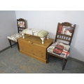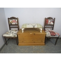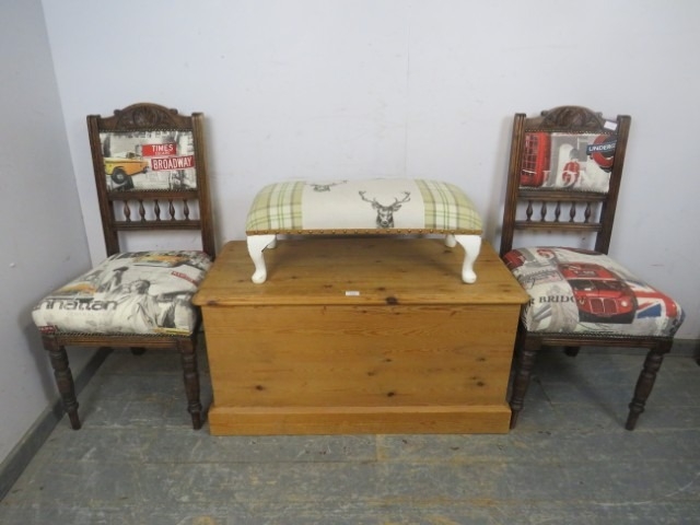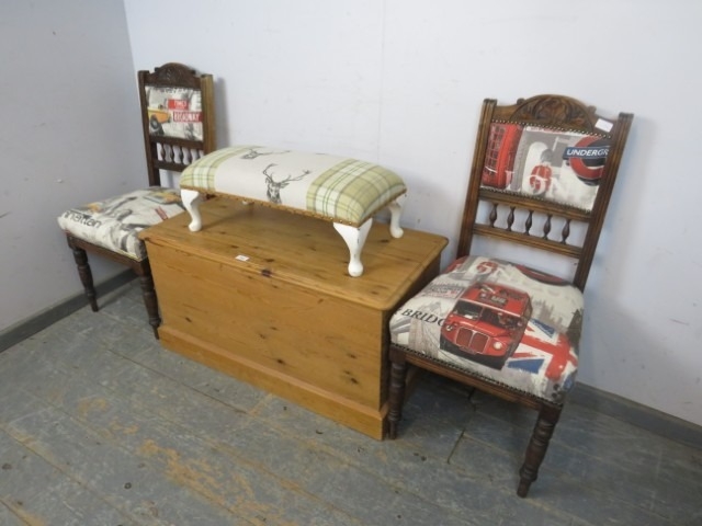 A modern pine blanket chest, a footstool and a pair of Edwardian over stuffed dining chairs (4 items). H49cm x W97cm x D48cm approx.