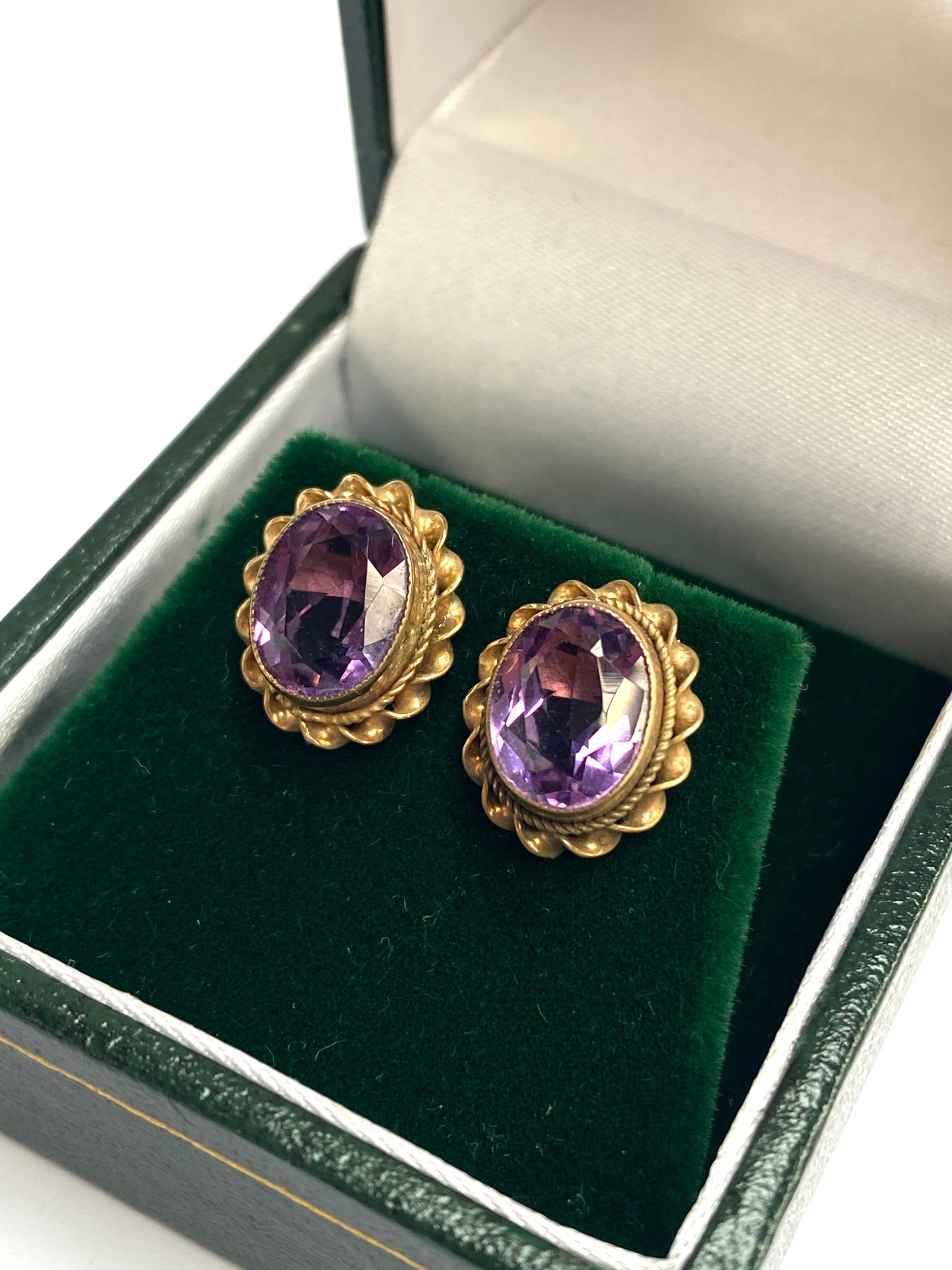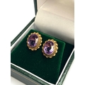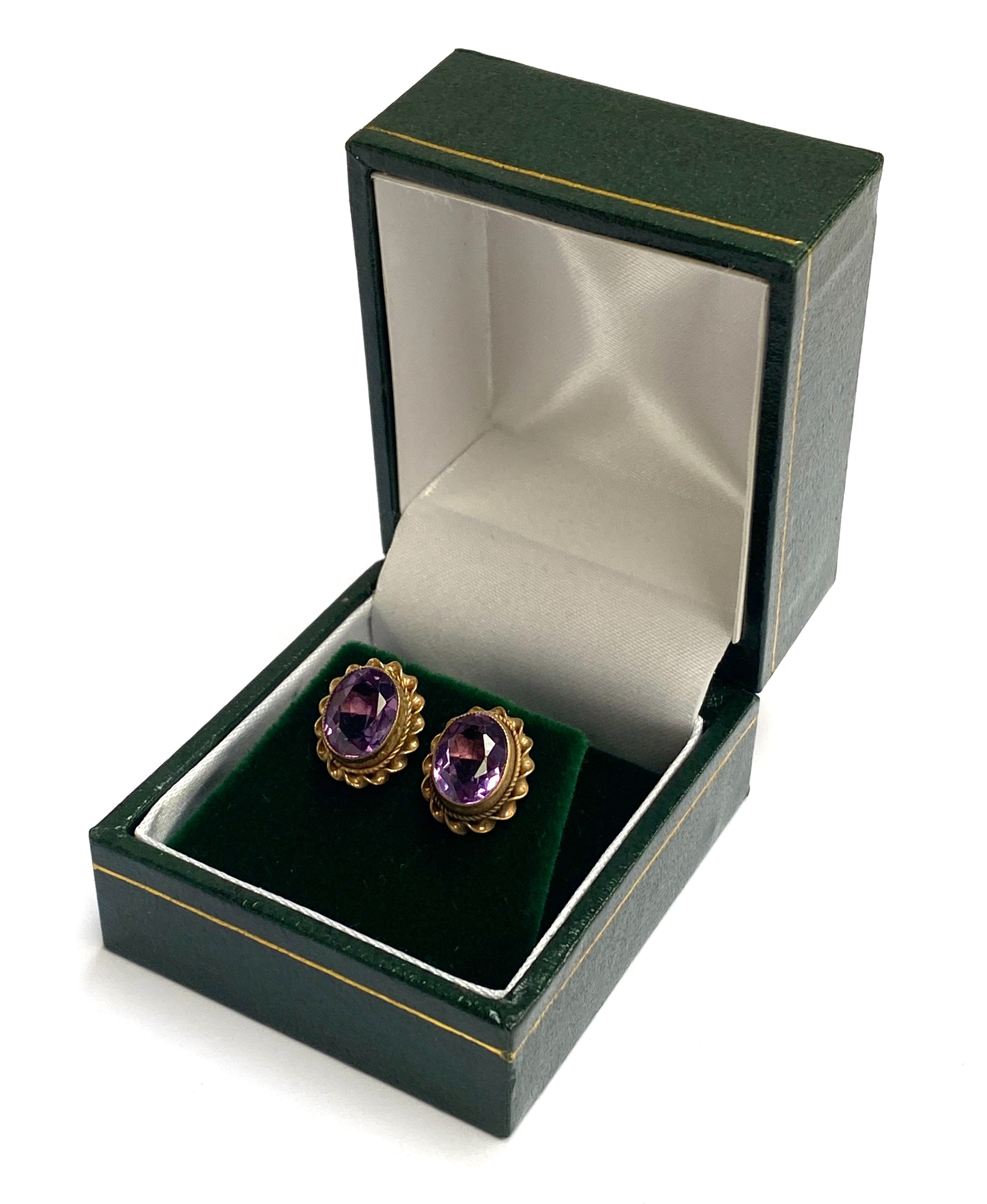 A pair of 9ct gold amethyst stud earrings, 1.2cmL, gross weight 2.7g