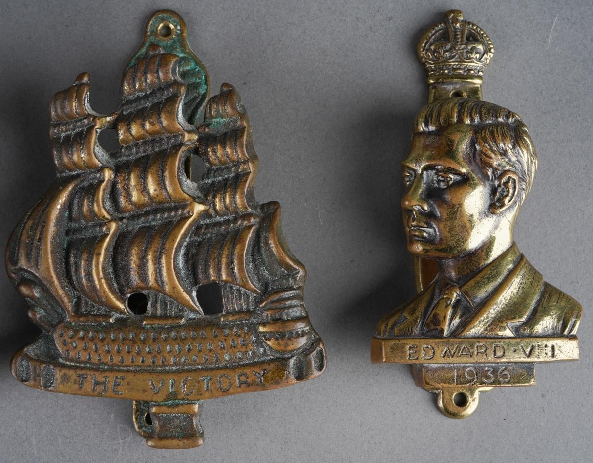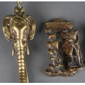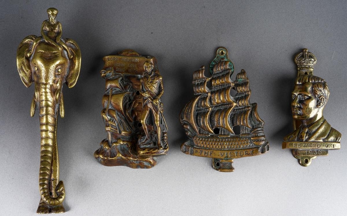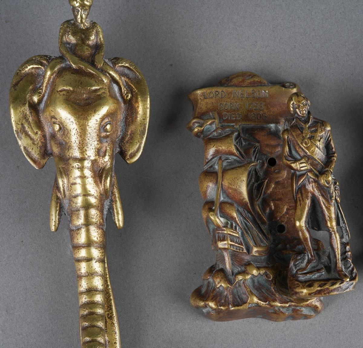 A collection of 3 brass doorknockers to include The Victory ship, Lord Nelson and Edward VIII together with bronze elephant nocker ( also a nut cracke), tallest approx. 18 cm ( 1 bag)