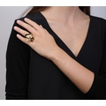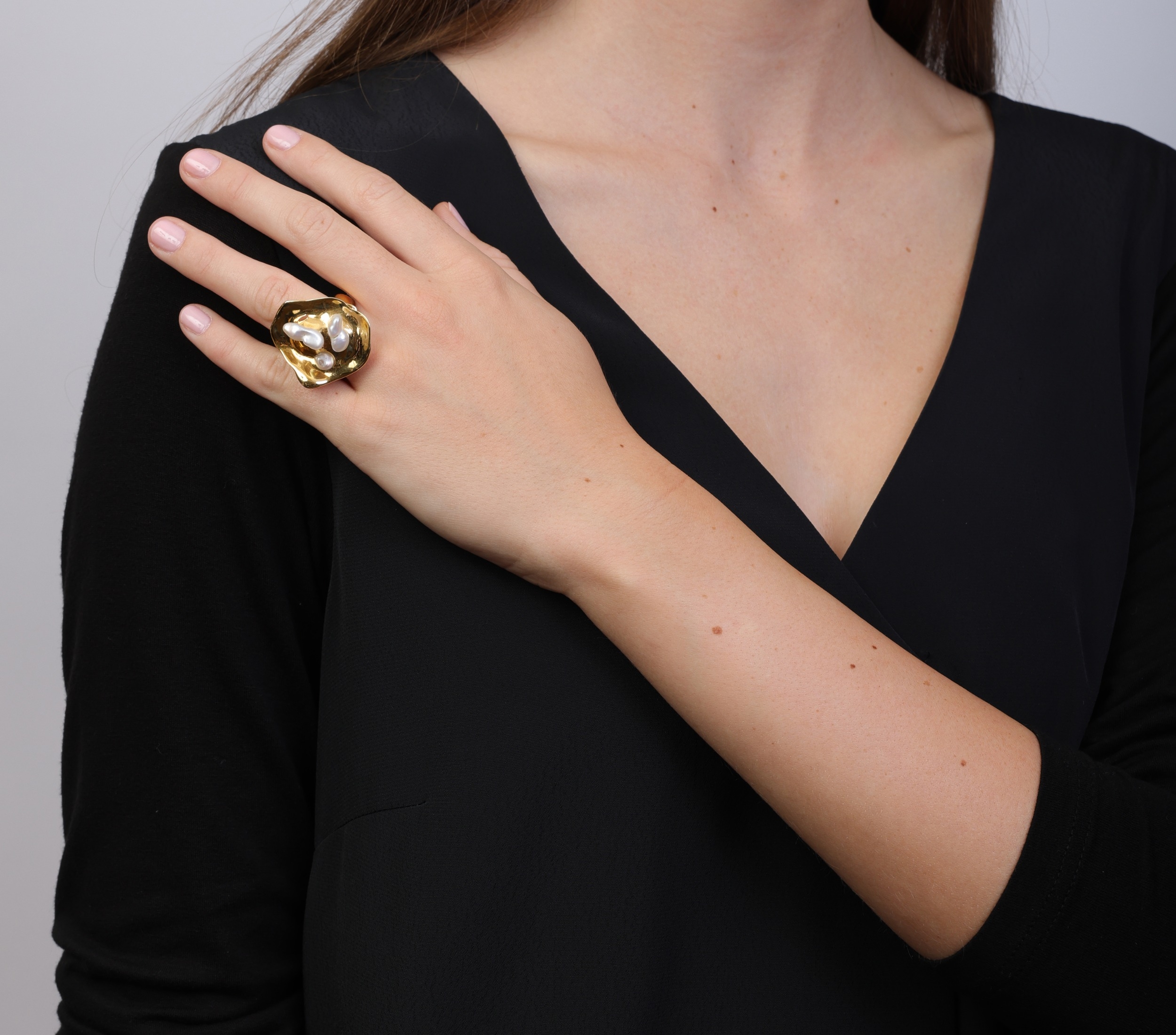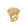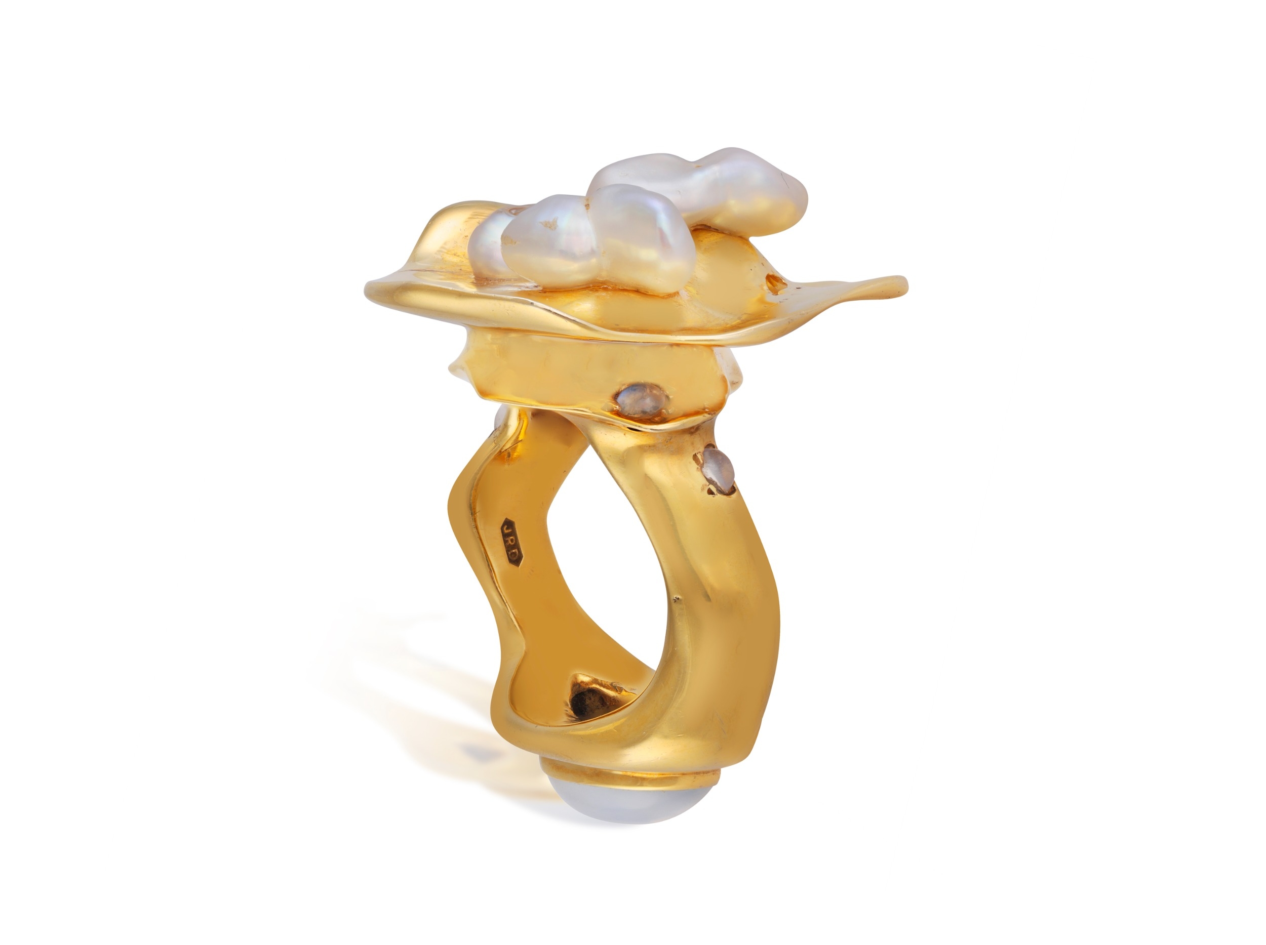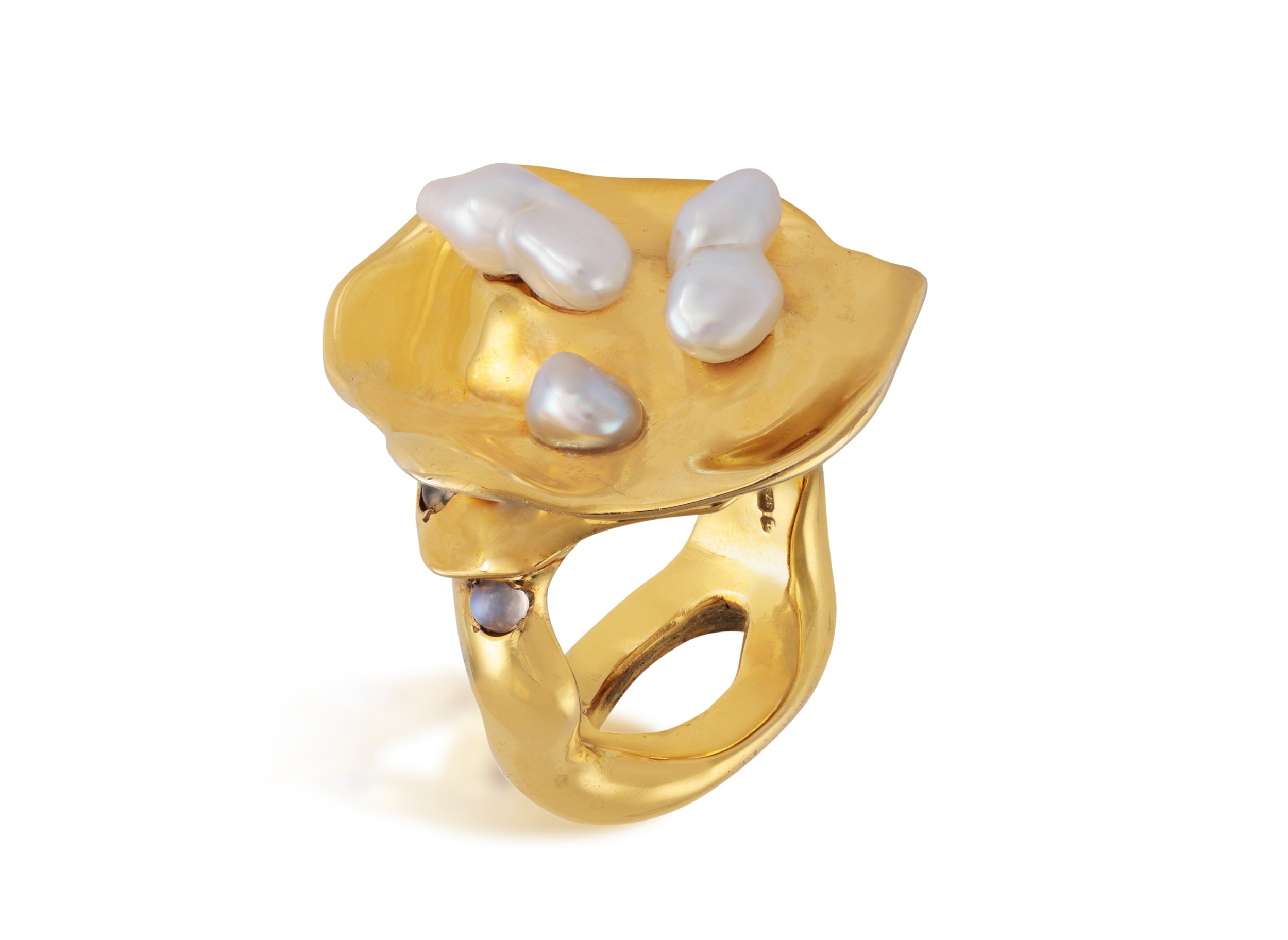 ORNA: A 9K GOLD, FRESHWATER CULTURE PEARL AND MOONSTONE RING Of polished abstract design, the front set with three freshwater cultured pearls, reverse and shoulders set with cabochon moonstone, mounted in 9K gold, British maker’s mark ‘JRD’ and hallmarks, ring size Q
