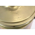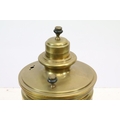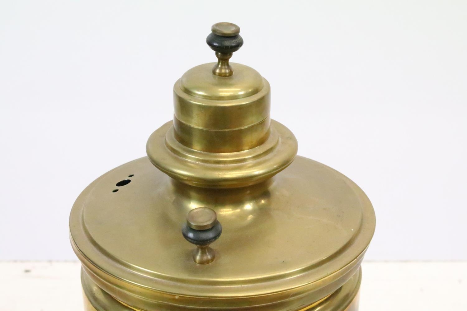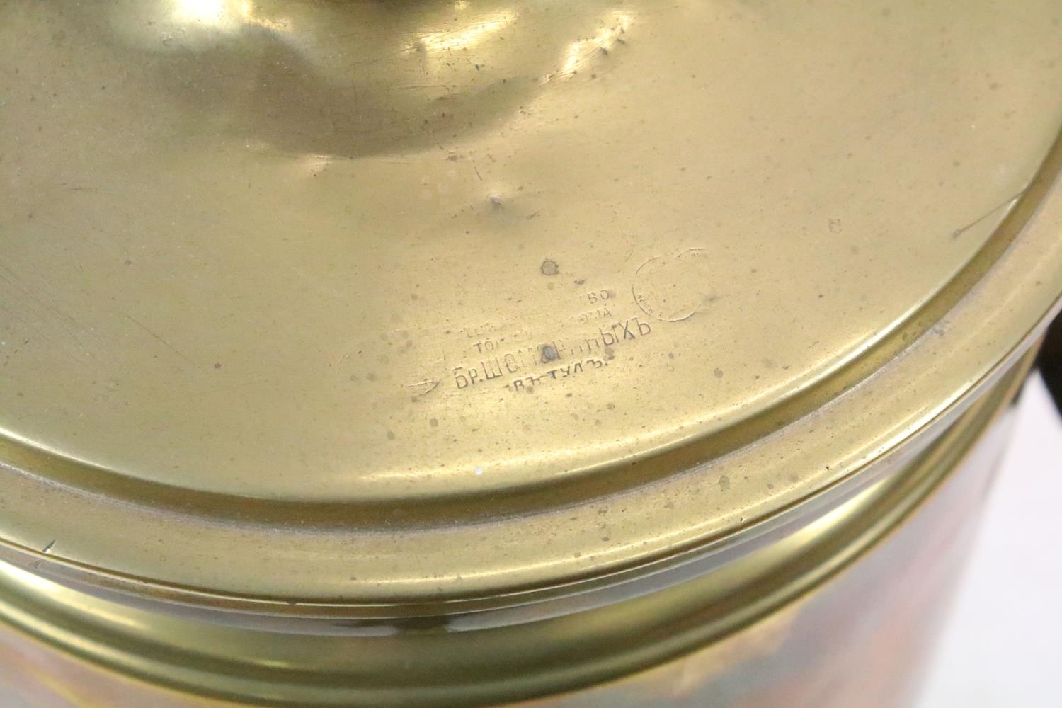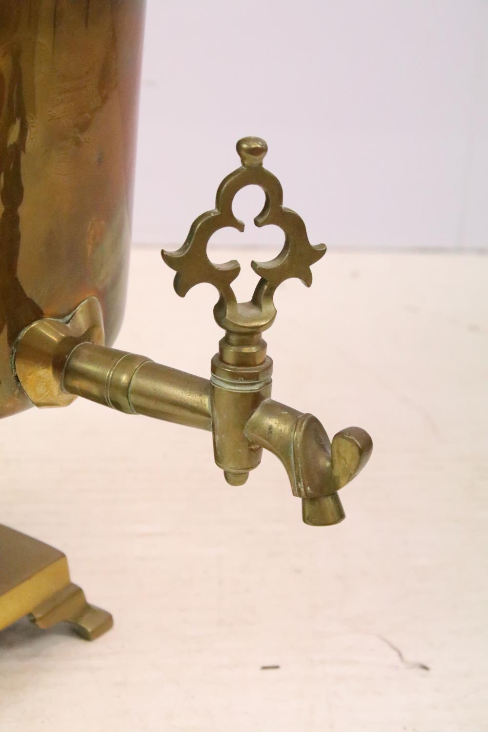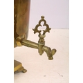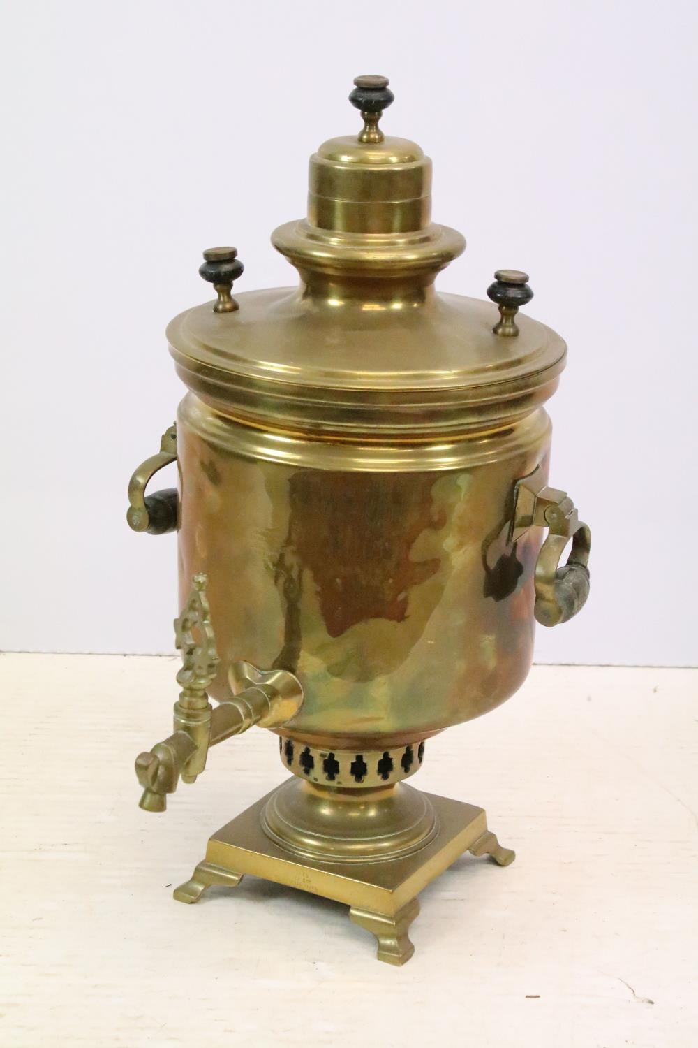 Brass twin-handled samovar, with quatrefoil design pierced base, on four feet, Russian inscription above tap, 55cm high