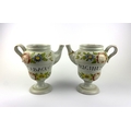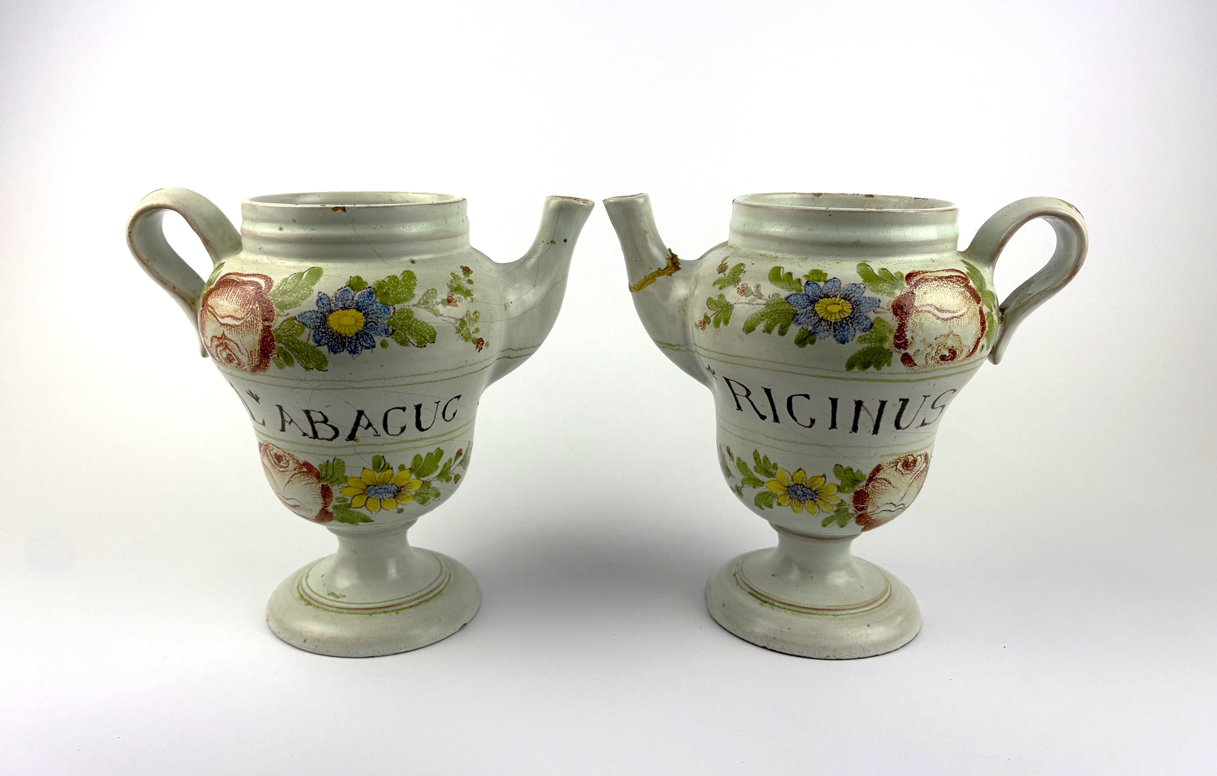 A pair of Italian maiolica Albarello jugs (wet drug jars), inscribed 'OL ABACUS' and ' RICINUS', 21cm high, (damaged).