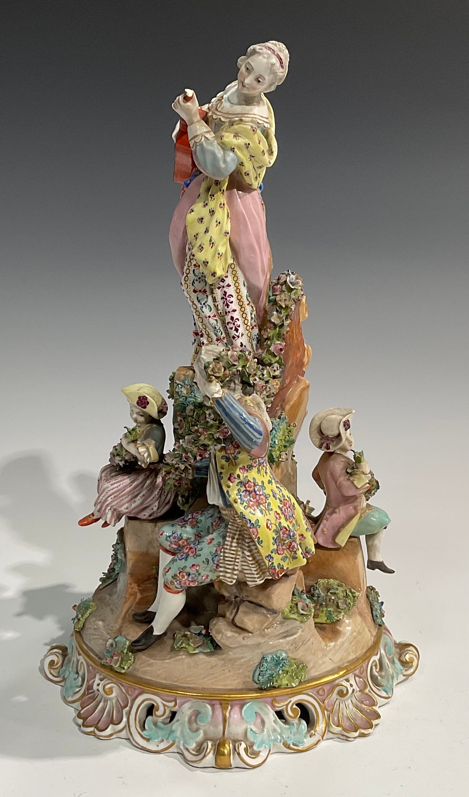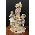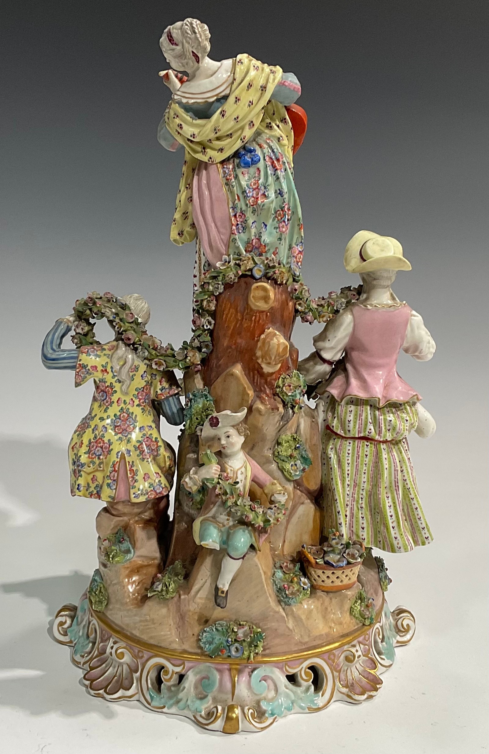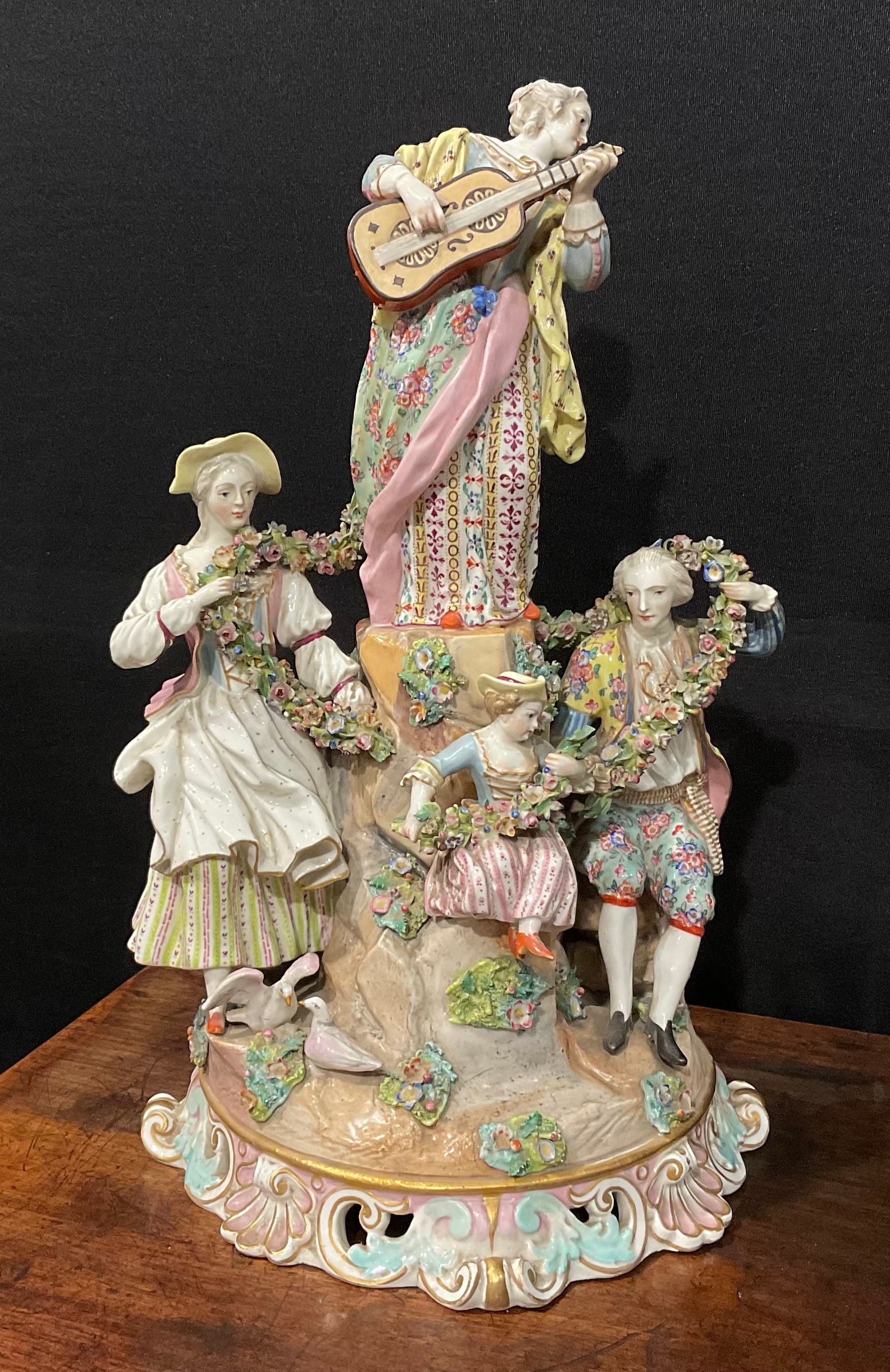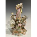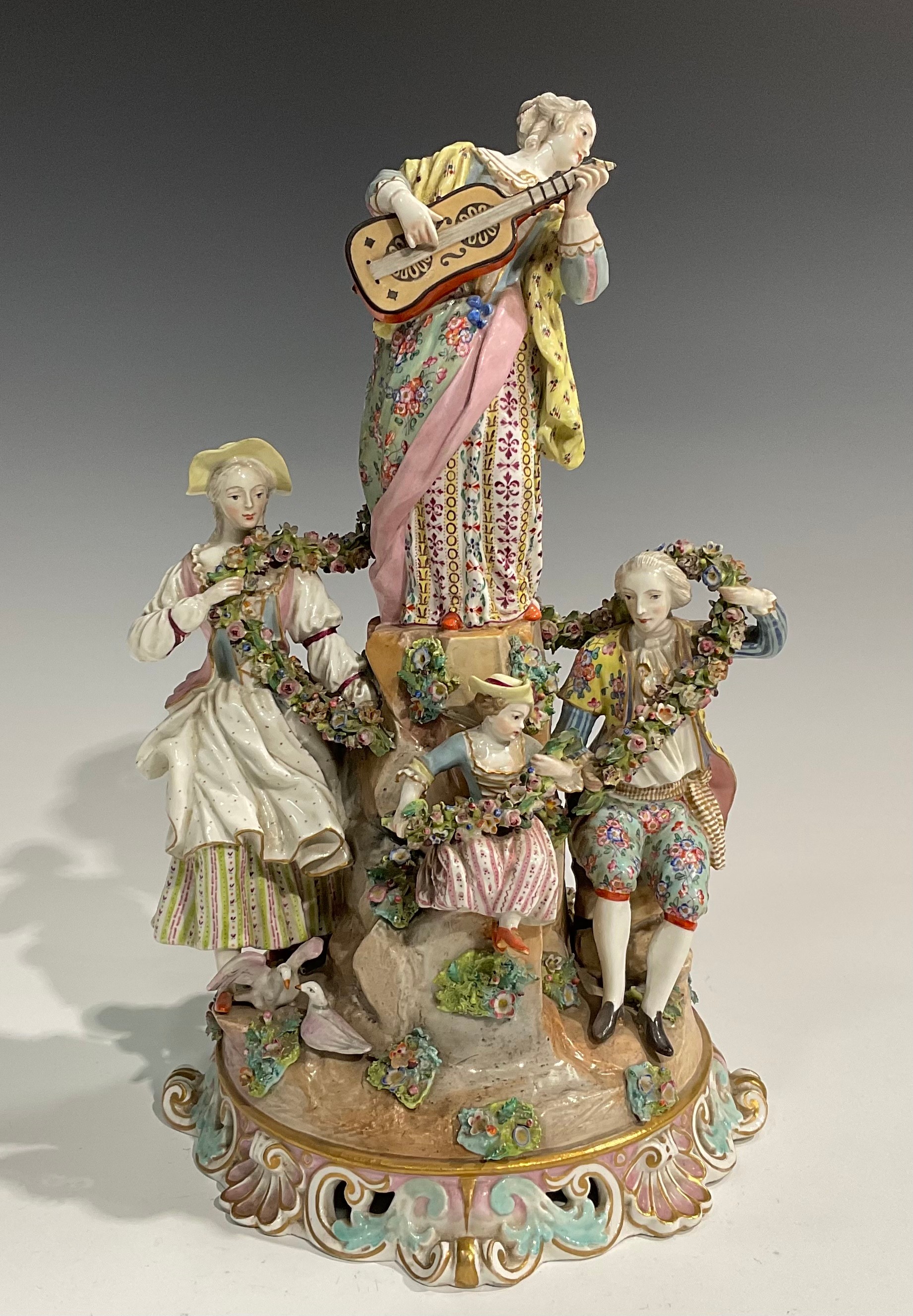 A continental porcelain figure group, of a gentleman and his companion draped in a floral encrusted garland, flanking a female guitarist and young girl and boy on a rocky outcrop, pierced scroll and shell base, crossed swords in underglaze blue, 41cm high