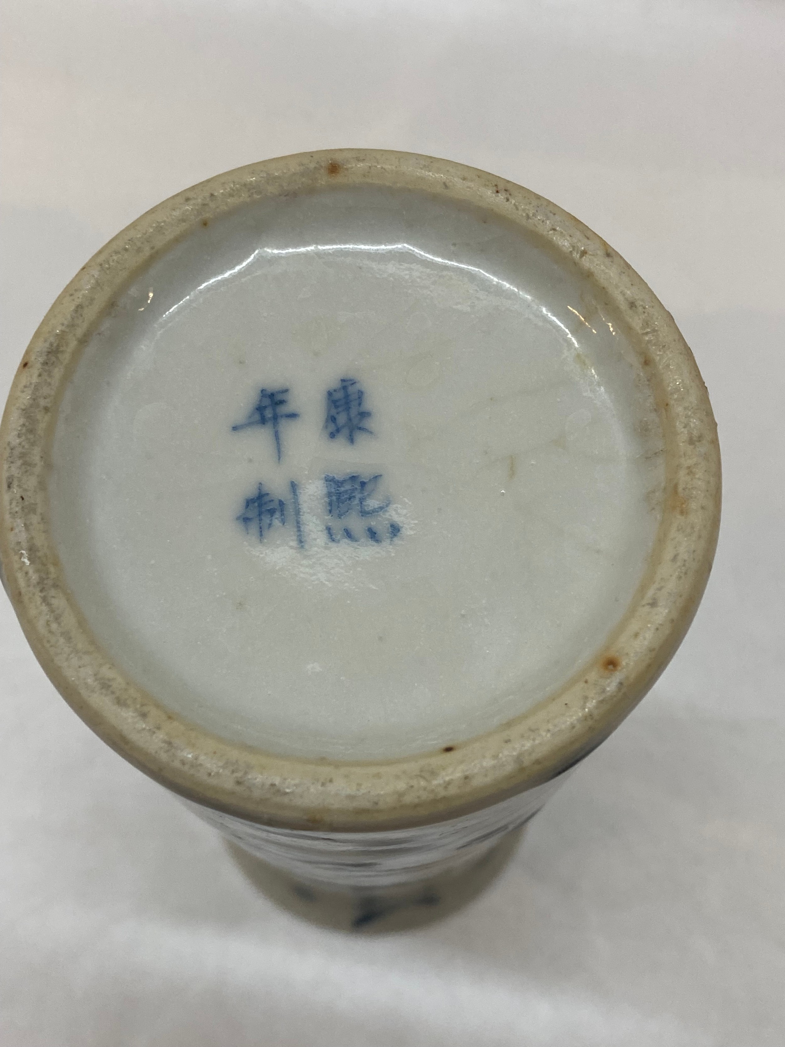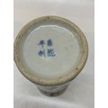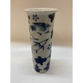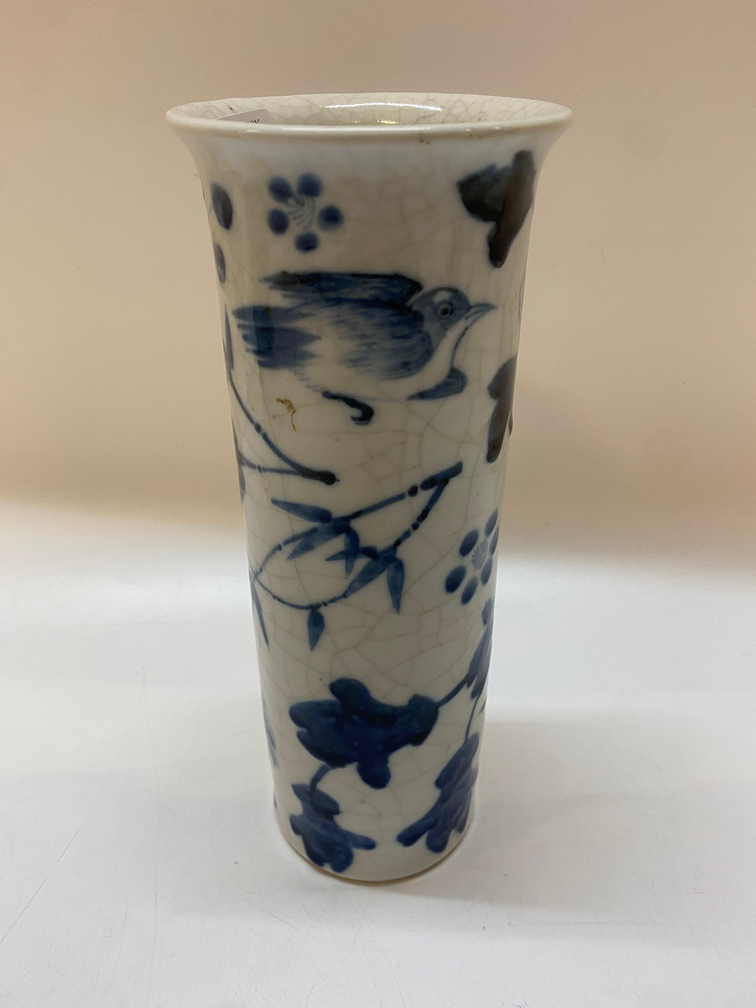 A Chinese cylindrical vase, crackle glazed with blue and white decoration of moths and flowers - 10in. high