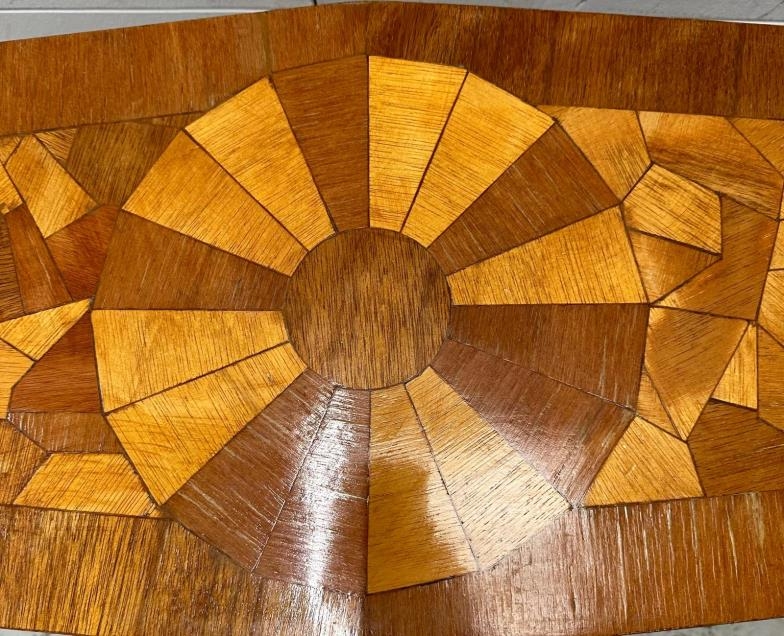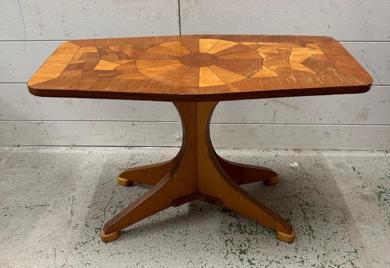 A Mid Century side table with marquetry inlay to top (H42cm W61cm D31cm)