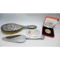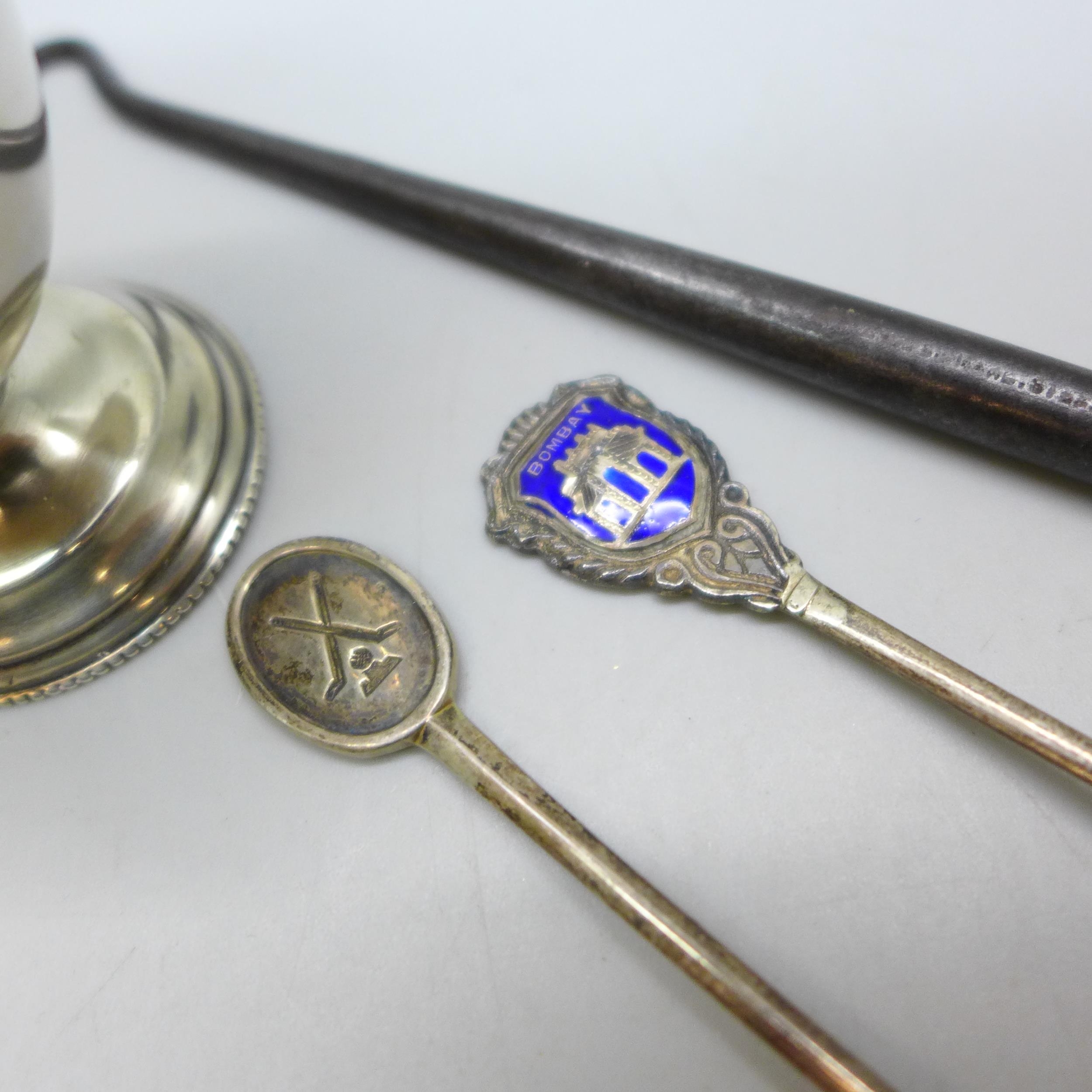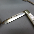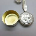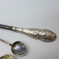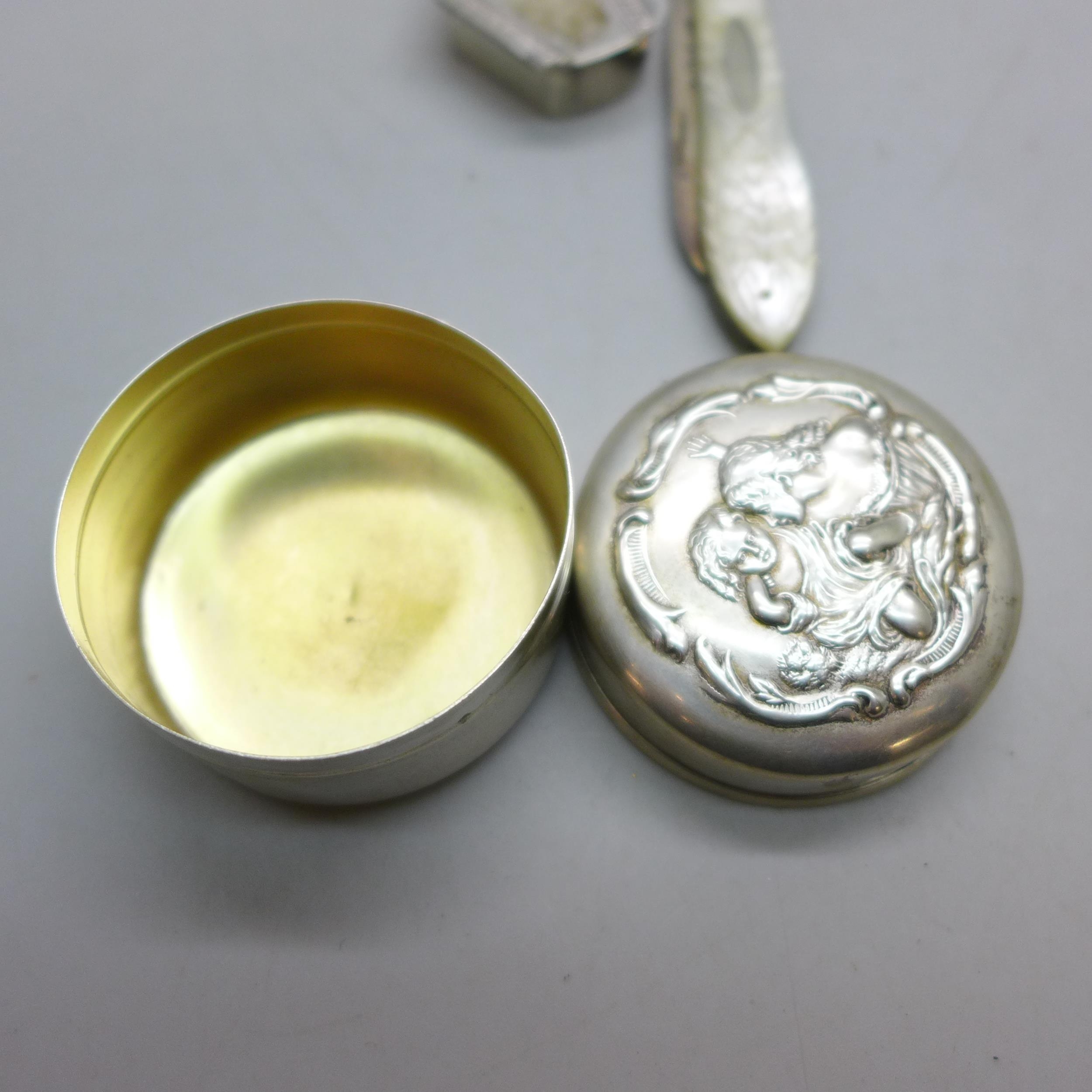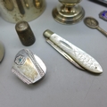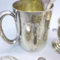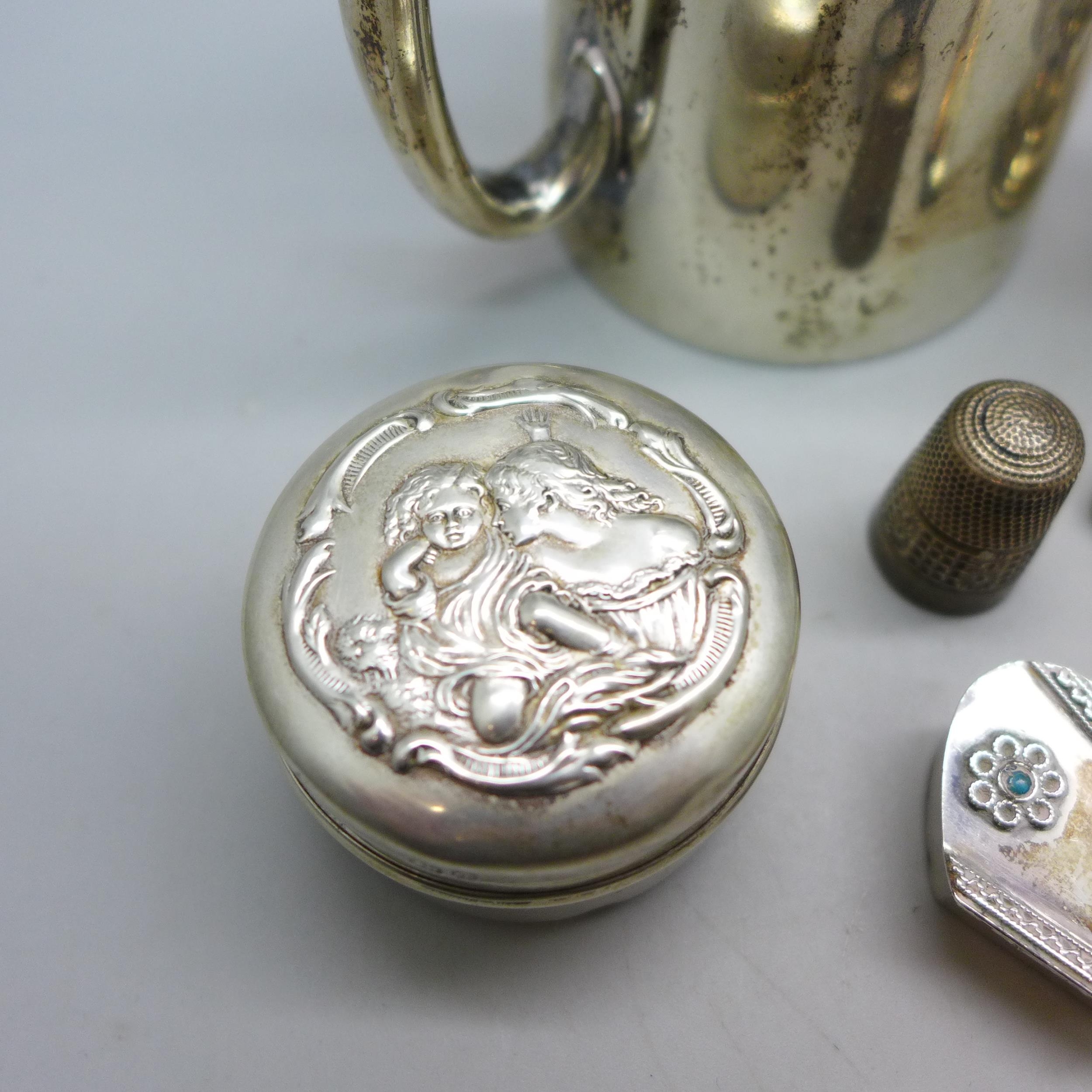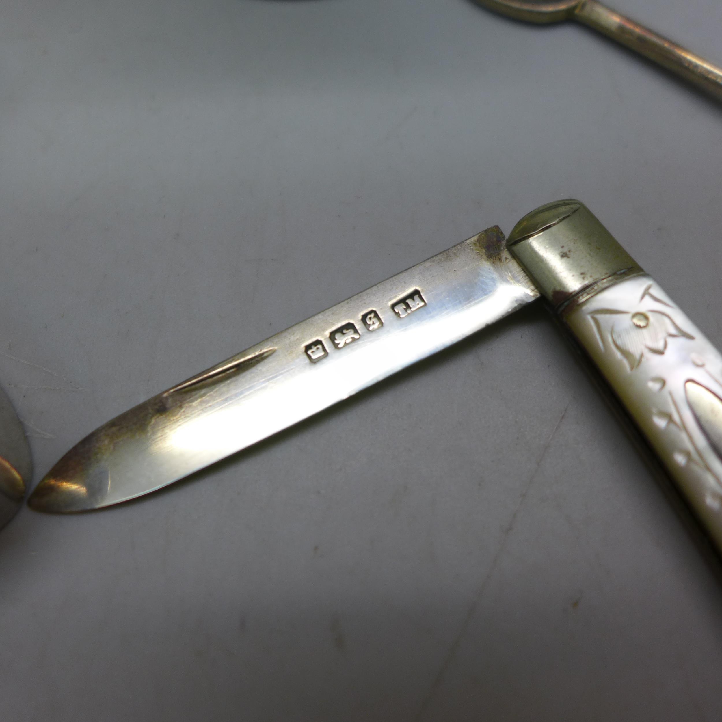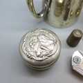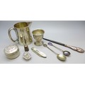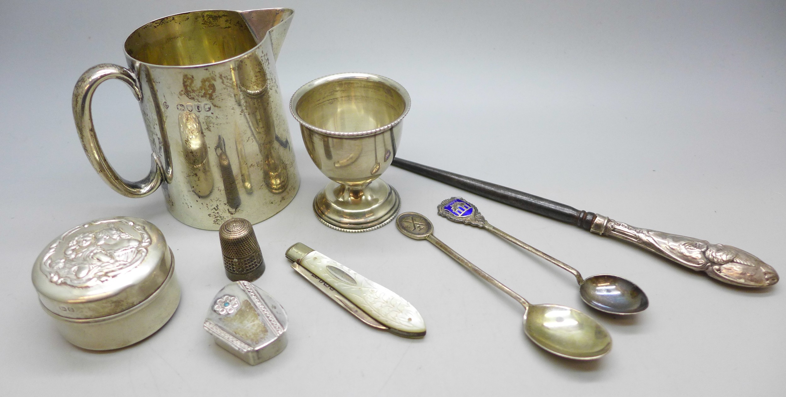 Nine pieces of silver including a Victorian jug, a pot with embossed figures to lid, an egg cup, a silver bladed mother of pearl fruit knife, etc., 195g weighable silver