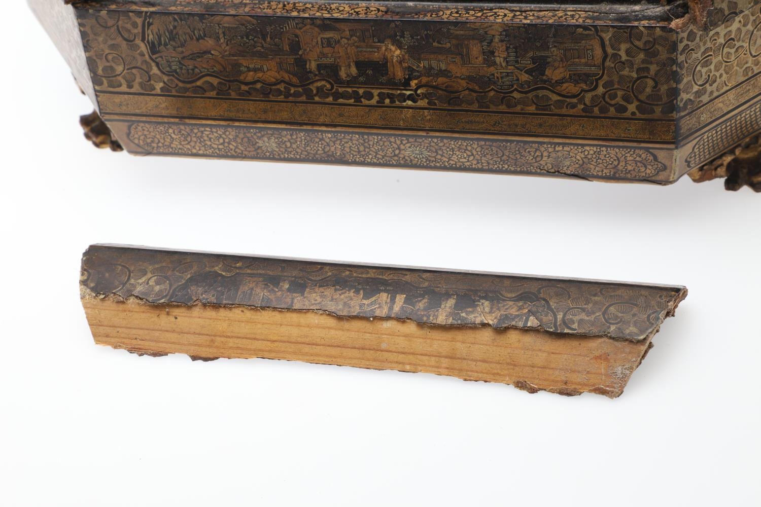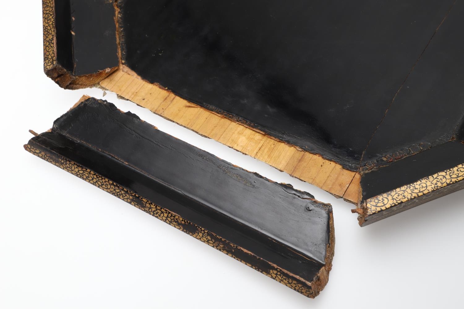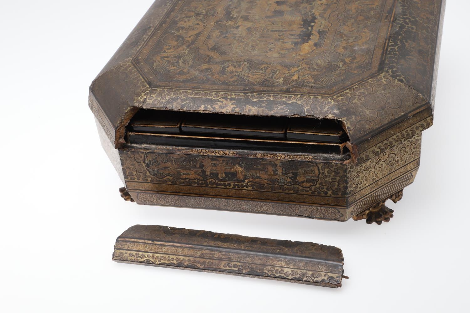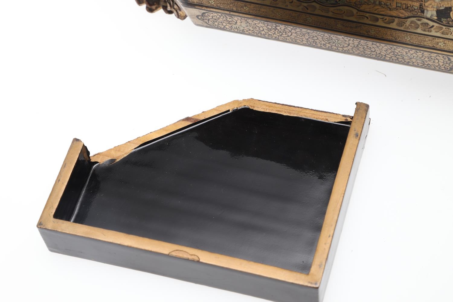 Damage to lid and section needing regluing, surface wear to gilding and lacquer, minor losses.