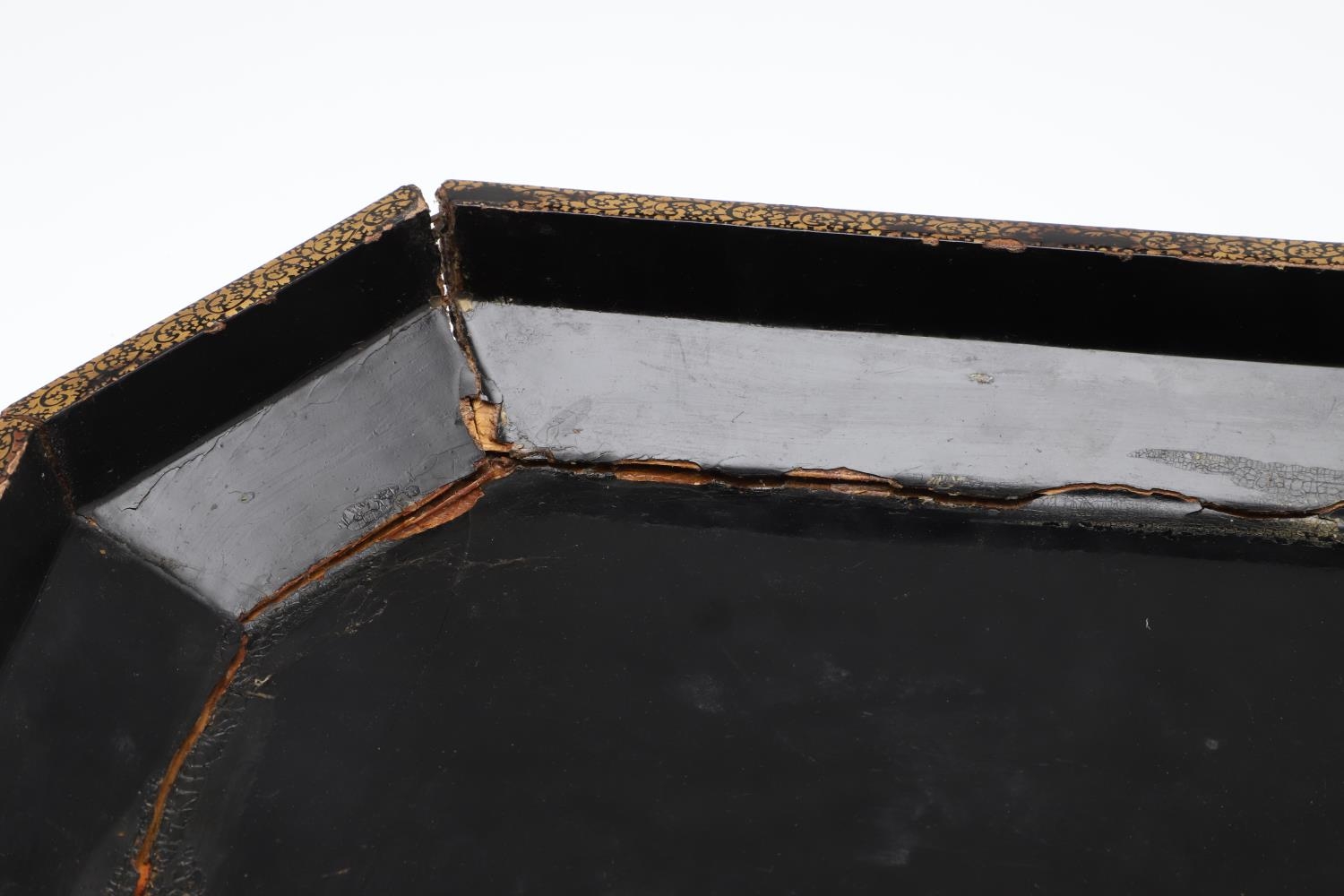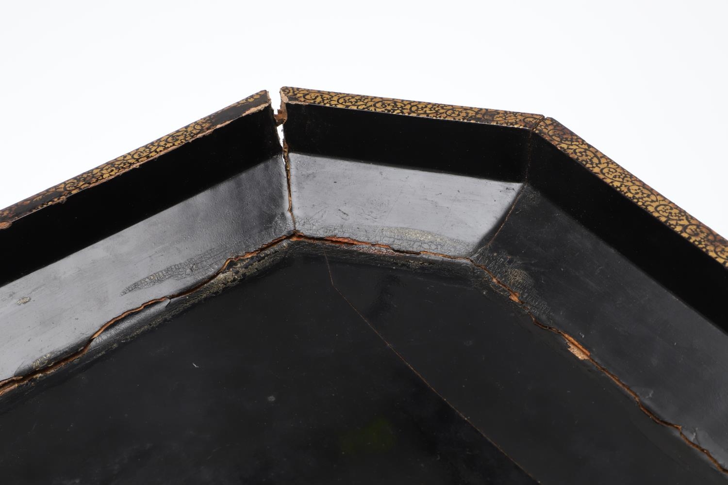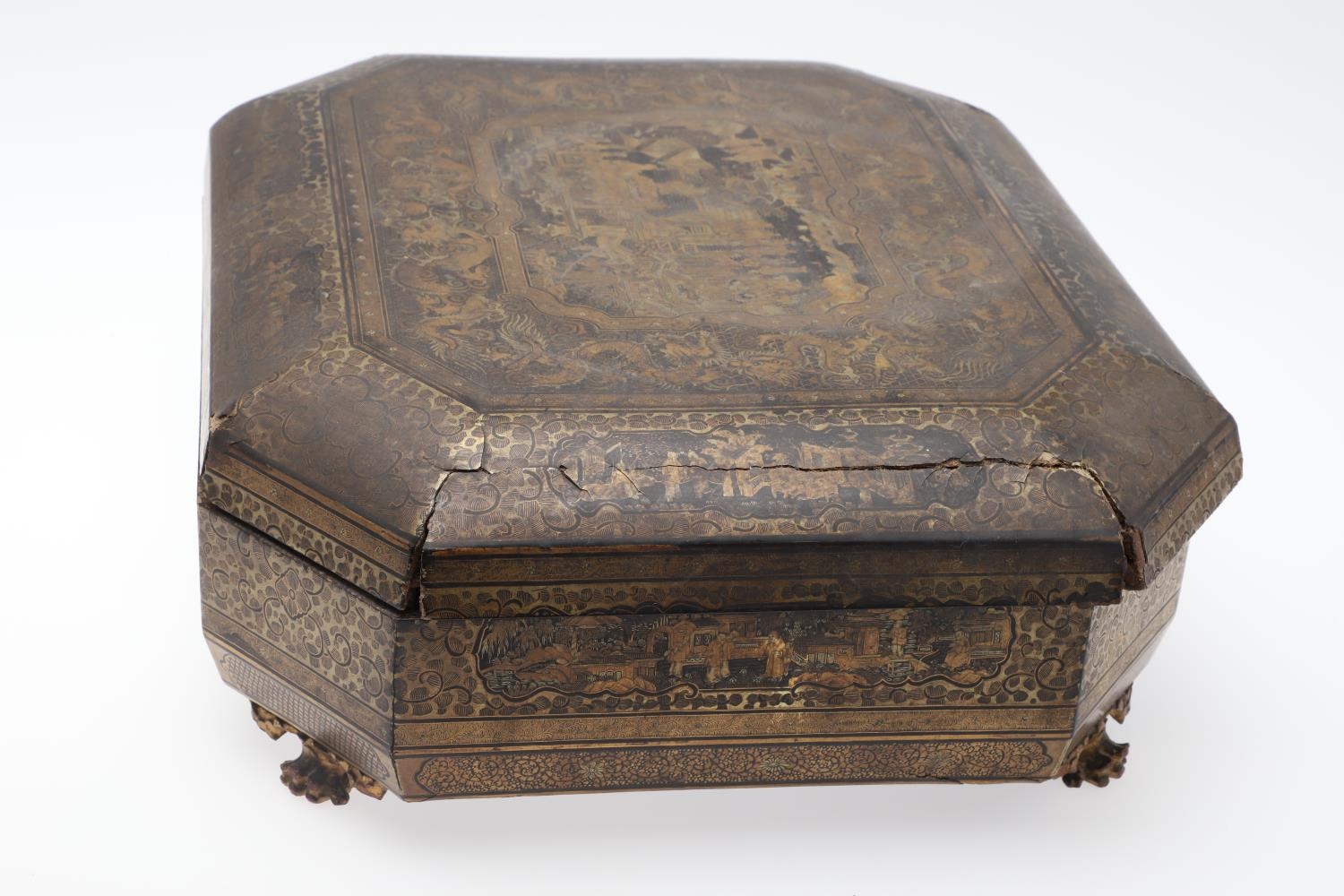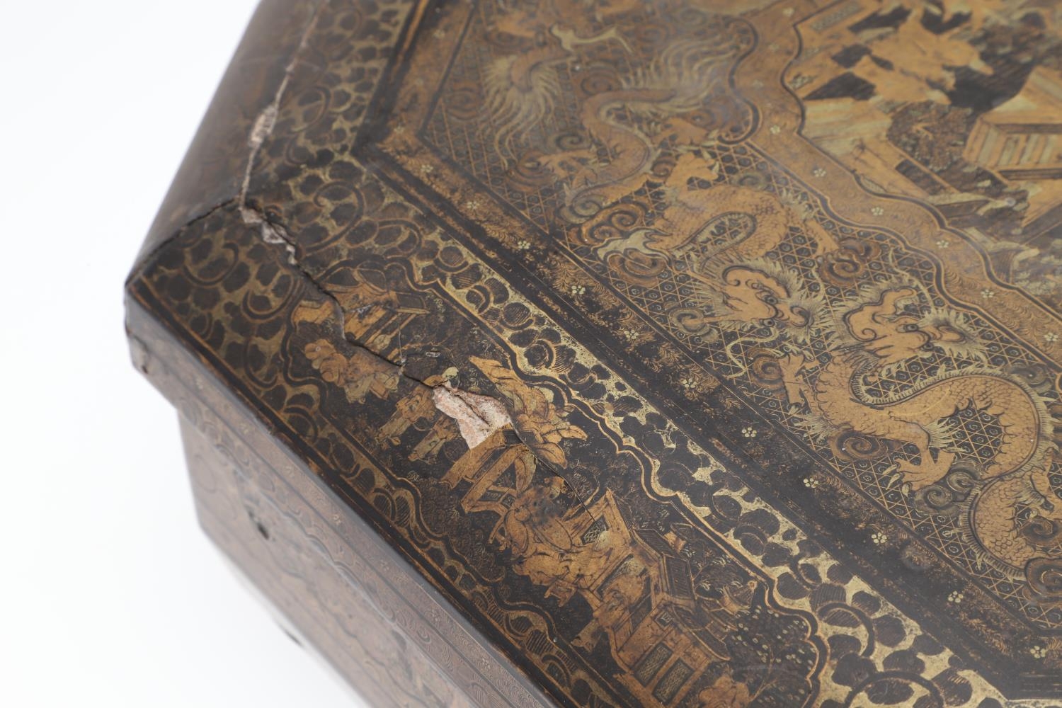 Damage to lid and section needing regluing, surface wear to gilding and lacquer, minor losses.