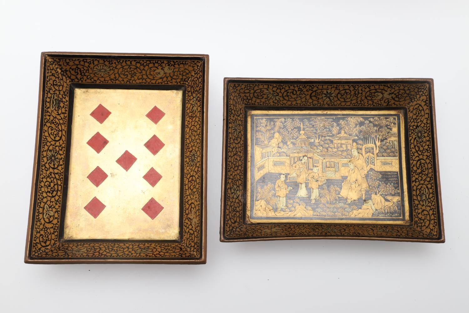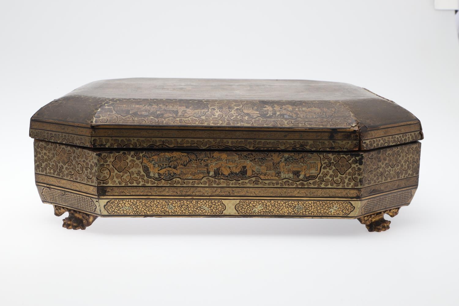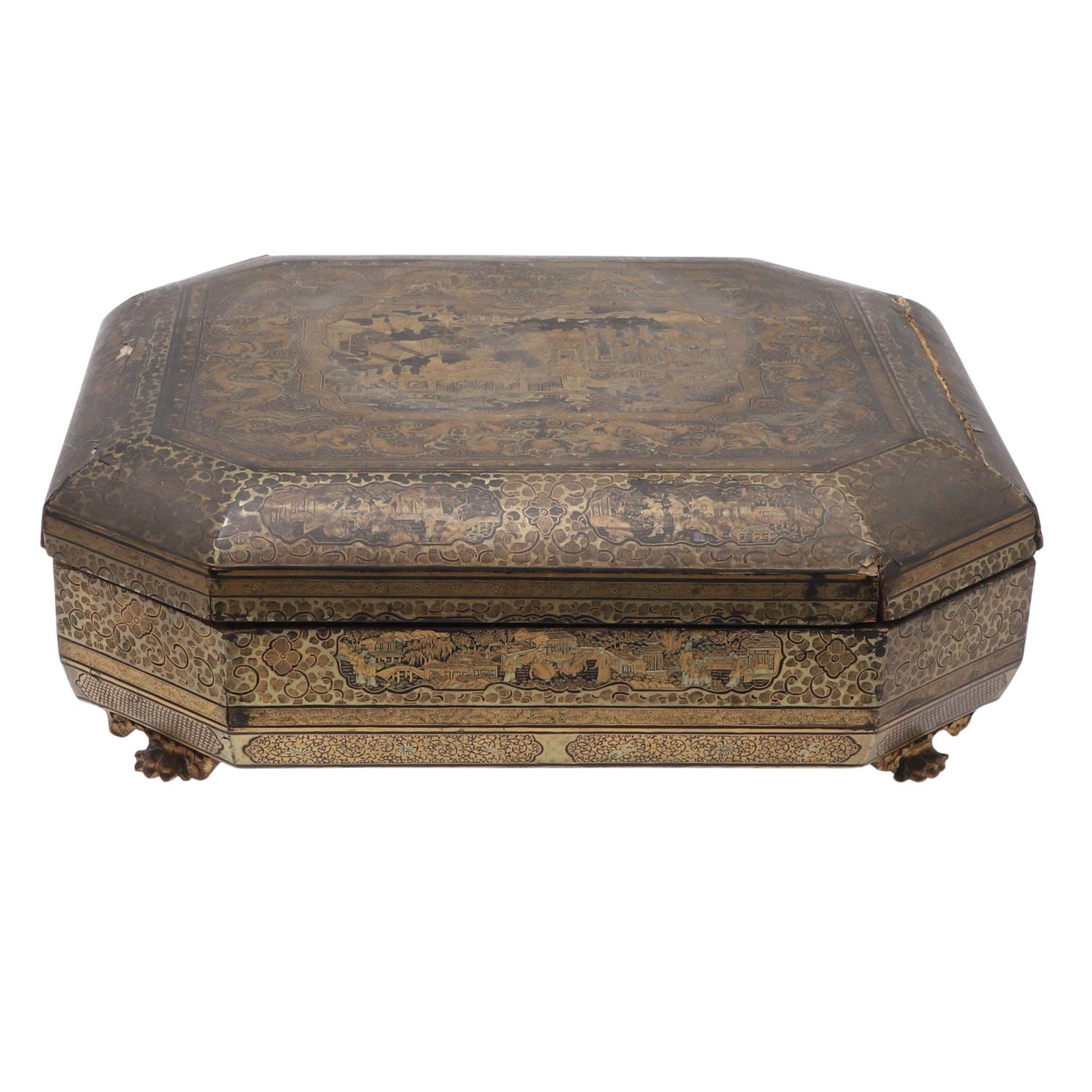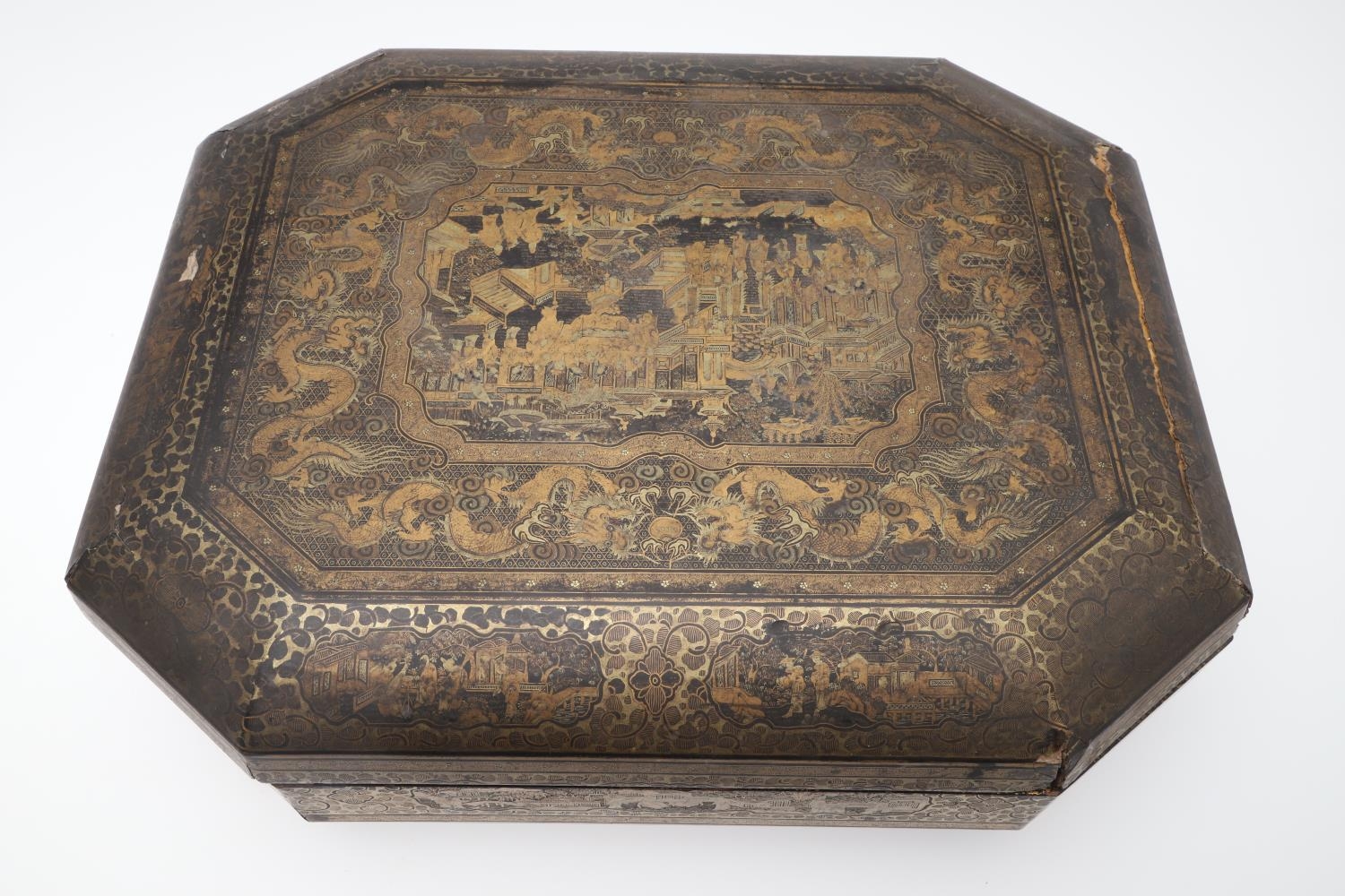 Damage to lid and section needing regluing, surface wear to gilding and lacquer, minor losses.