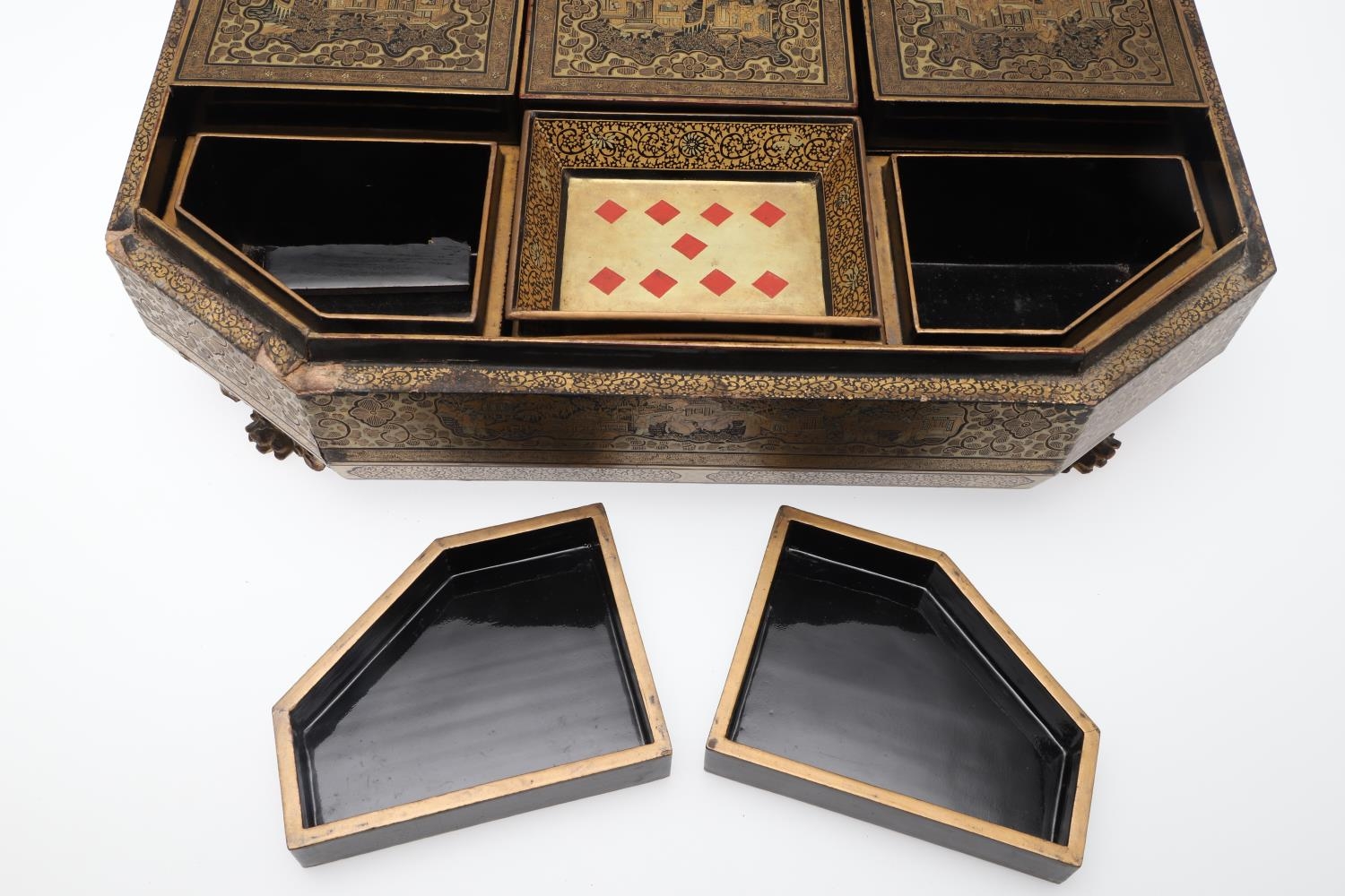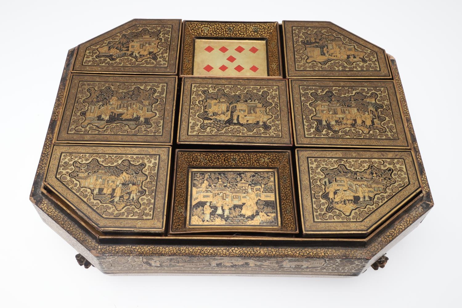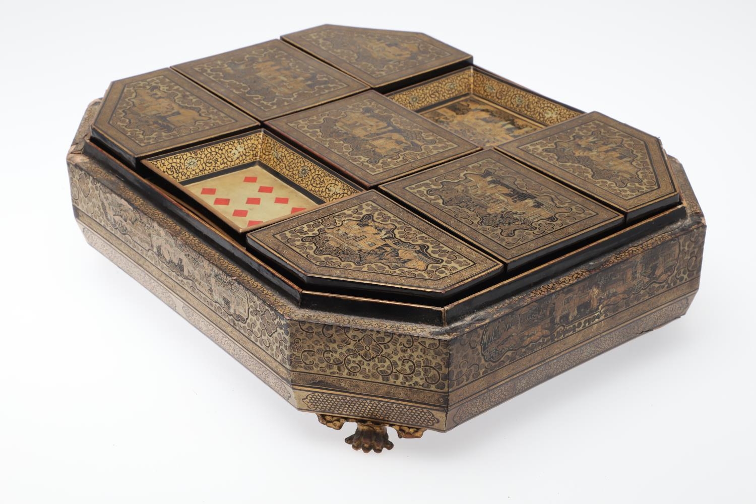 A CHINESE EXPORT LACQUERED GAMES BOX. 19th century, of octagonal form containing seven lidded compartments and six card trays, a few mother of pearl playing counters and a quantity of hand-written notes in Chinese and English, on carved paw feet, height 13cm, width 37cm, depth 31cm.
