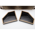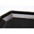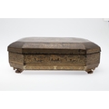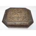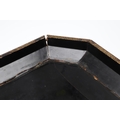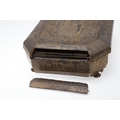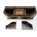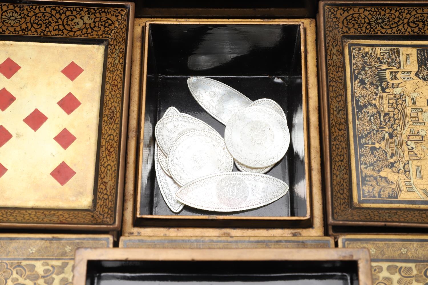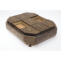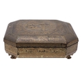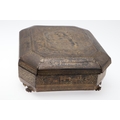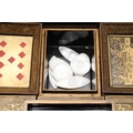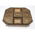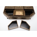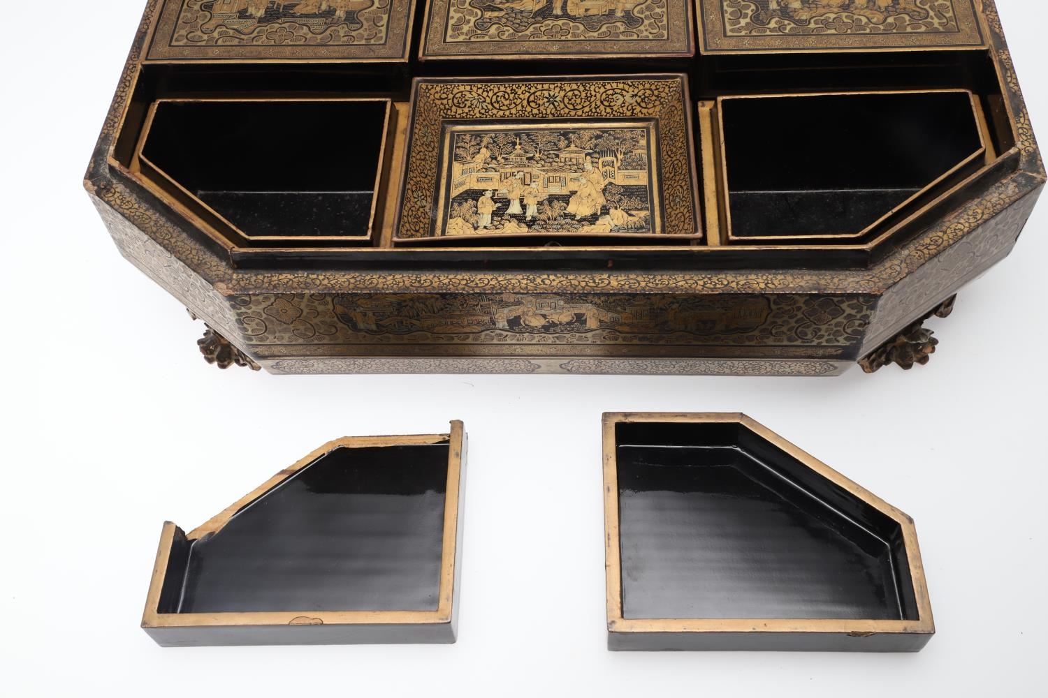 A CHINESE EXPORT LACQUERED GAMES BOX. 19th century, of octagonal form containing seven lidded compartments and six card trays, a few mother of pearl playing counters and a quantity of hand-written notes in Chinese and English, on carved paw feet, height 13cm, width 37cm, depth 31cm.