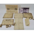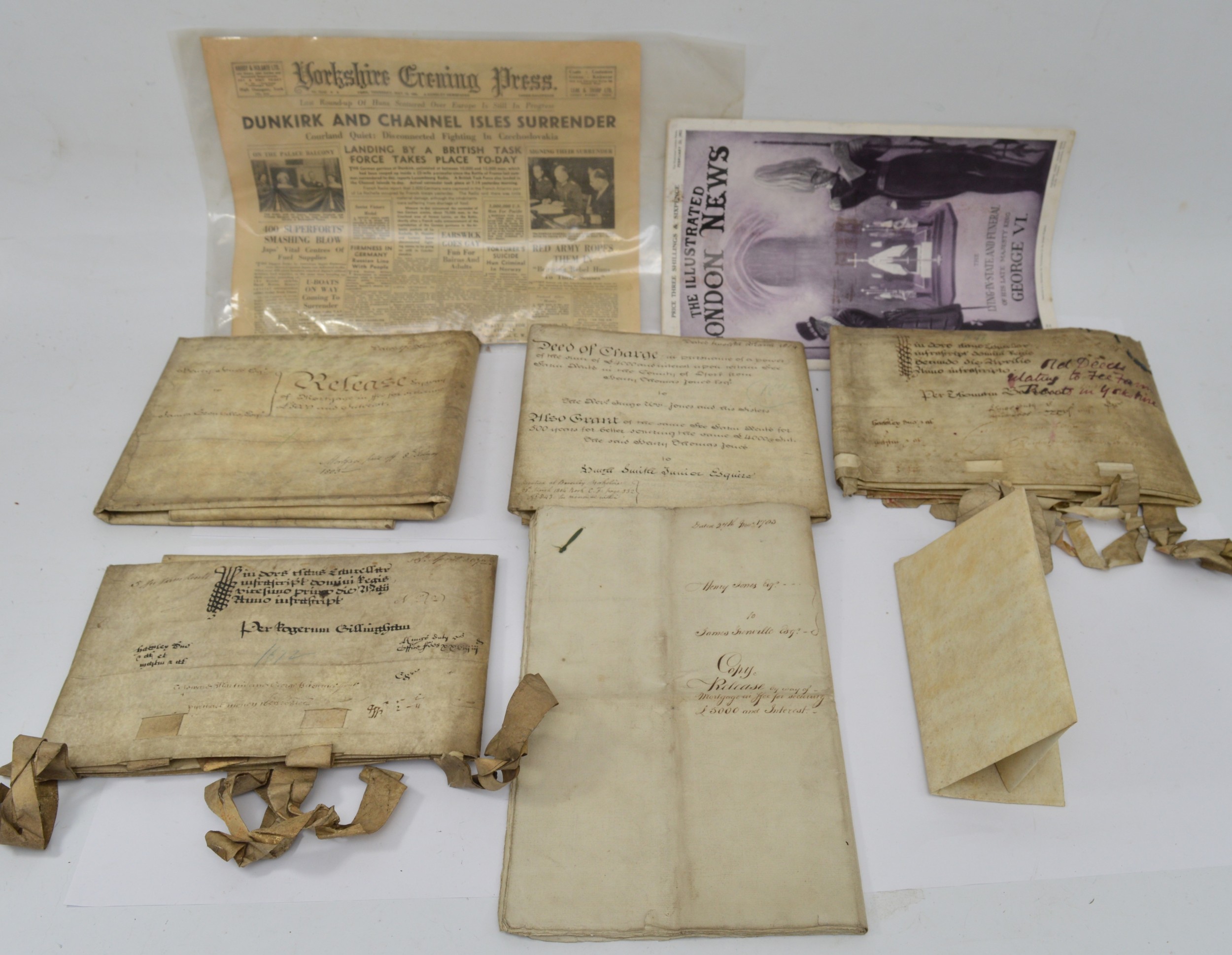 A 17th century Gillingham land deed parchment dated 16th April 1672, a 17th century Yorkshire farm land deed parchment dated 2nd April 1672, a 18th century land deed parchment dated 27th November 1703 between Henry Jones Esq and James Grenville Esq, a copy of the Illustrated London News dated February 23rd 1952 No.5888 volume 220 also, a copy of Yorkshire Evening Press, York dated Thursday 10th May 1945 No. 19,545. (8).
